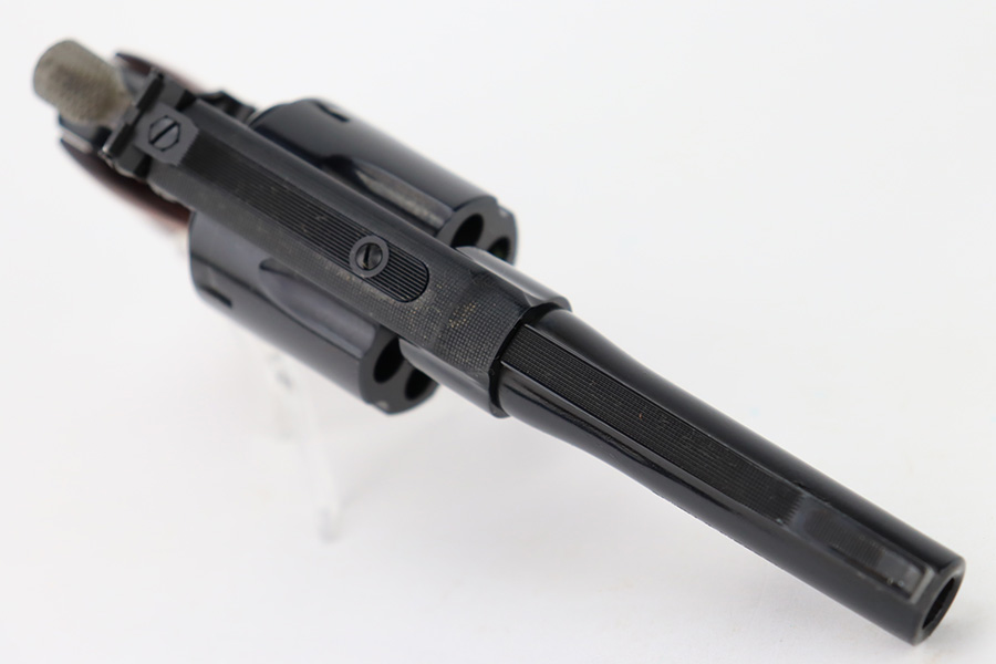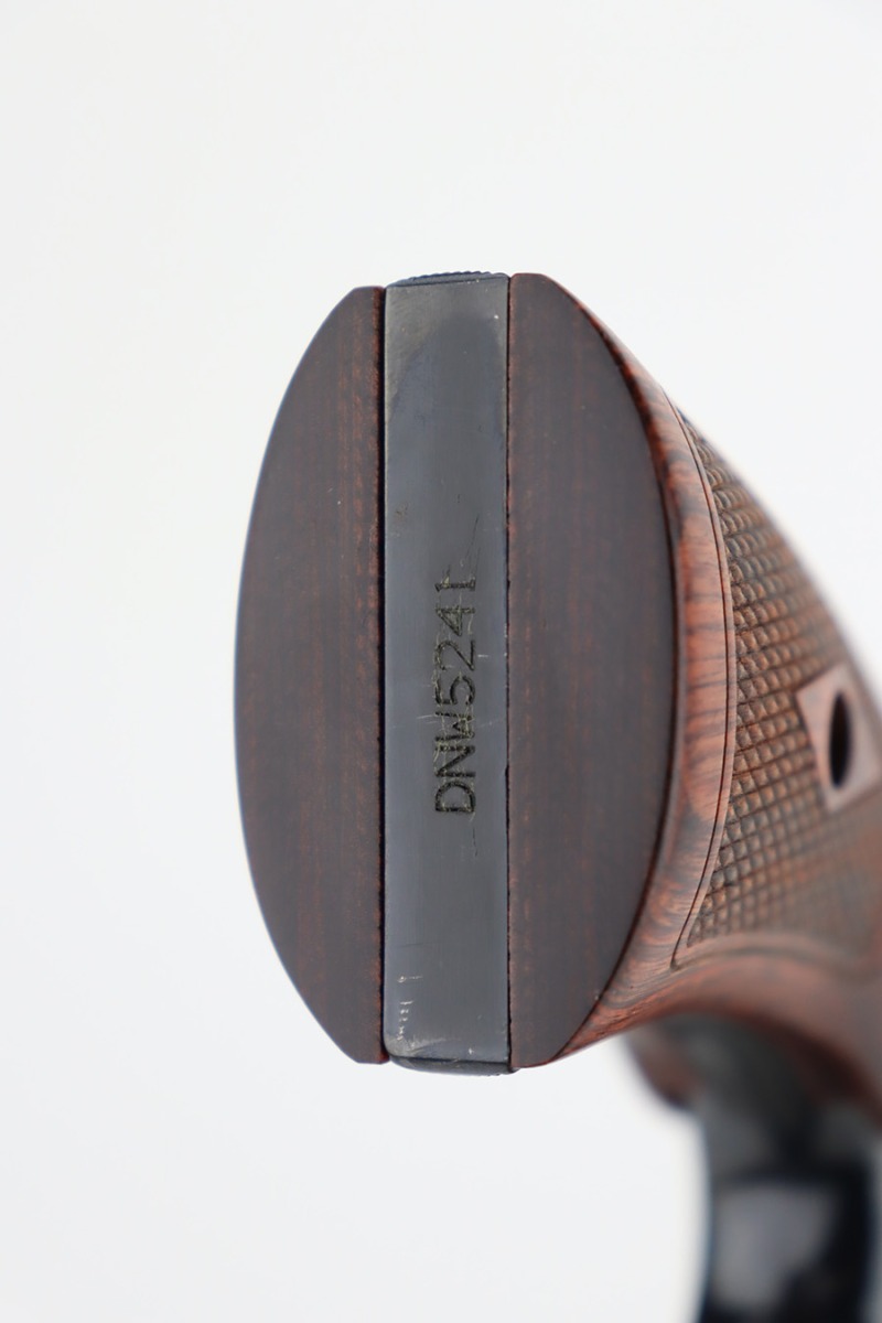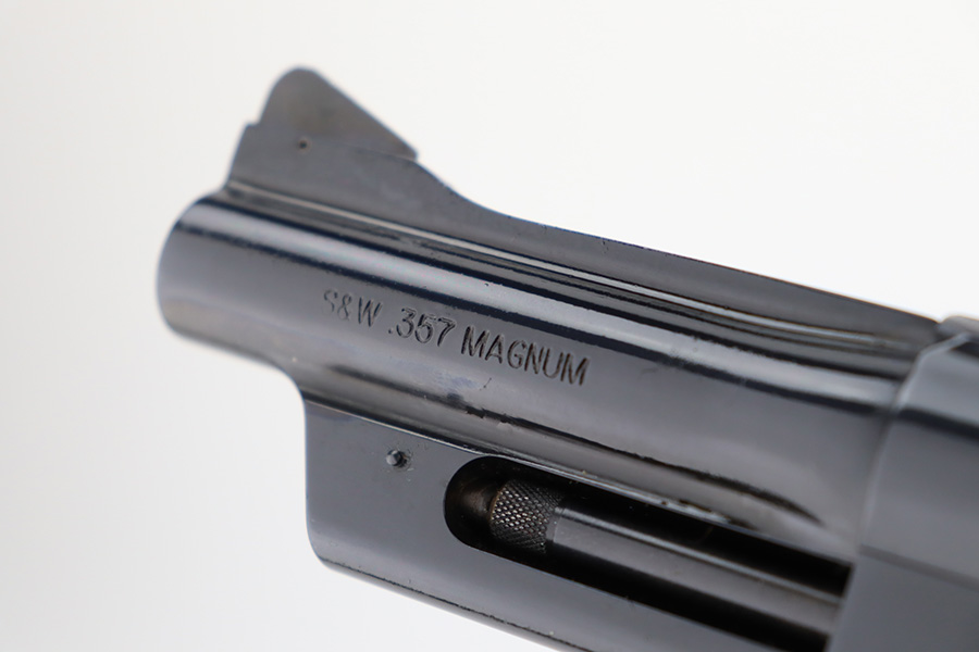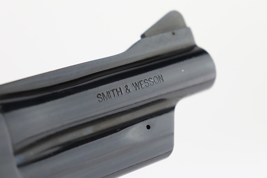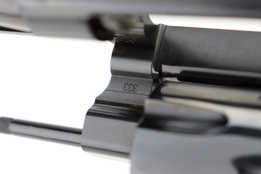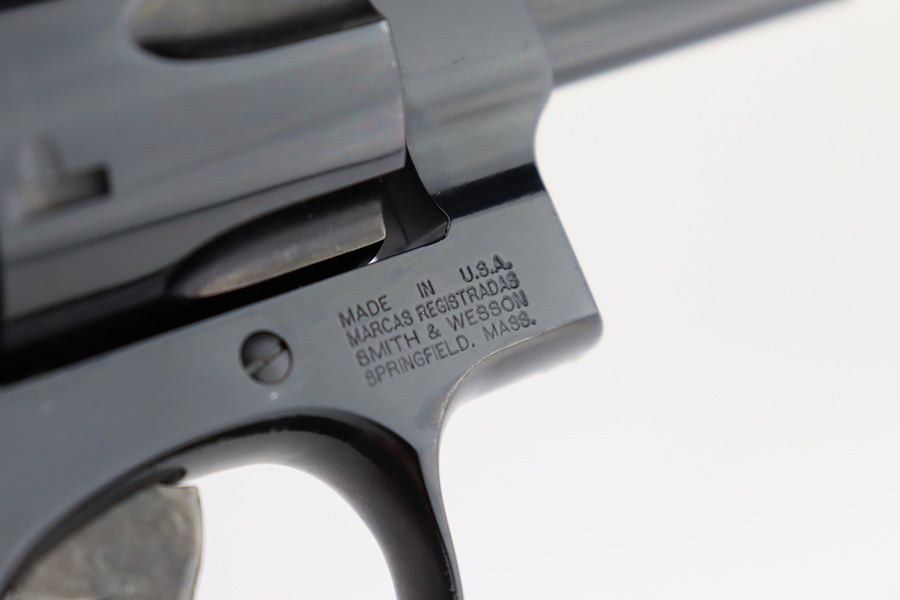12/14/23 – This is a near-mint example of a Smith & Wesson Model 27-9, chambered in .357 Magnum. 4″ barrel. The original high polish finish rates about 98% with just one small spot of wear on the underside of the trigger guard. Just a hint of a roll mark on the cylinder. Fitted with beautiful checkered wood grips. Mint bore.