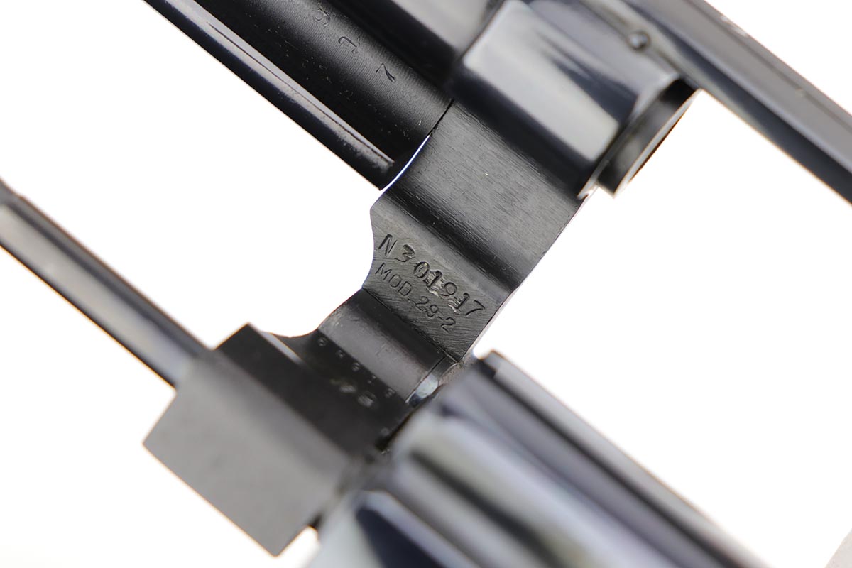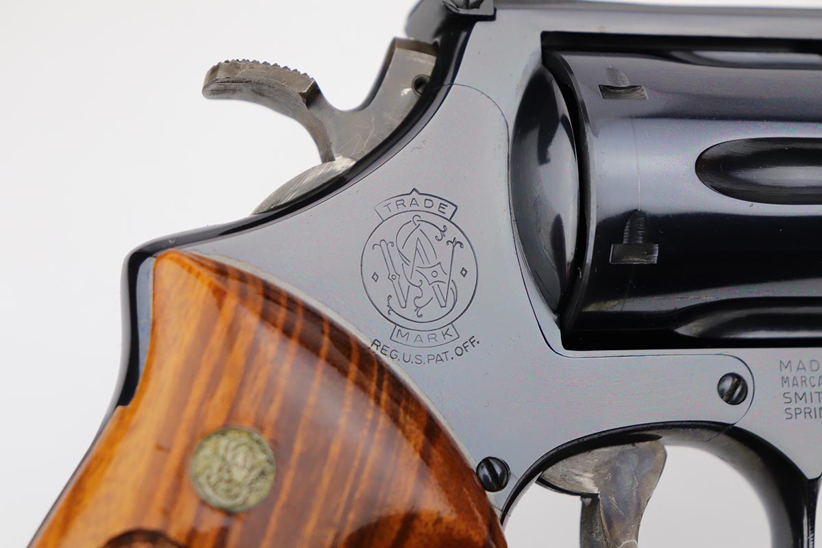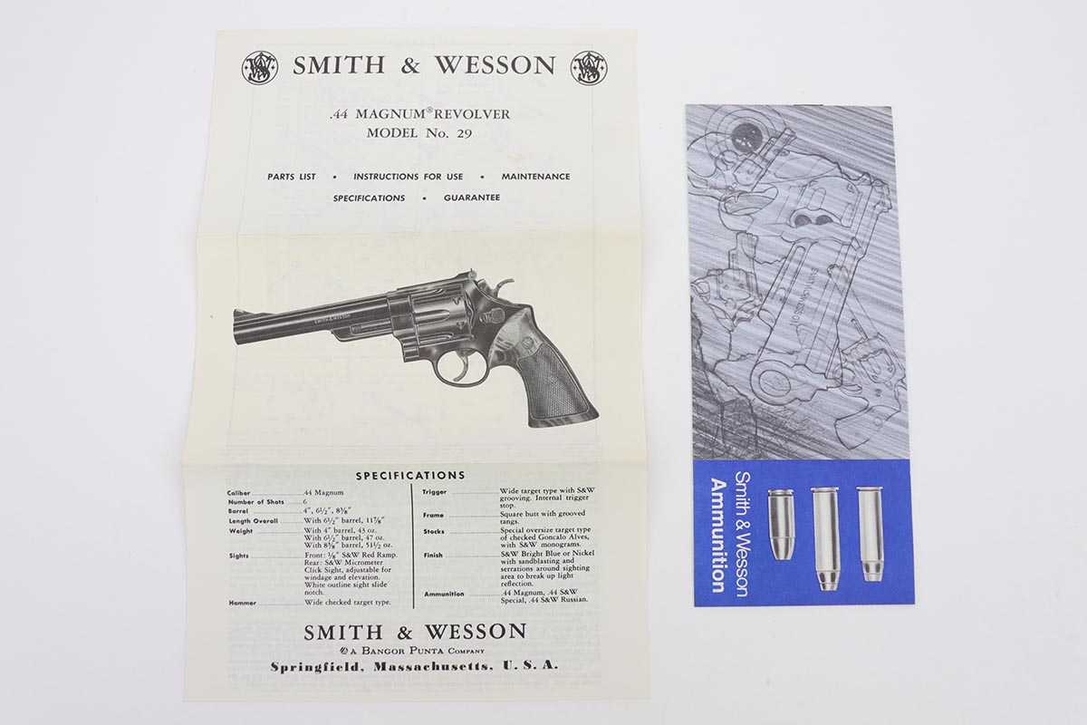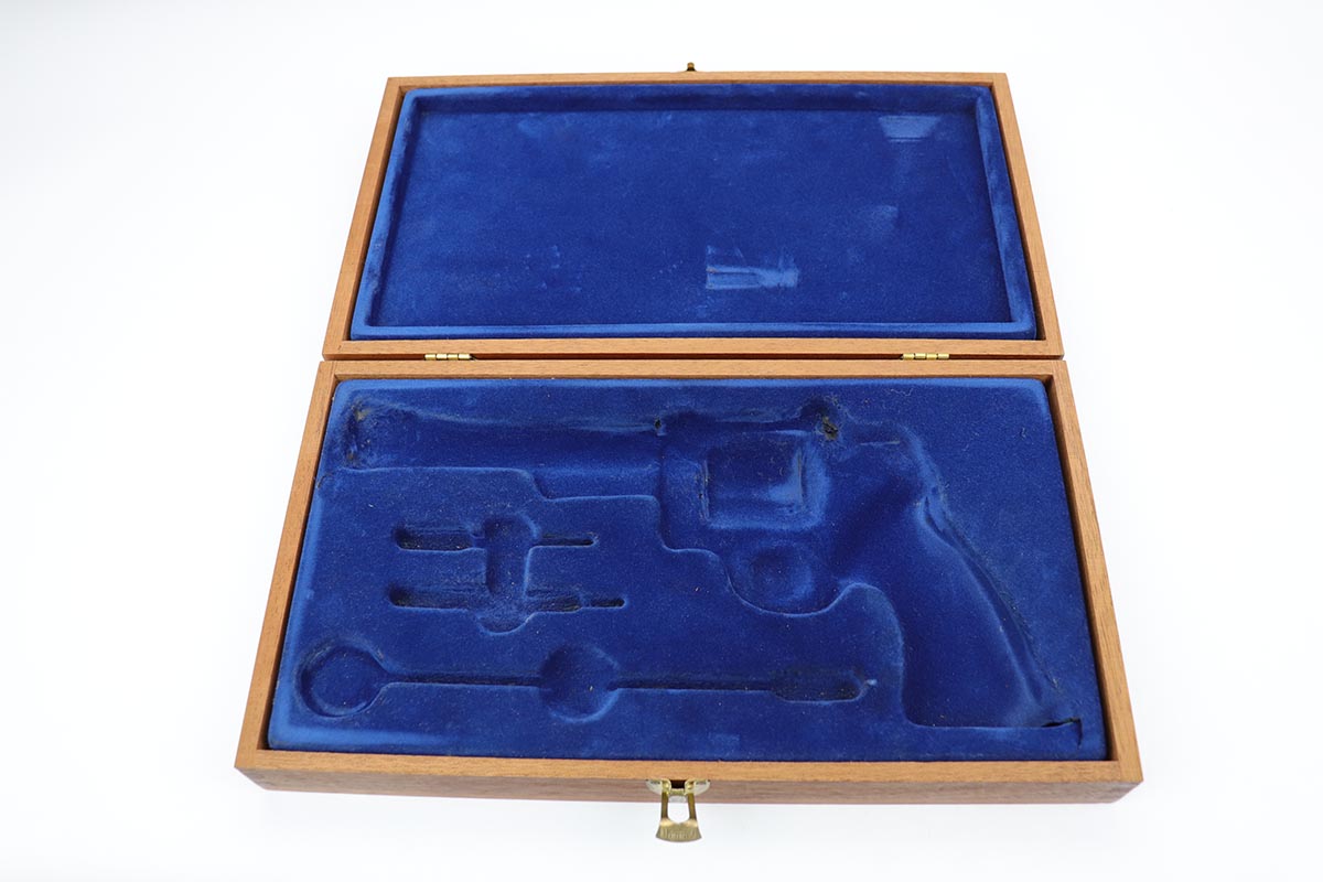 10/15/19 – This is a near-mint Smith & Wesson Model 29-2 revolver in the original display case. Serial dates the gun to 1975, and it almost looks like it was made yesterday. There’s just a minor roll mark on the cylinder and maybe a tiny hint of ‘box wear’. Perfect timing/action. Beautiful grips and case hardening on the trigger and hammer. Mint bore. Several of the original Smith & Wesson documents are present, too.