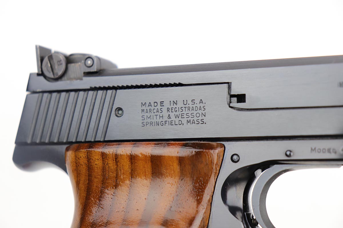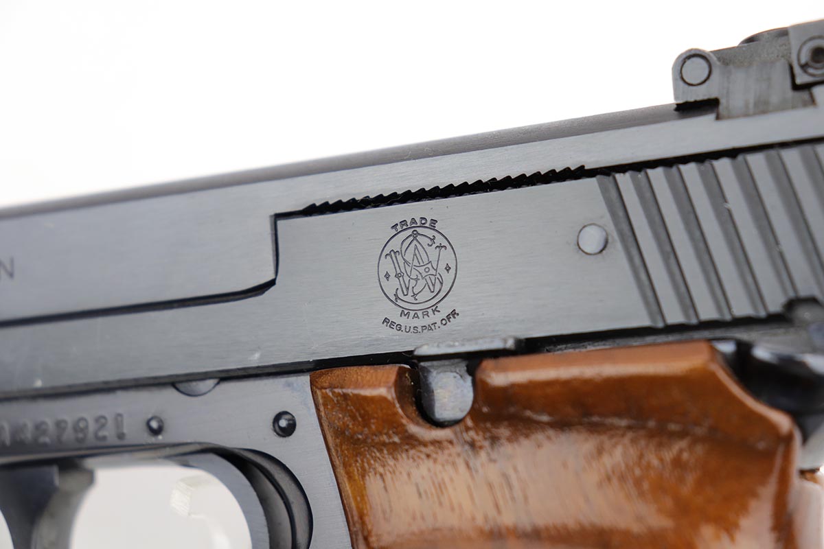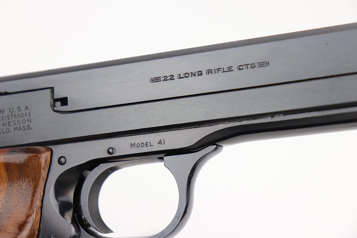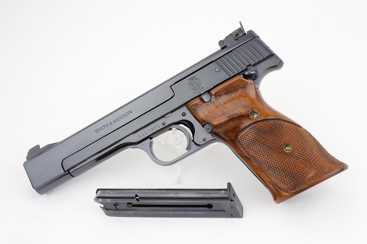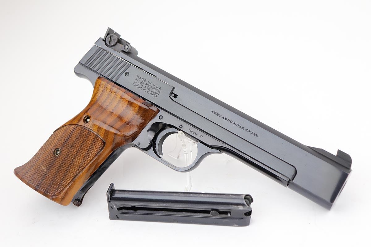 11/7/19 – This is an original Smith & Wesson Model 41-1 in near-mint condition. Made in about 1977, the pistol has 99+% blue remaining with only a couple minor scuffs on the left side. Desirable variation that still has cocking indicator pin. 5.5 inch heavy barrel with the extended front sight. Minty grips and bore. Correct magazine. FFL required.