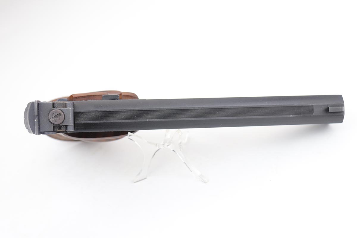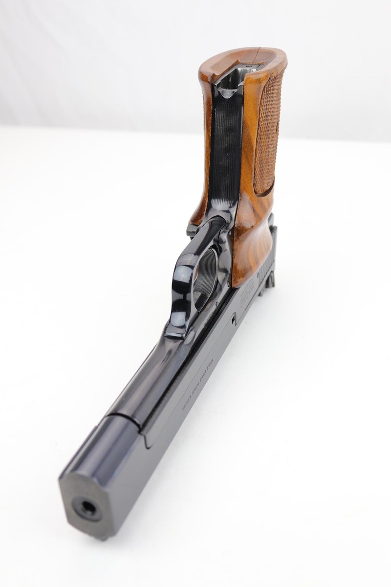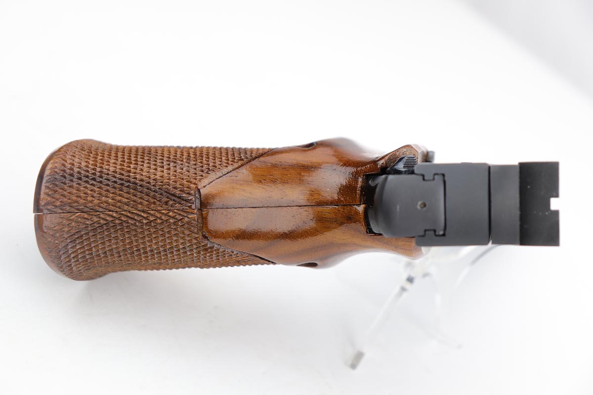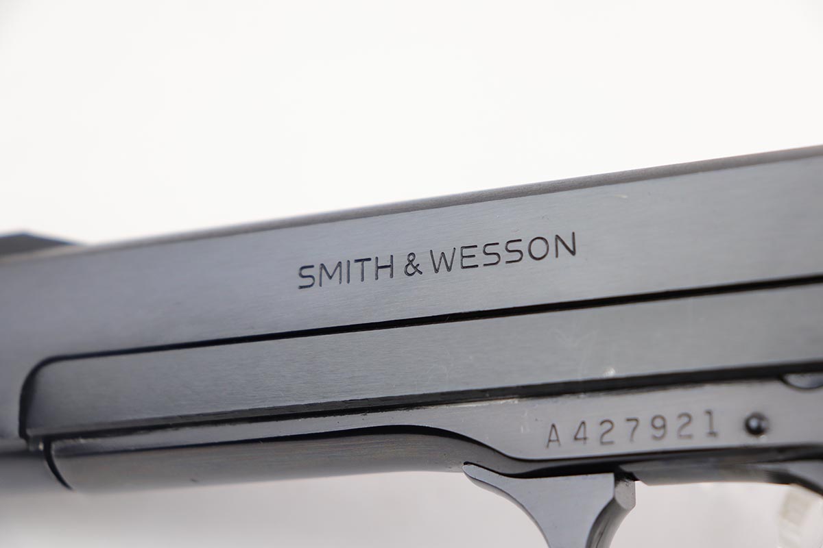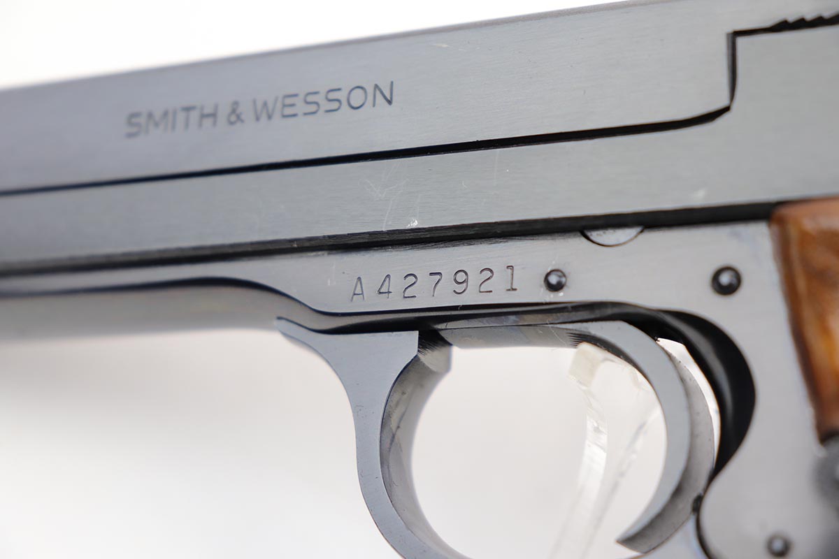 11/7/19 – This is an original Smith & Wesson Model 41-1 in near-mint condition. Made in about 1977, the pistol has 99+% blue remaining with only a couple minor scuffs on the left side. Desirable variation that still has cocking indicator pin. 5.5 inch heavy barrel with the extended front sight. Minty grips and bore. Correct magazine. FFL required.