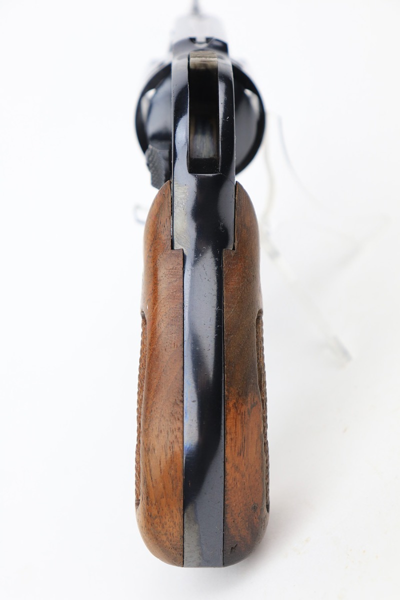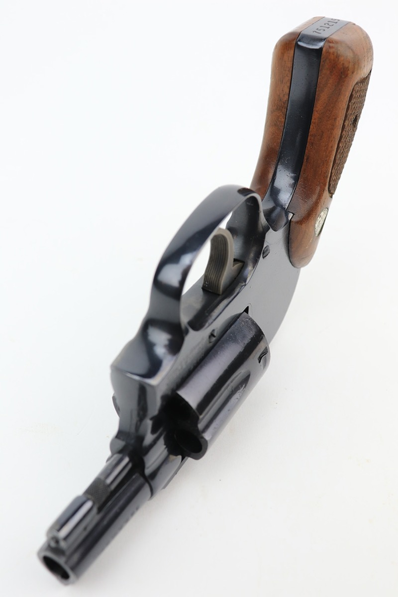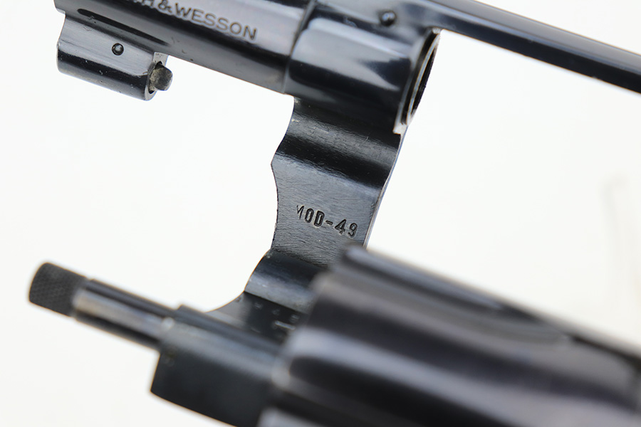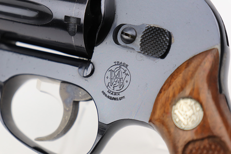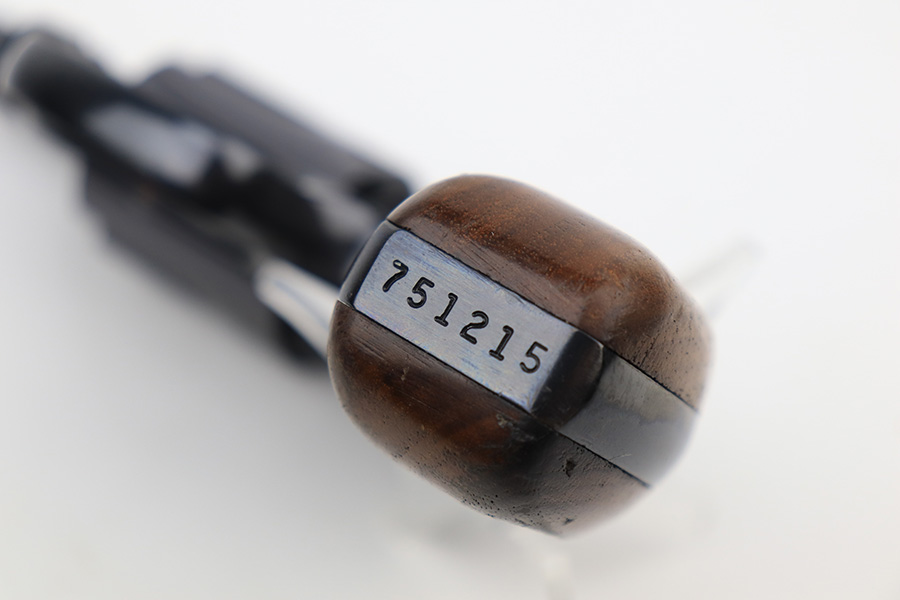 4/19/23 – This is a near-mint example of a Smith & Wesson Model 49 revolver, manufactured in 1969 and chambered in .38 Special. 2″ barrel. The gun is all matching and has retained nearly all of its original high polish finish. There is just a very light roll mark on the cylinder and some very light freckling on the grip straps. Excellent case-hardening on the hammer and trigger. Comes with excellent hand-checkered Walnut grips. Mint bore.