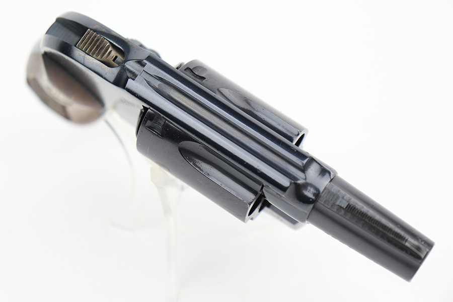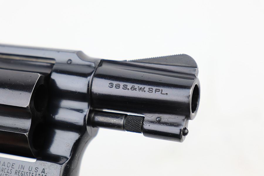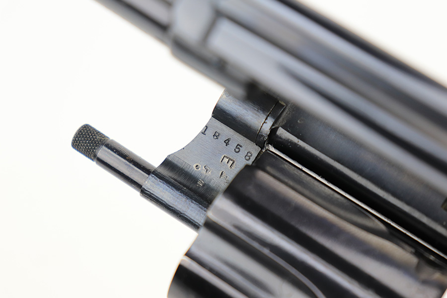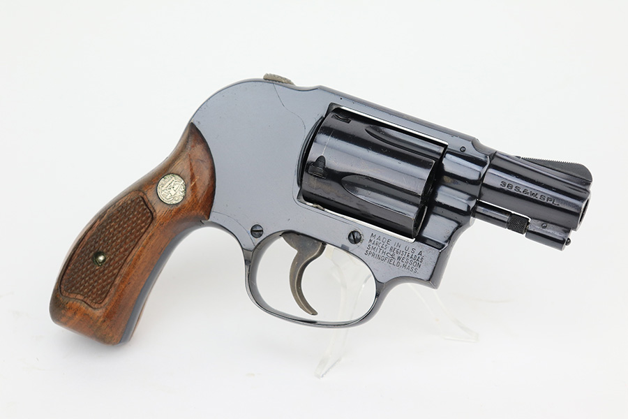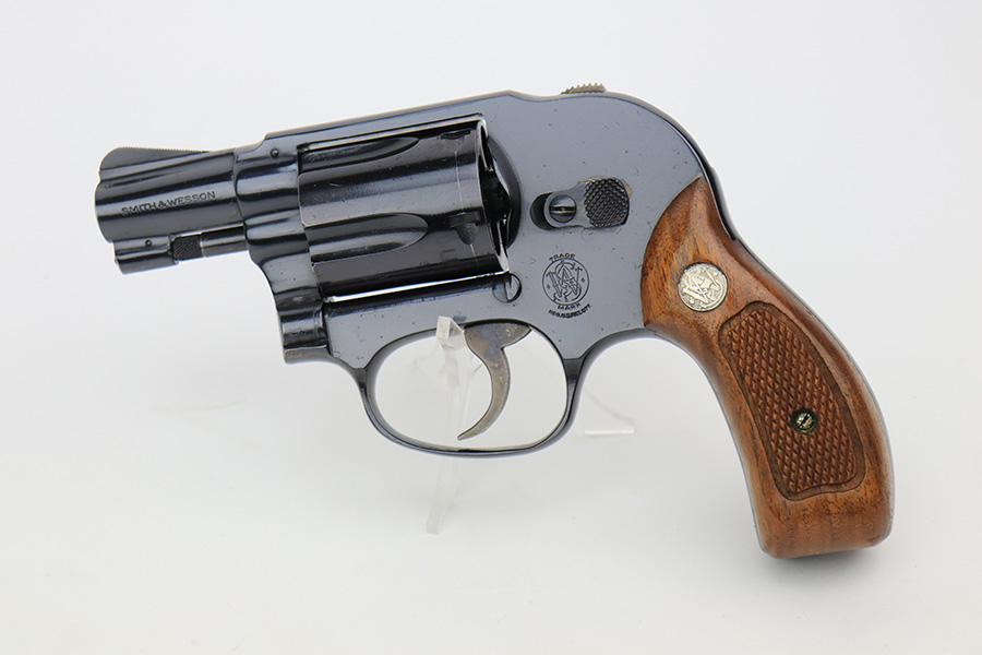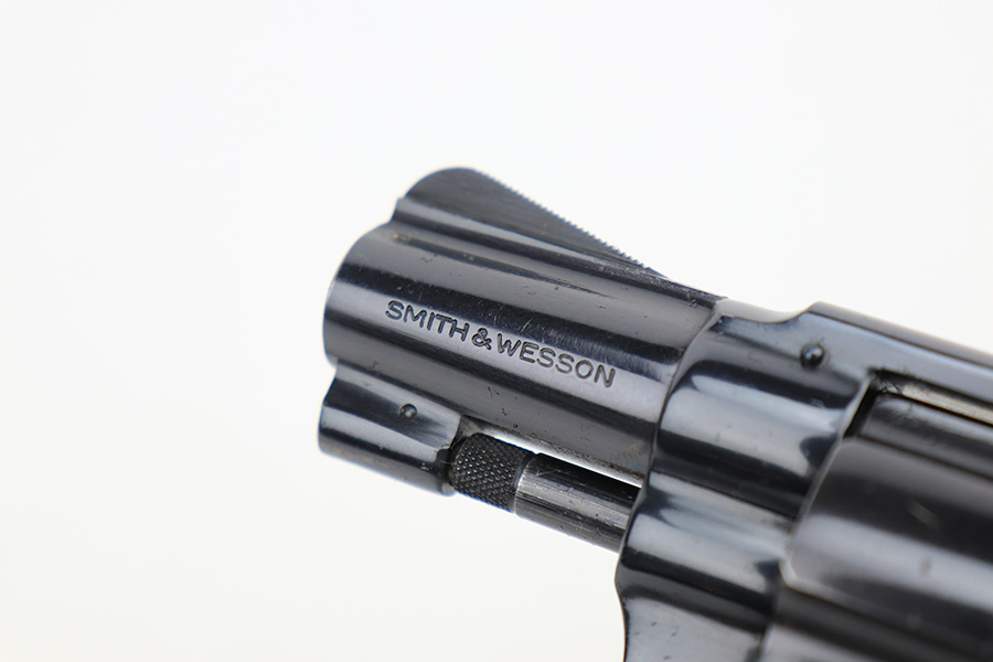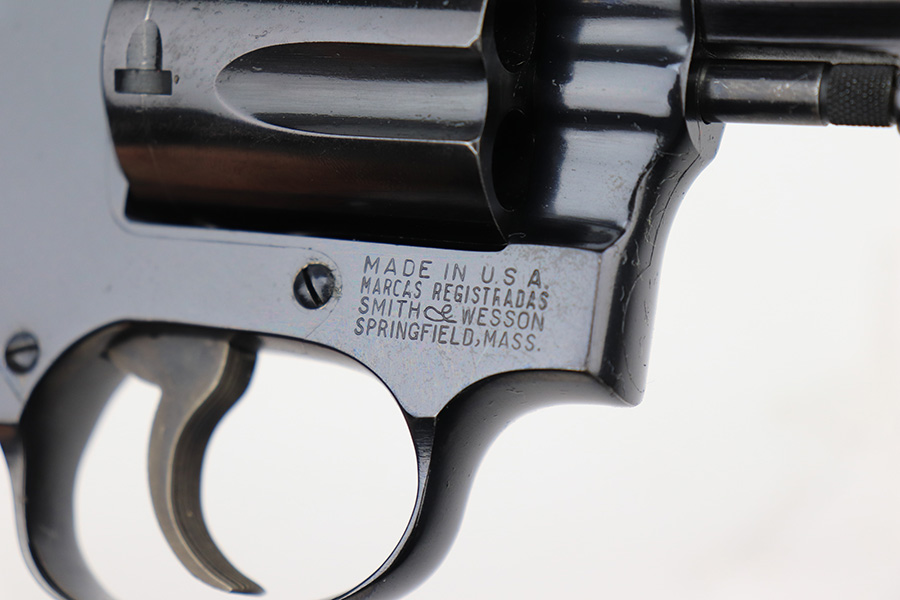 4/19/23 – This is a near-mint example of a Smith & Wesson Model 49 revolver, manufactured in 1969 and chambered in .38 Special. 2″ barrel. The gun is all matching and has retained nearly all of its original high polish finish. There is just a very light roll mark on the cylinder and some very light freckling on the grip straps. Excellent case-hardening on the hammer and trigger. Comes with excellent hand-checkered Walnut grips. Mint bore.
