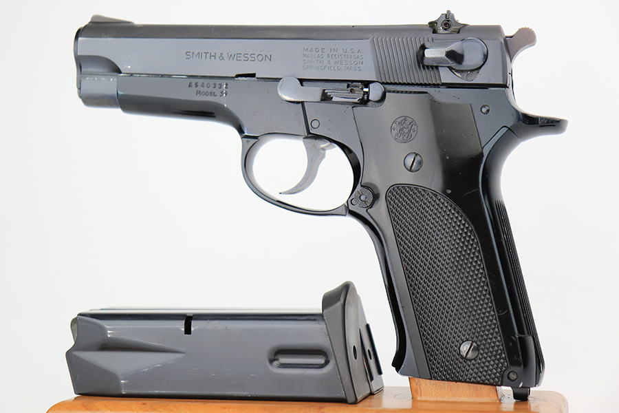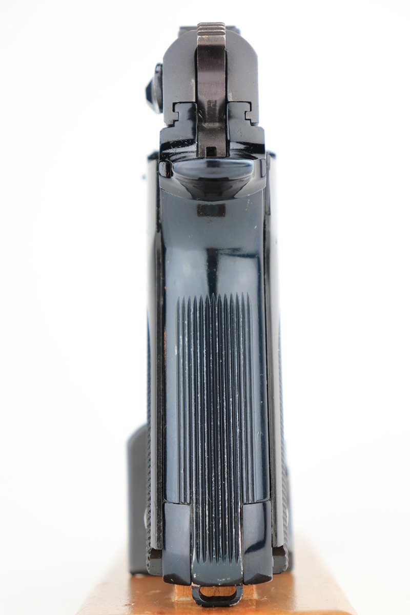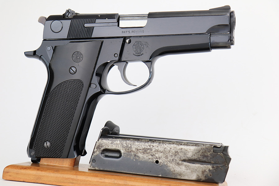5/25/23 – This is a minty example of a Smith & Wesson Model 59, manufactured in about 1978 and chambered in 9mm. The gun has retained nearly all of its original finish, but there is a hint of muzzle wear, some tiny dots of discoloration at the left front of the slide, some minor discoloration on the right side of the slide, and a few tiny handling marks here and there. Fitted with nice plastic grips – some tiny dings and scratches on both sides. Comes with two proper magazines. Mint bore.