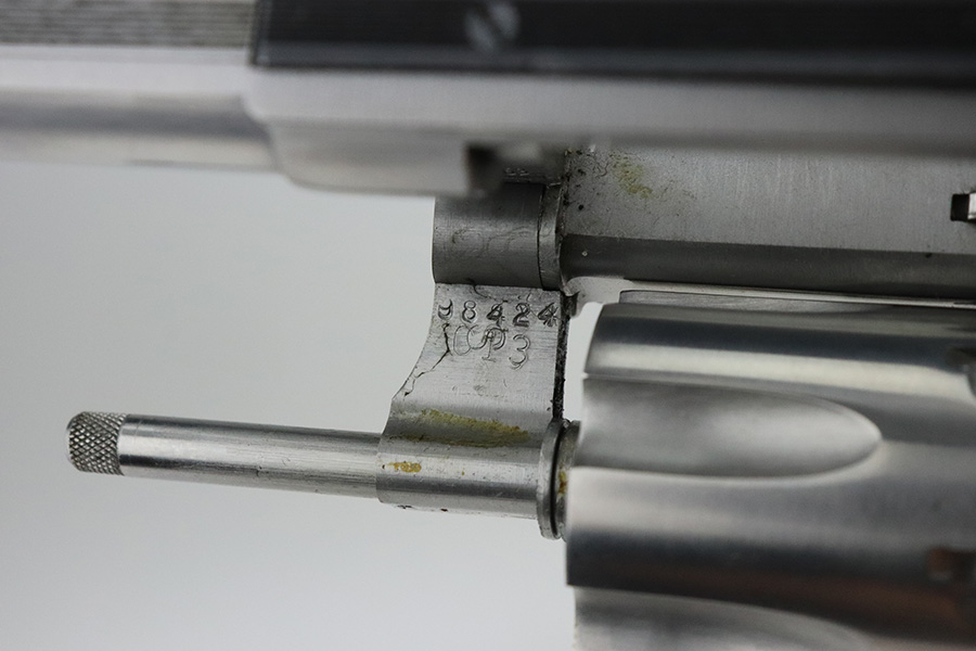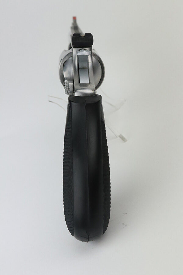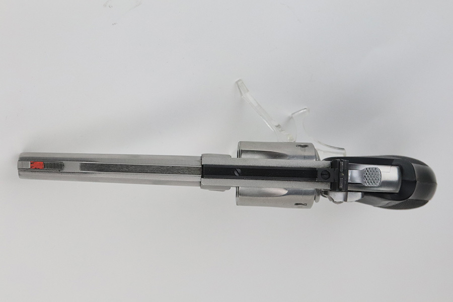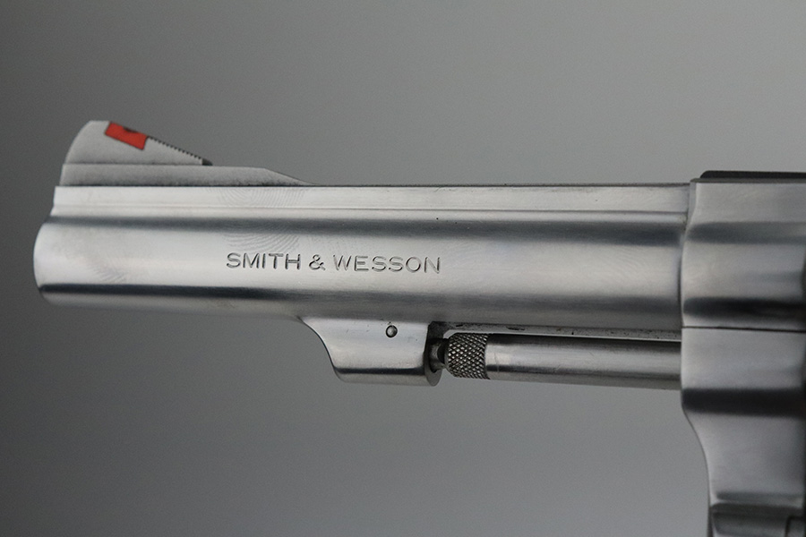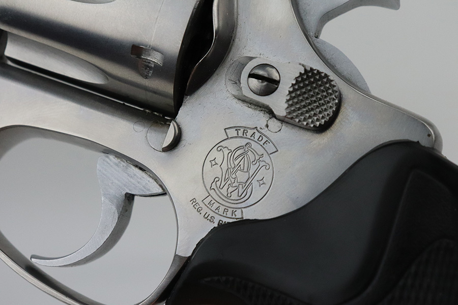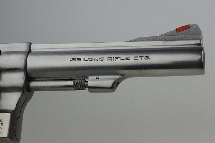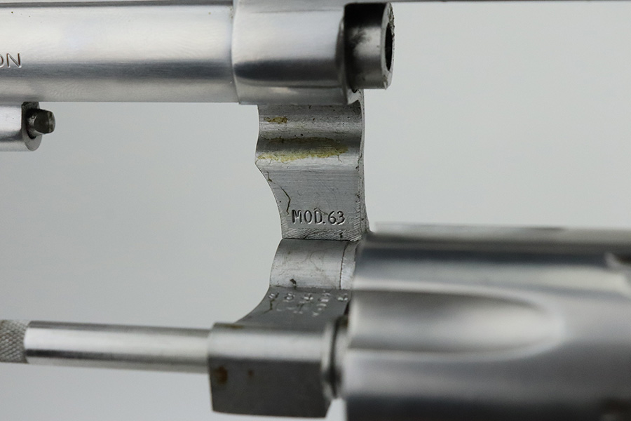 7/30/21 – This is a near-mint example of a Smith and Wesson Model 63 Revolver chambered in .22 LR. It has a stainless finish and comes with a black rubber grip. The only sign of wear is some very light handling marks here and there, most noticeable on the right side of the frame. Very light roll mark on the cylinder. The cylinder is tight and the action is smooth. Mint bore.