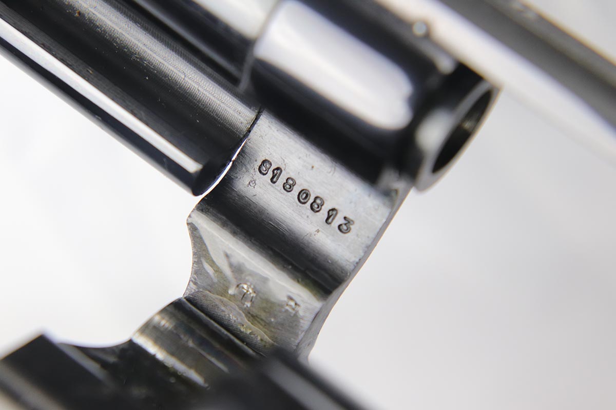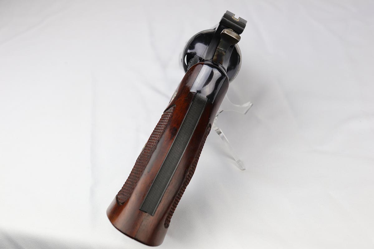 4/27/18 – This is a gorgeous example of an early Pre-Model 29 S&W revolver, chambered in iconic .44 magnum cailber. Made around 1958-1959, this 4-screw variation is ANIB with only minimal “box” wear as per pictures. It could be unfired, as we see no evidence of gunpowder residue anywhere on the cylinder. The gun has beautiful high polished blue finish of the late 50’s era that you would not find on any of the modern guns. Mint bore and mint “coke” grips. It comes with an original black presentation case with tool and a super rare outer cardboard sleeve. Just a stunning example of an early S&W large caliber revolver!