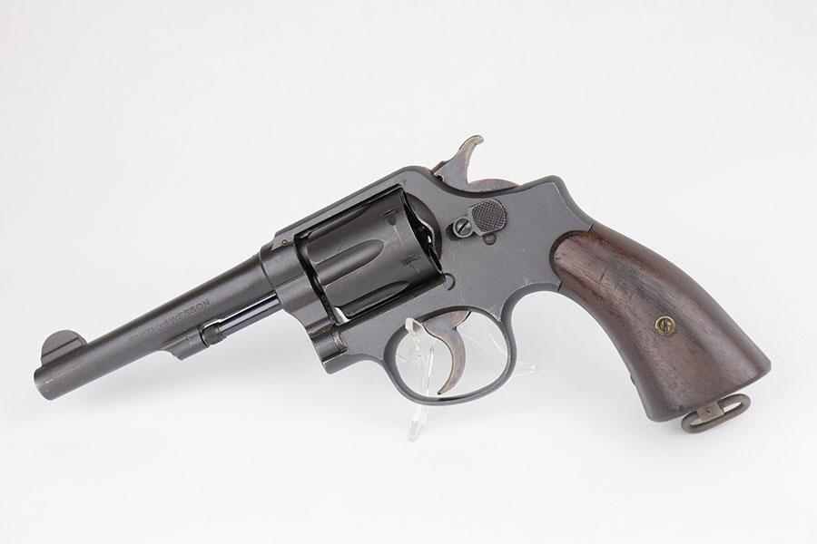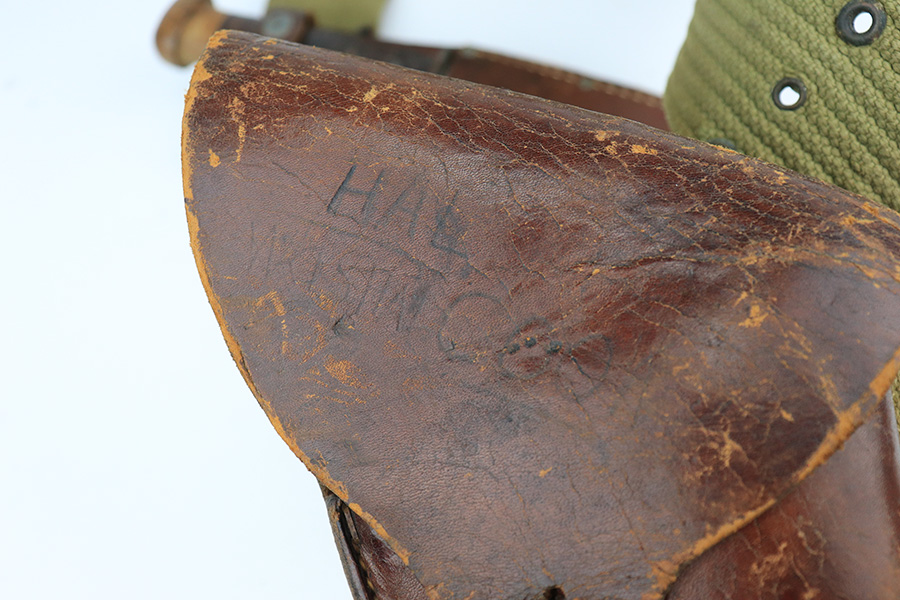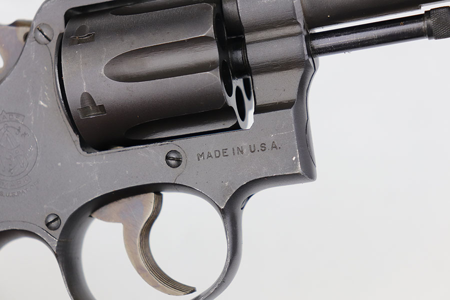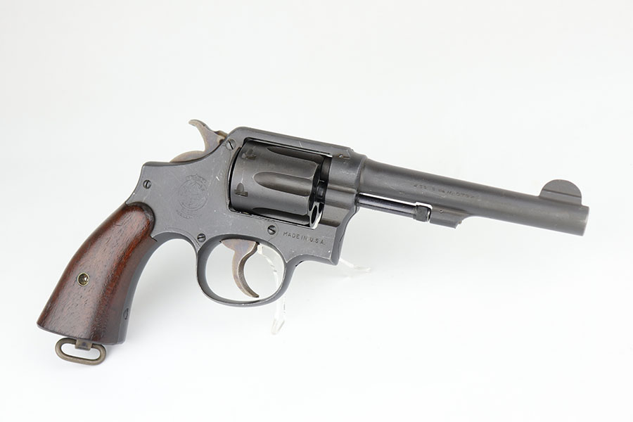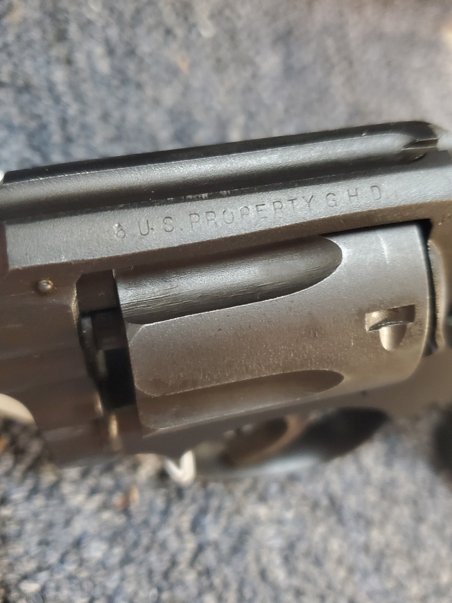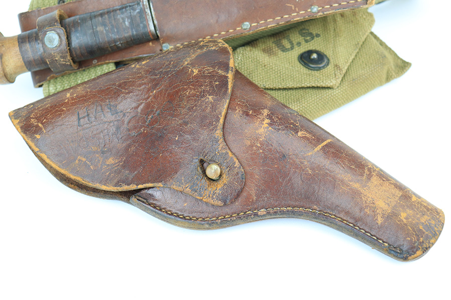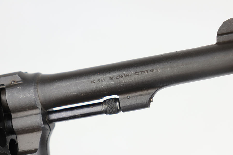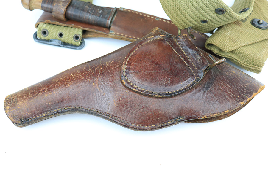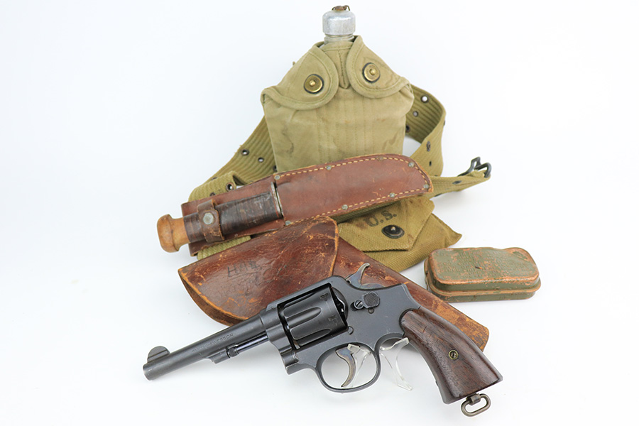 5/19/22 – This is a near-mint Smith & Wesson Victory Model rig from World War II. It is U.S. Property marked and G.H.D (Guy H. Drewry) inspector marked. The original finish is about 98-99% with a little bit of muzzle wear and a thin roll mark on cylinder. Minty bore. Made from 1942 to 1944, with a production run of ~500,000. They were standard issued side arms for US Navy and Marine air crews due to their size and ease of operation. It is .38 S&W. Super smooth action. Comes with a complete set of accessories that includes a holster, belt, first aid kit, canteen and a Robeson USN knife. The first aid kit pouch is maker marked and 1942 dated. Knife is marked U.S.N. on one side and ‘Robeson Shuridge Nc.20’ on the other. Canteen pouch is also 1942 dated.