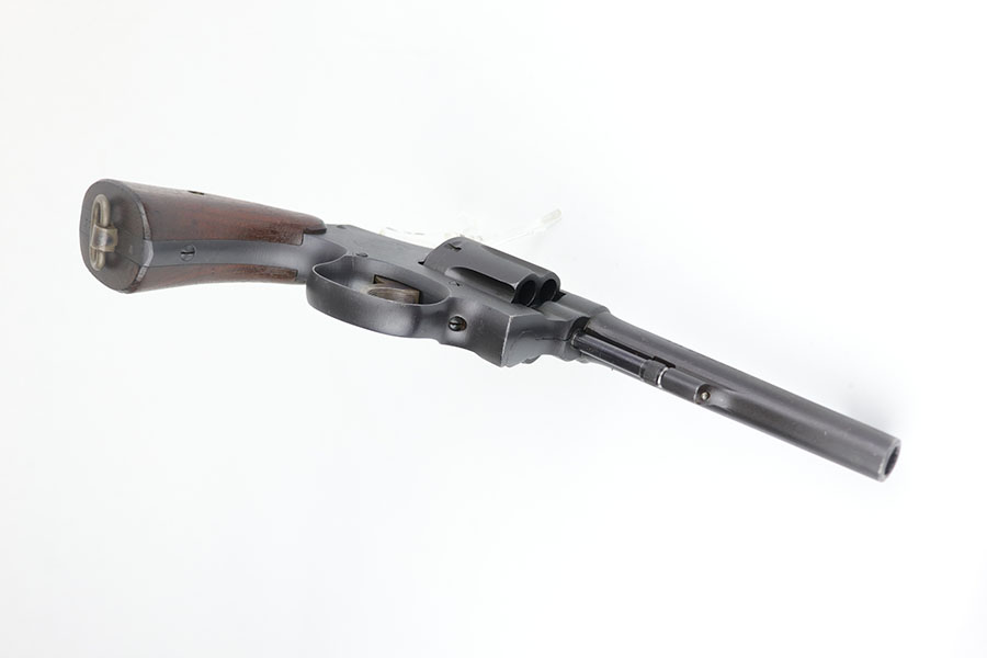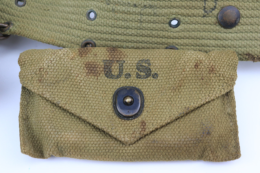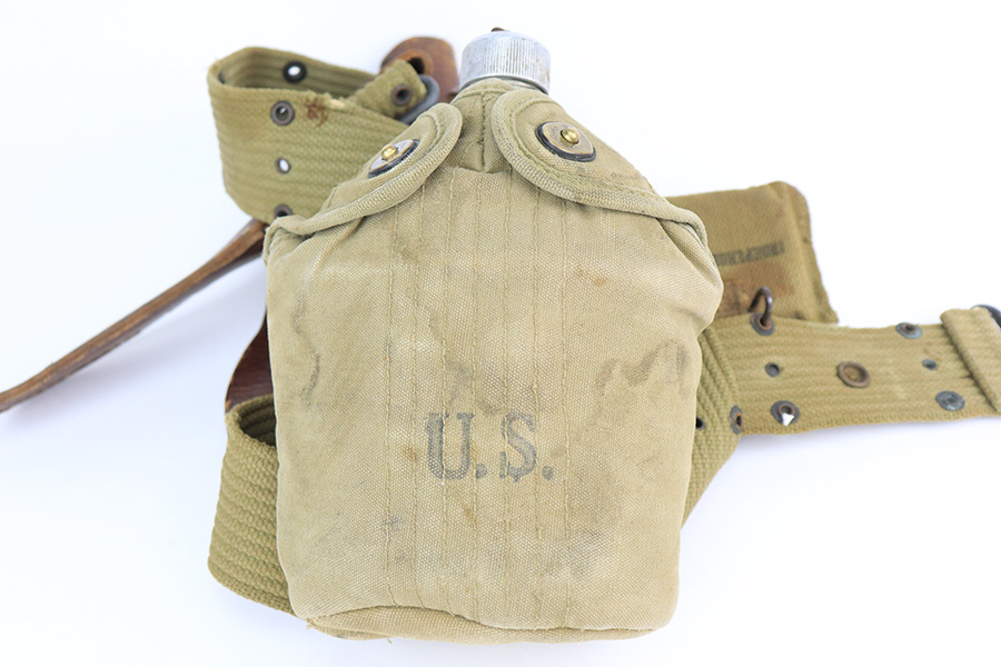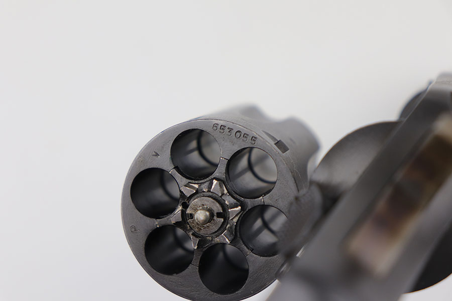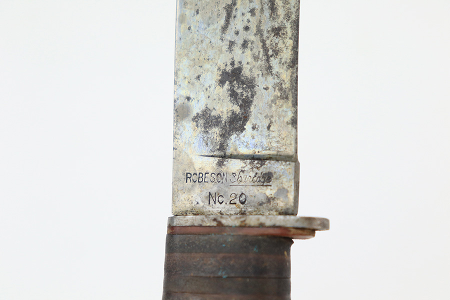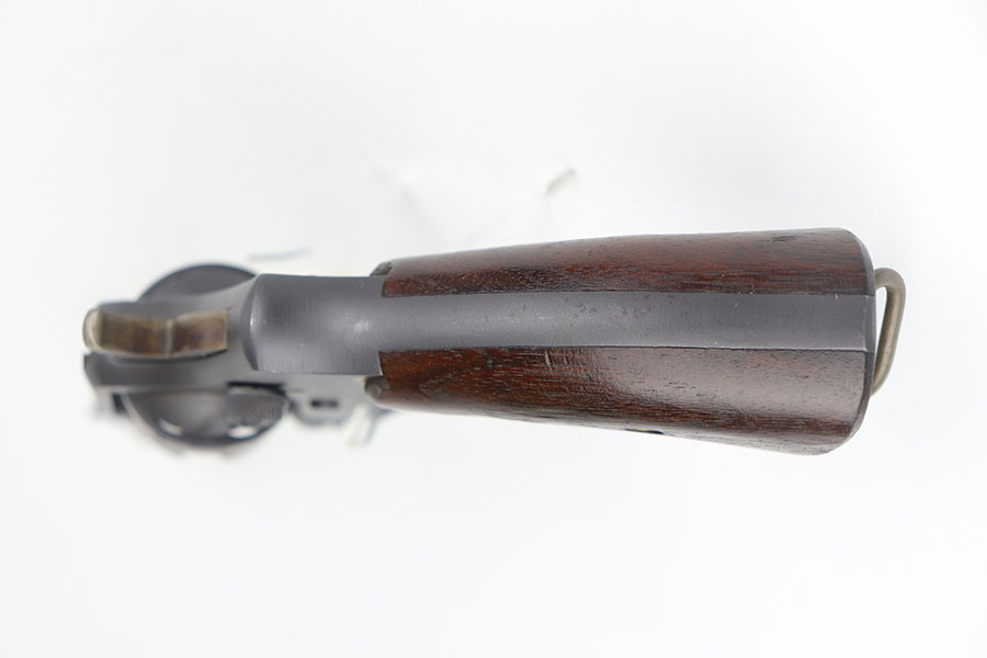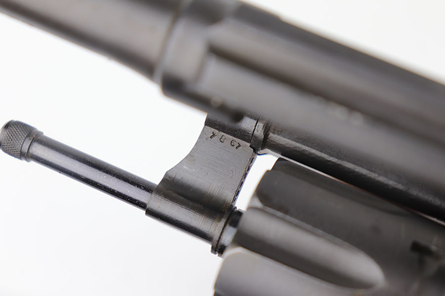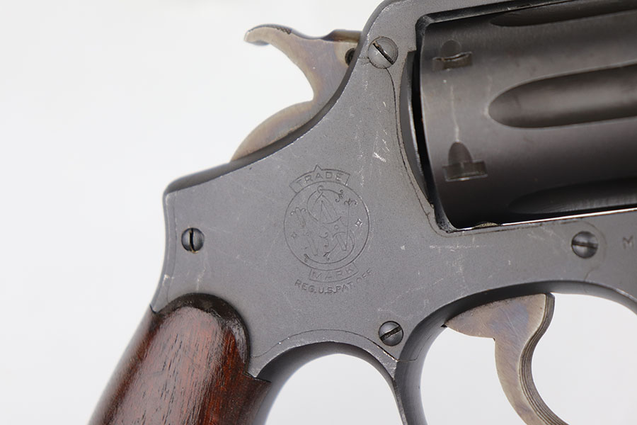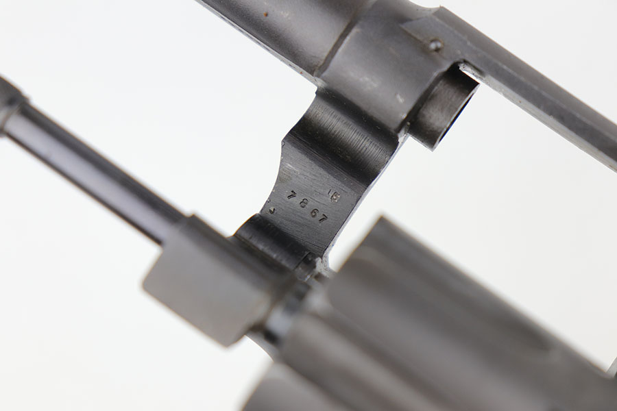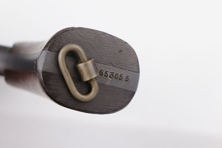 5/19/22 – This is a near-mint Smith & Wesson Victory Model rig from World War II. It is U.S. Property marked and G.H.D (Guy H. Drewry) inspector marked. The original finish is about 98-99% with a little bit of muzzle wear and a thin roll mark on cylinder. Minty bore. Made from 1942 to 1944, with a production run of ~500,000. They were standard issued side arms for US Navy and Marine air crews due to their size and ease of operation. It is .38 S&W. Super smooth action. Comes with a complete set of accessories that includes a holster, belt, first aid kit, canteen and a Robeson USN knife. The first aid kit pouch is maker marked and 1942 dated. Knife is marked U.S.N. on one side and ‘Robeson Shuridge Nc.20’ on the other. Canteen pouch is also 1942 dated.