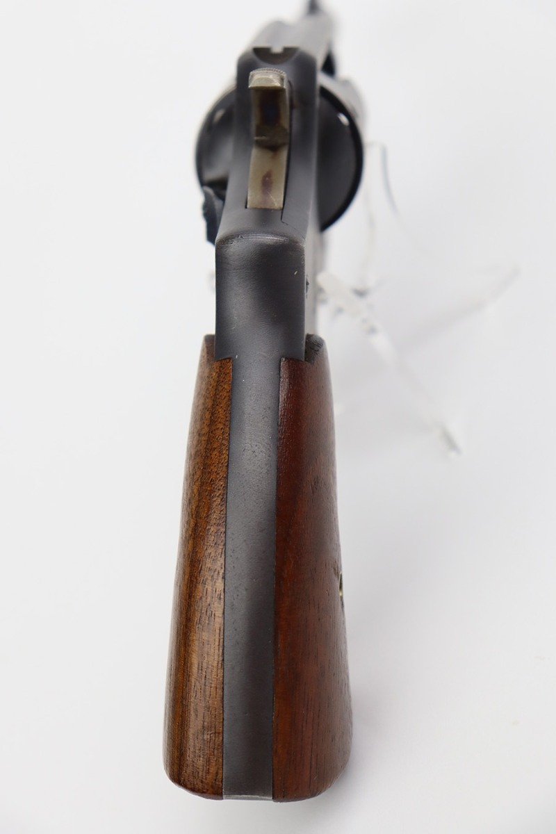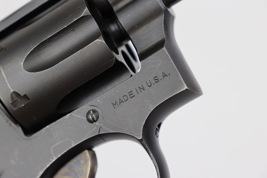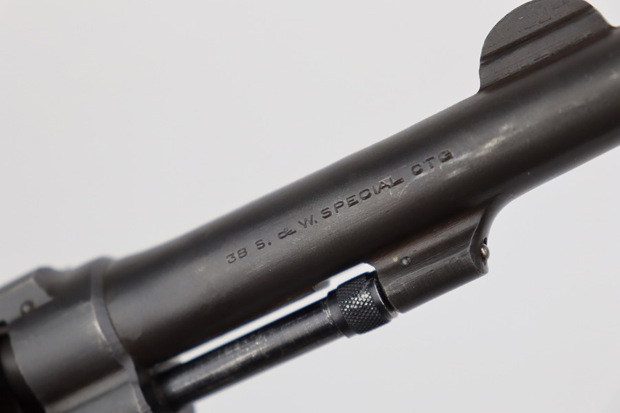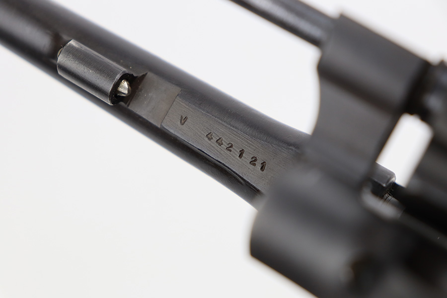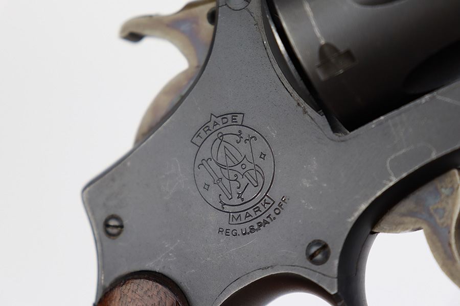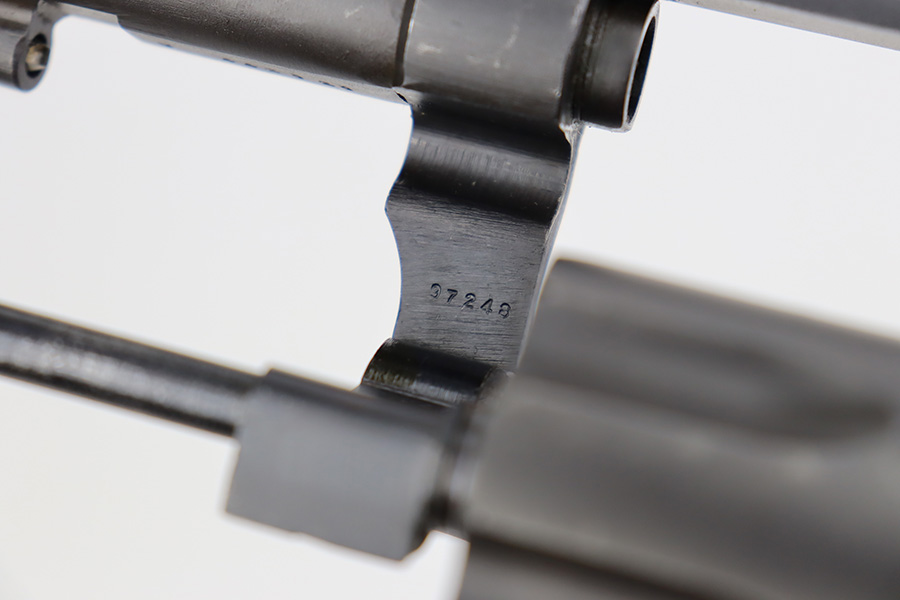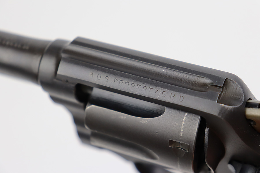 8/9/23 – This is a minty Smith and Wesson Victory revolver from World War II. All matching, with the proper “US Property GHD” marking on the top strap, this example was manufactured in 1943. These were typically used as standard issued side arms for US Navy and Marine air crews due to their size and ease of operation. The revolver has retained nearly all of its original parkerized finish, with some minor wear in a couple areas along the barrel, and a few small surface scuffs here and there on the cylinder and frame. Feint turn line on the cylinder. Beautiful case-hardening on the trigger and hammer, and the bore is mint. The cylinder is tight and the action is smooth. Comes with a flawless set of original matching Walnut grips, serialized on the right panel.