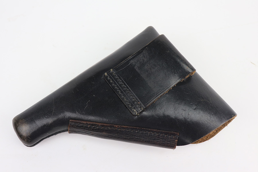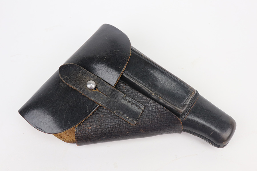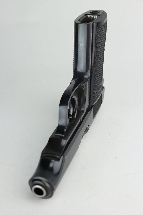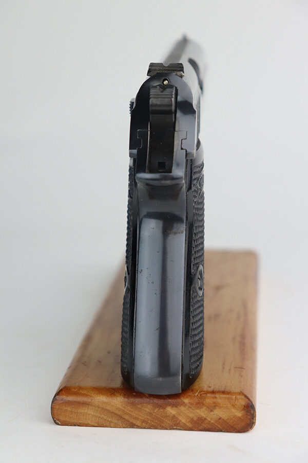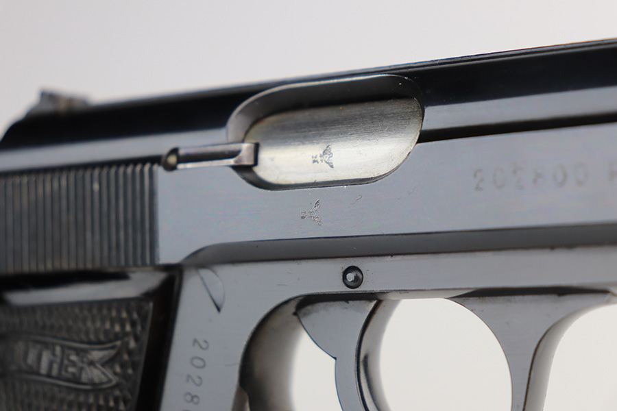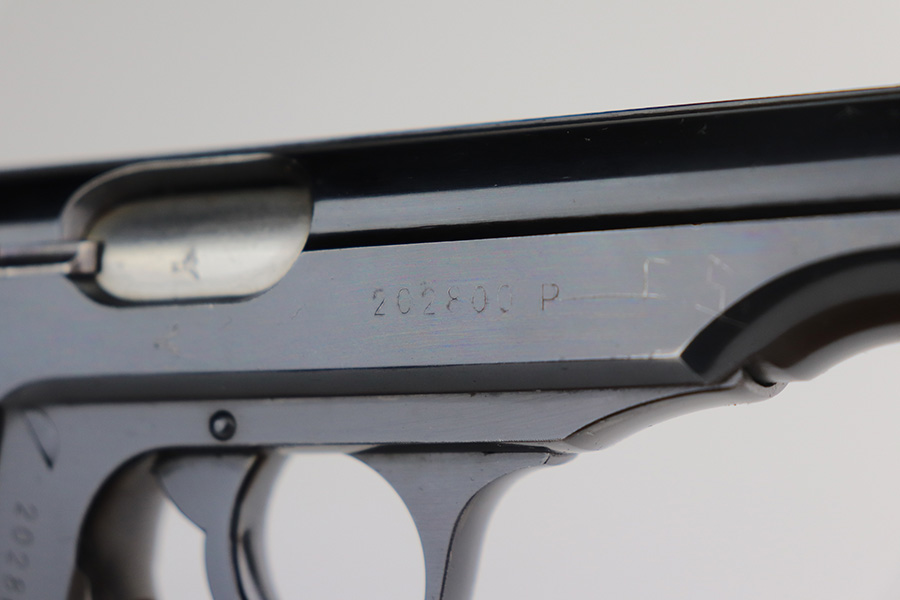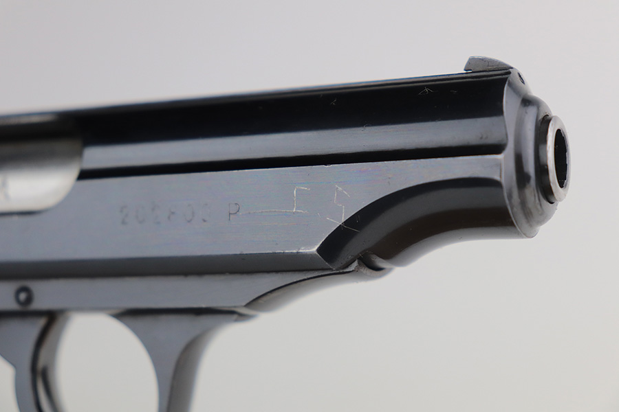 8/2/21 – This is a minty example of a Walther PP that was issued to the SS in 1940. It is all matching and has the proper “Eagle N” proofs. The gun comes with a minty SS style Akah holster that is black with black stitching and an original matching-numbered finger extension magazine. The gun has retained about 98% of its original high polish finish. There are just hints of wear on the high edges of the slide and one tiny spot of wear on the front strap. Unfortunately, someone lightly scratched their initials, “CS” into the right side of the slide. Comes with excellent grips. Minty shiny bore.