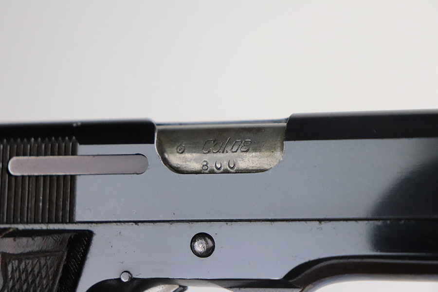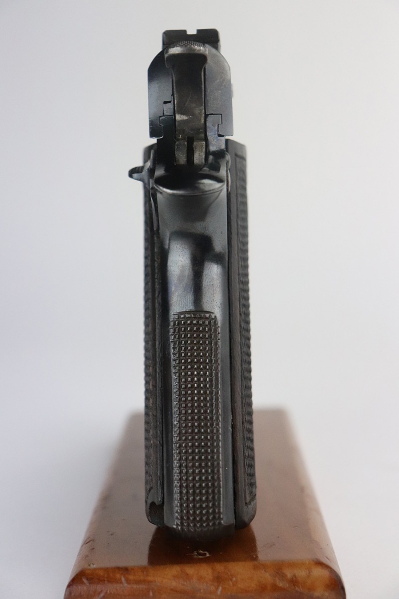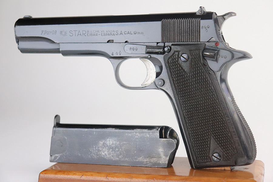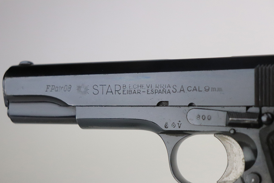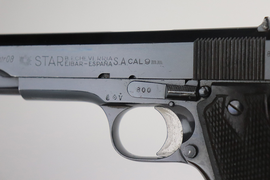 7/12/21 – This is a minty example of a Star Model B manufactured in 1951. It is all matching and has the proper Spanish proofs. It also has an “LPN” marking on the front strap, indicating it was issued to the West German Police force. It has retained about 98% of its finish. There is minor wear and a few dots of discoloration on the top of the slide. Some minor freckling around the muzzle and on the straps. Comes with proper wood grips – there is a repaired crack in the right grip that runs the whole length. Also comes with a proper magazine. The bore is excellent – shiny with strong rifling.