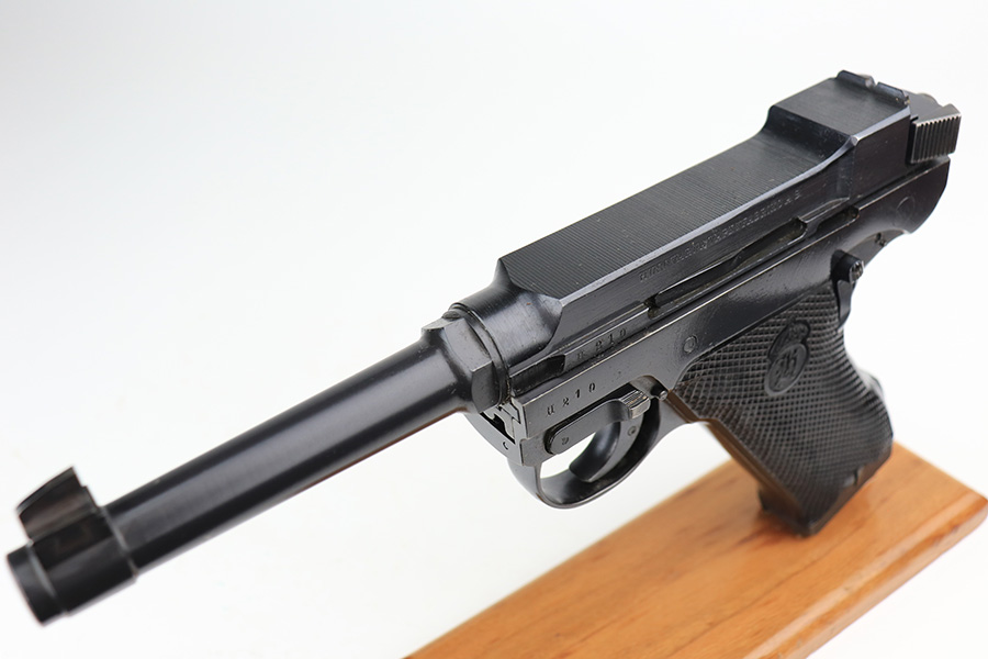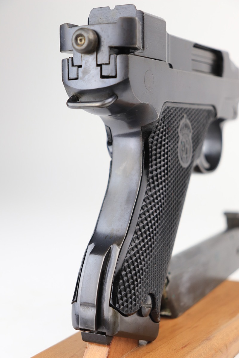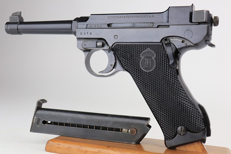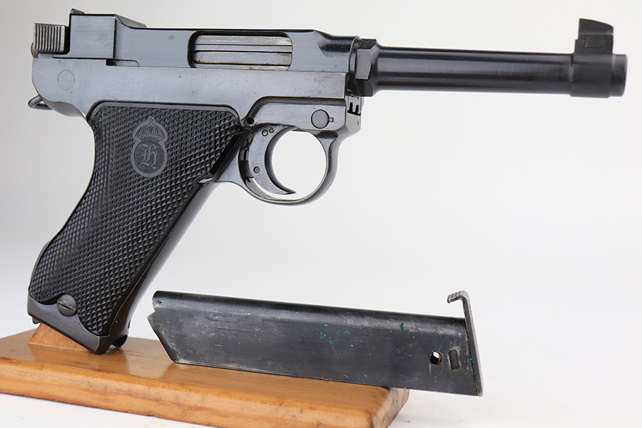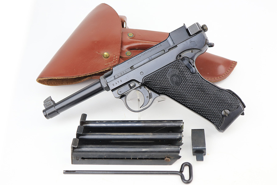 3/15/23 – This is a near-mint example of a Swedish Husqvarna M40 Rig. The Husqvarna m40 was manufactured 1940 to 1946 and was a Swedish copy of the Finnish Lahti pistol. The first m40s were delivered to the Swedish military by 1942. The grips of the m40 have the Husqvarna “crown H”. The m/40 would eventually be taken out of service in the 1980s. This one is all matching and has a crown proof on the takedown lever. It lacks the military “Crown HV” on the tang. it comes as a rig with a mint “MW” marked holster, cleaning rod, loading tool, and three proper magazines. The gun has retained virtually all of its finish with just a few small spots of wear on the grip straps. Comes with excellent “Crown H” grips. The bore is mint.