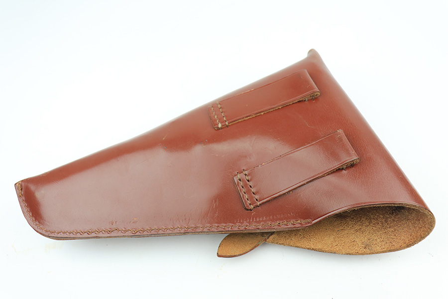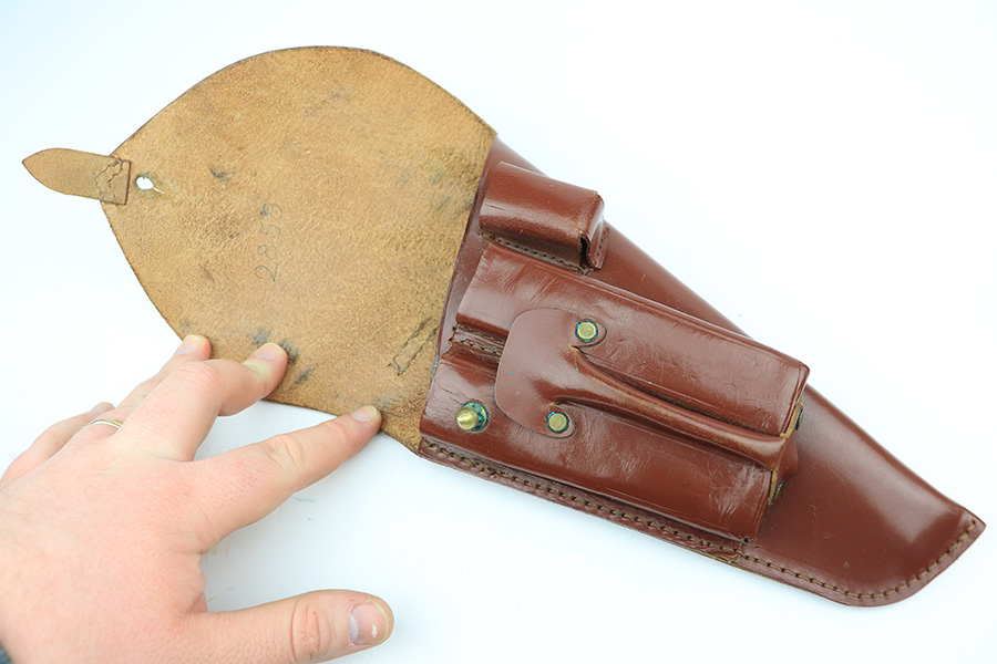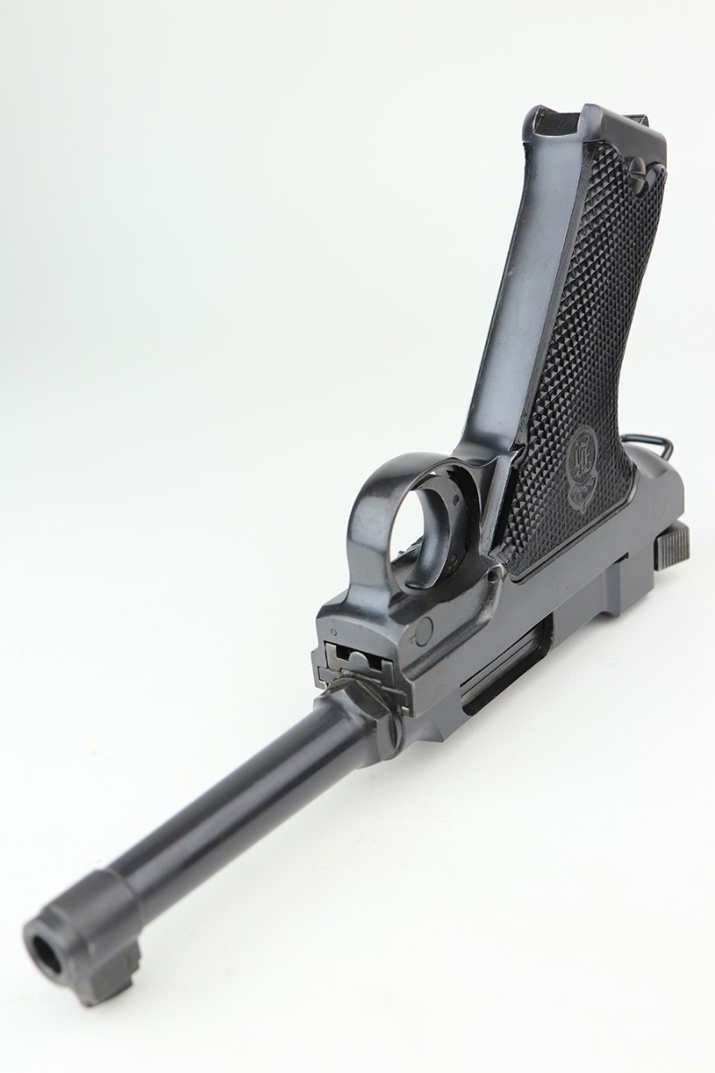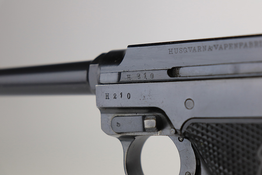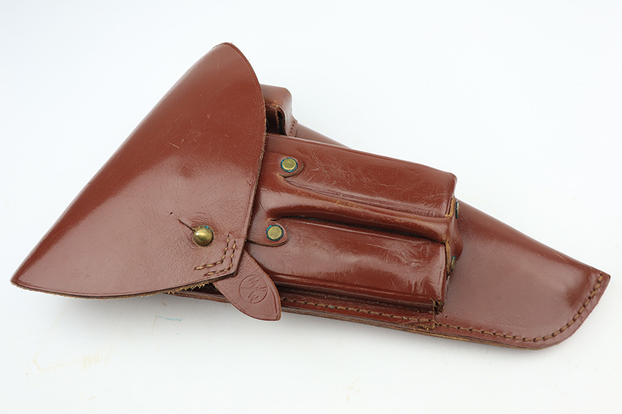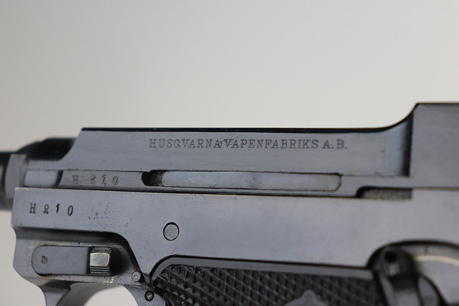 3/15/23 – This is a near-mint example of a Swedish Husqvarna M40 Rig. The Husqvarna m40 was manufactured 1940 to 1946 and was a Swedish copy of the Finnish Lahti pistol. The first m40s were delivered to the Swedish military by 1942. The grips of the m40 have the Husqvarna “crown H”. The m/40 would eventually be taken out of service in the 1980s. This one is all matching and has a crown proof on the takedown lever. It lacks the military “Crown HV” on the tang. it comes as a rig with a mint “MW” marked holster, cleaning rod, loading tool, and three proper magazines. The gun has retained virtually all of its finish with just a few small spots of wear on the grip straps. Comes with excellent “Crown H” grips. The bore is mint.