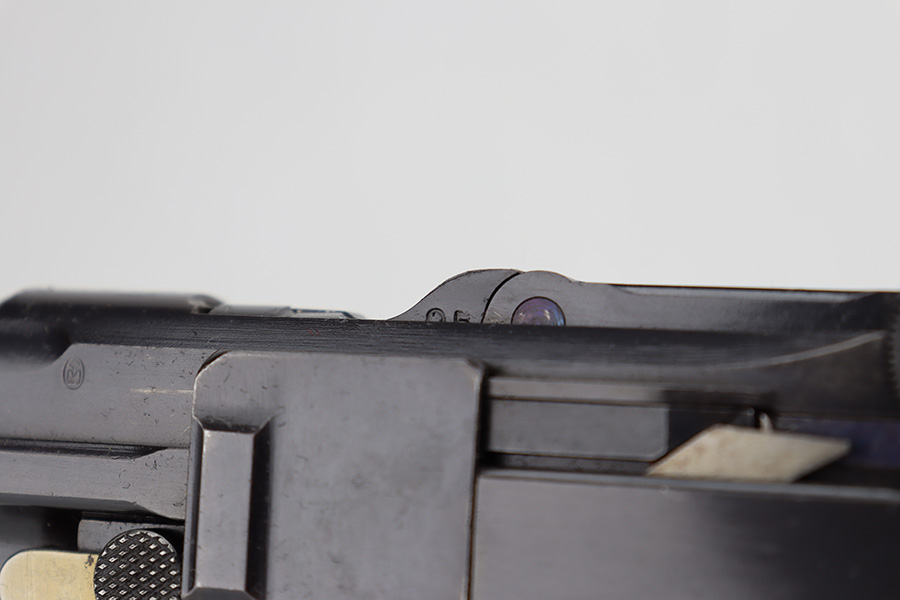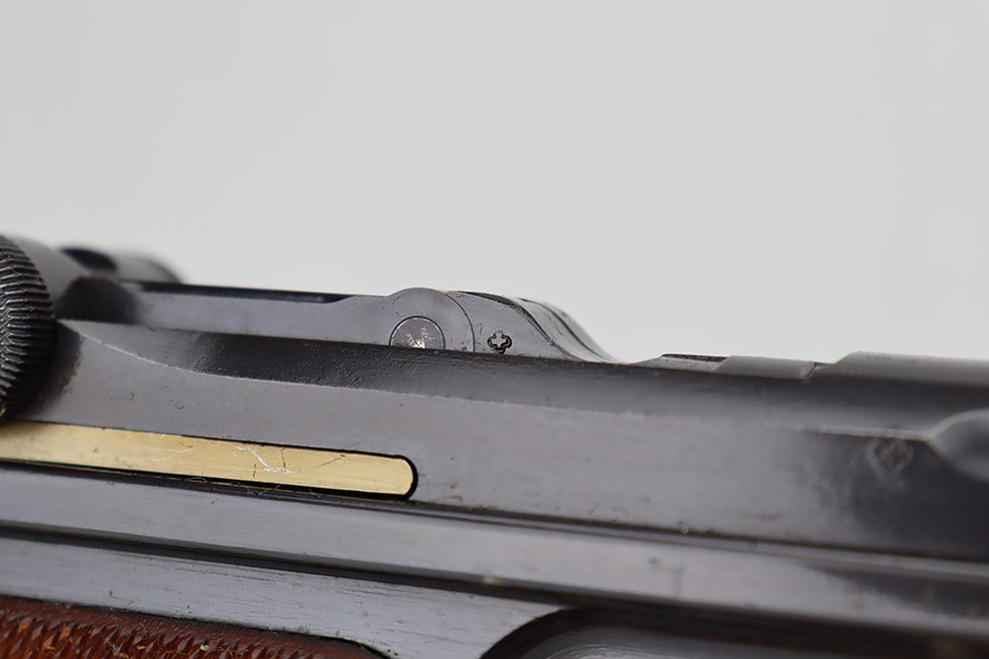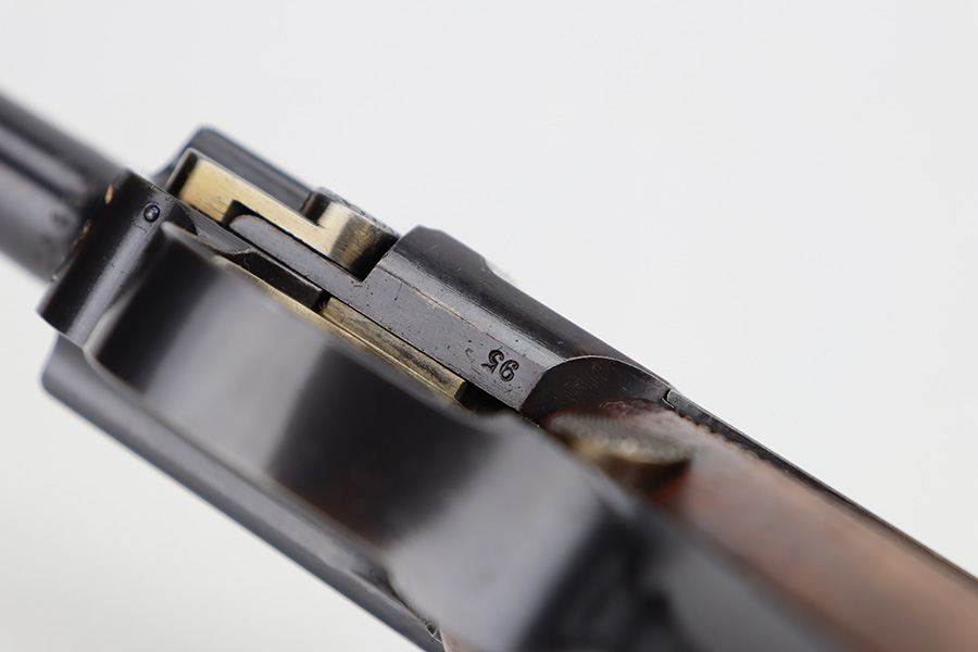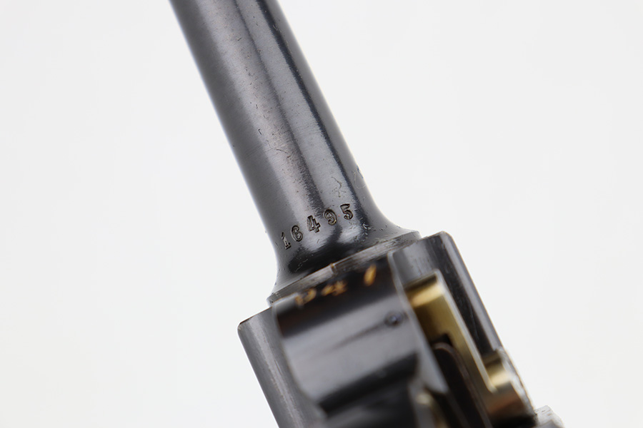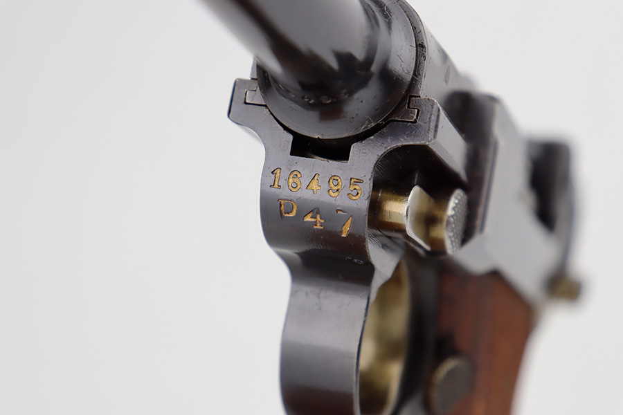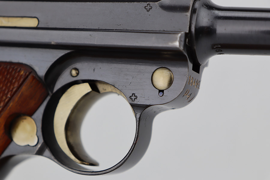 6/14/23 – This is a near-mint example of a Waffenfabrik Bern 1906/24 Luger. All matching and original with the proper Swiss proofs throughout. There is “P47” marking on the frame, indicating it was sold in the commercial market. Mint bore and grips. It has retained nearly all of its original finish with just hints of wear on some of the high edges. Comes with a brown bakelite-bottom Swiss magazine – a few tiny chips in the base. Like-new bore. Comes with an original leather lanyard on the back of the frame.