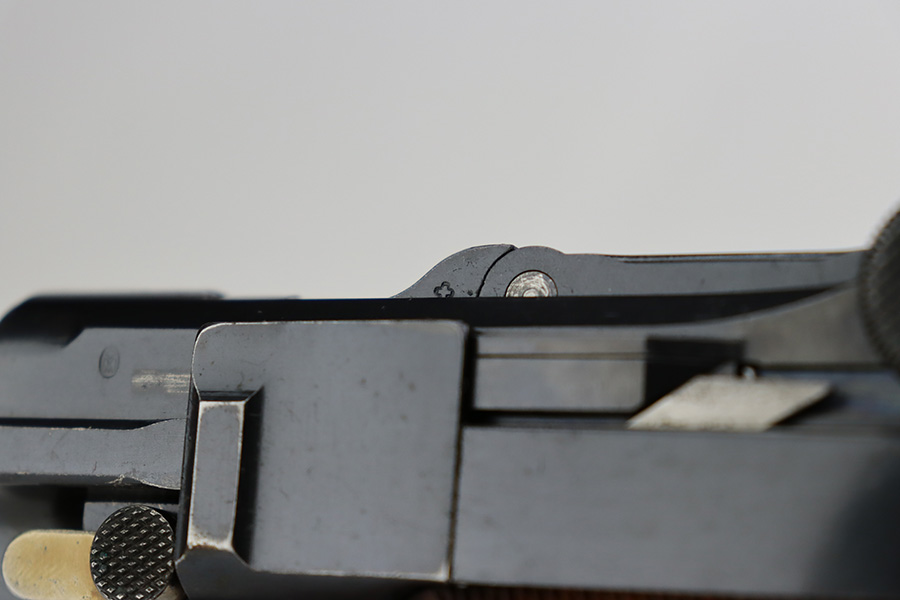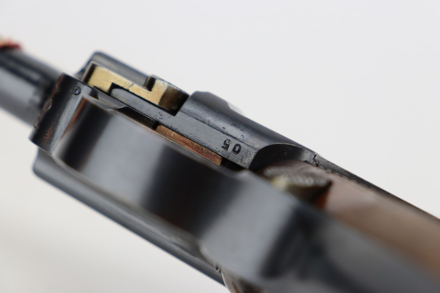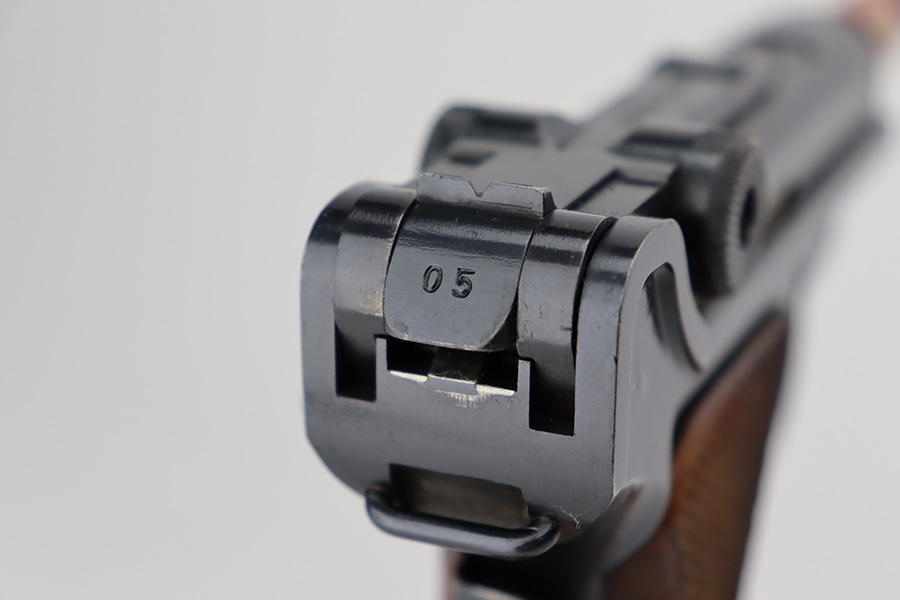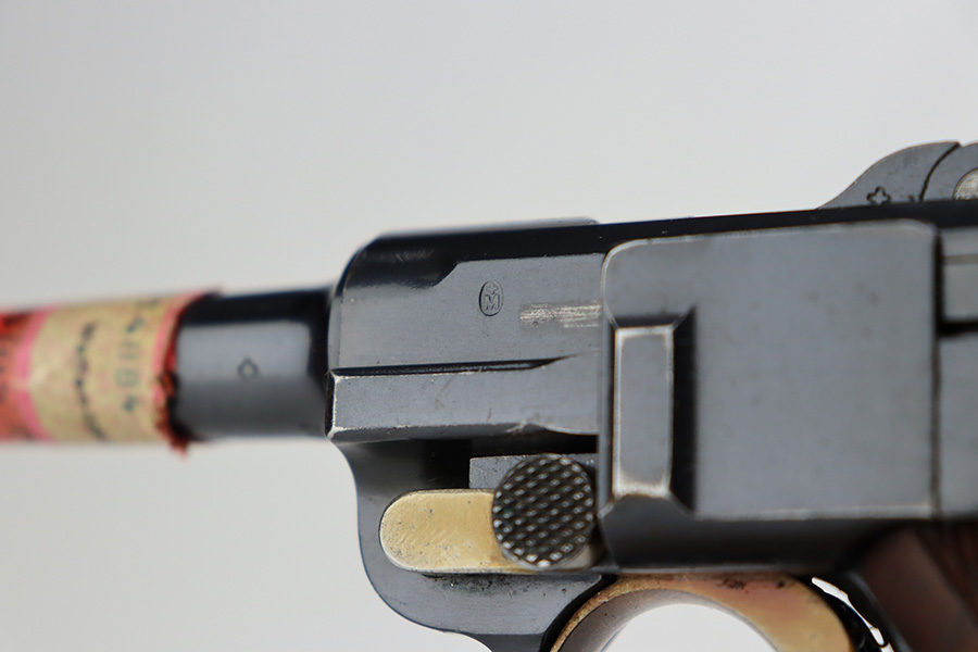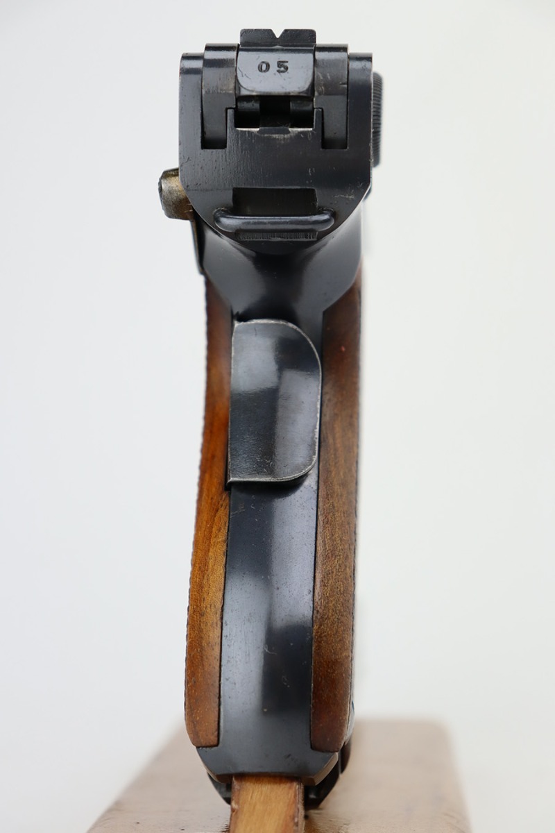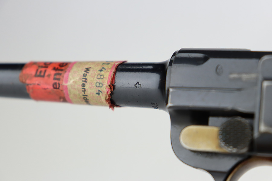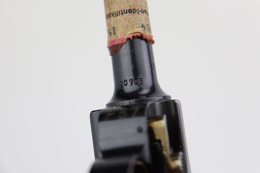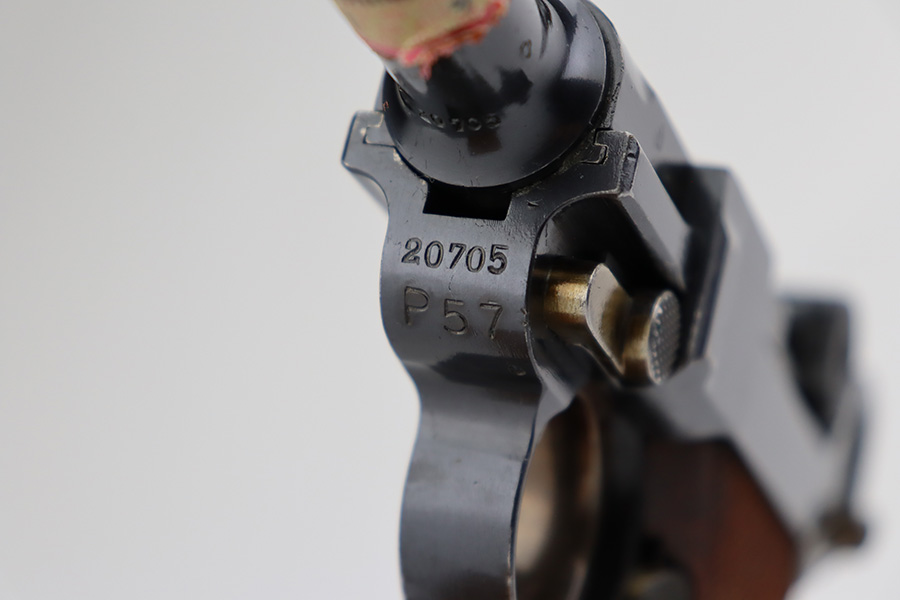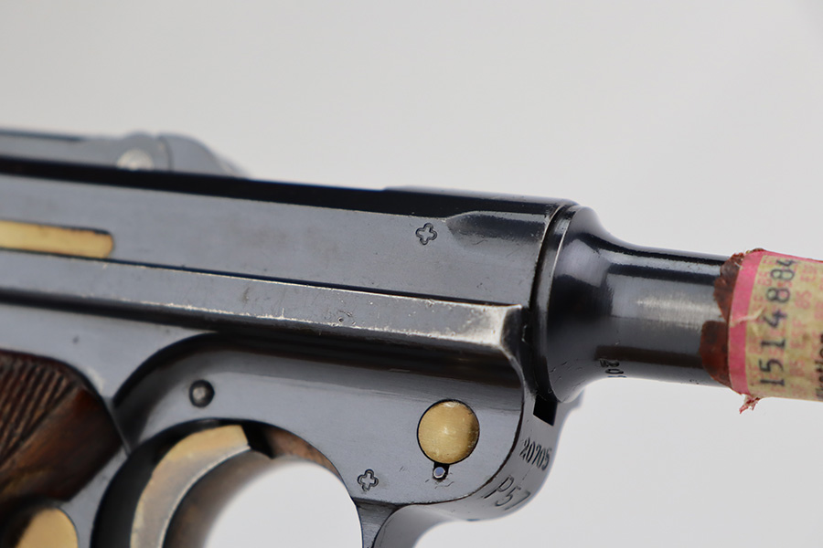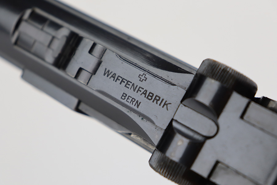 7/28/23 – This is a near-mint example of a Waffenfabrik Bern 1906/24 Luger. All matching and original with the proper Swiss proofs throughout. There is “P57” marking on the frame, indicating it was sold in the commercial market. It comes with its original Swiss Tag on the barrel. It has retained about 97% of its original finish with minor wear around the muzzle, on the side plate, and on the right side rail. Very minor freckling on the grip straps. Minty wood grips. Comes with a proper brown plastic-bottom Swiss magazine. Minty bore.