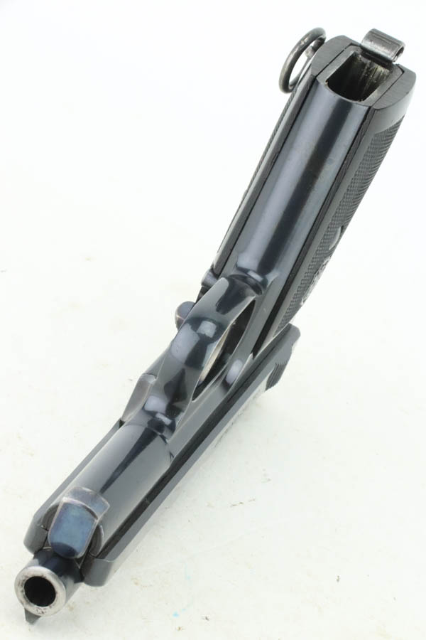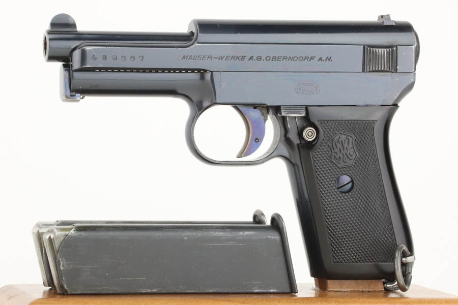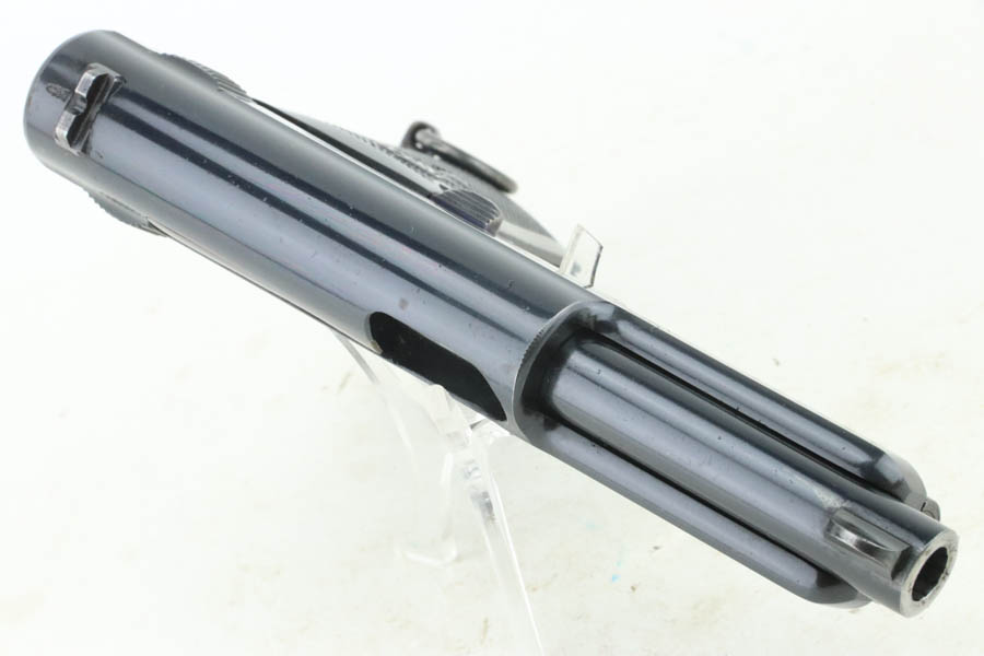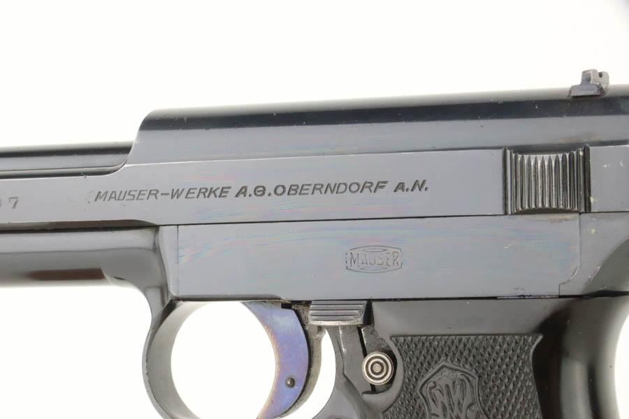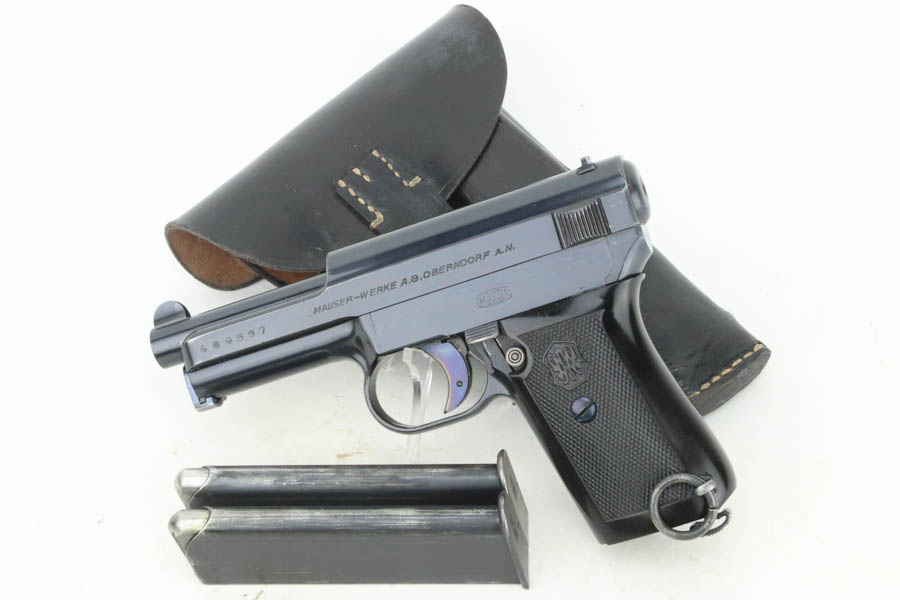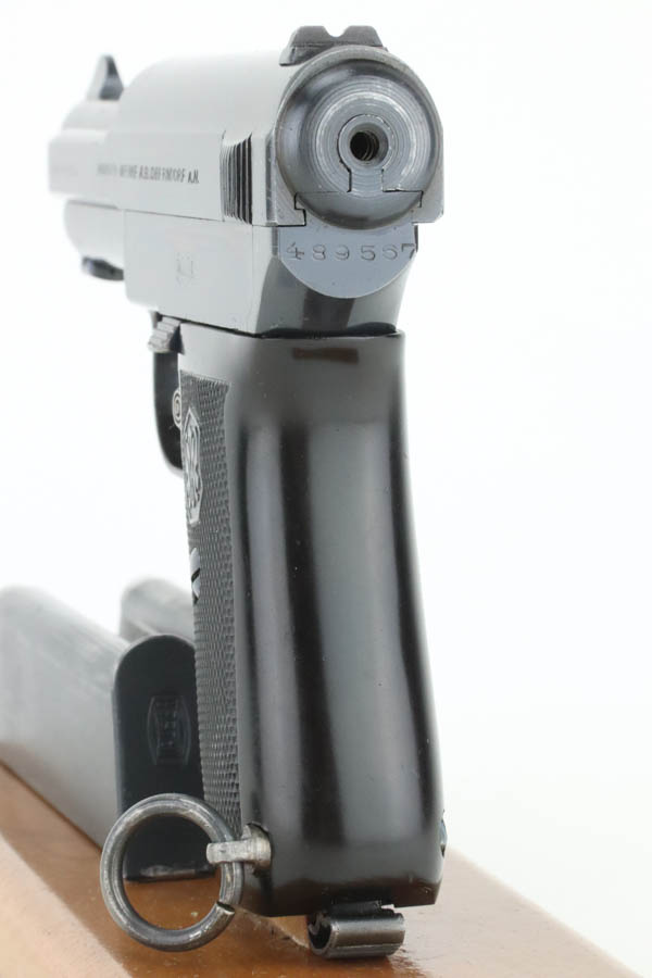 9/18/24 – This is a near-mint example of a transitional Mauser Model 1914/34 sold in the commercial market in 1928-33. It is all matching and has the proper “Crown U” commercial proofs. It comes as a rig with two proper Mauser-marked magazines and a mint 1940-dated Nazi police-marked black leather holster. The gun itself has retained nearly all of its original high polish finish with just a hint of muzzle wear and a few tiny dots of discoloration. Fitted with a nice blackish-brown bakelite grip. Mint bore.