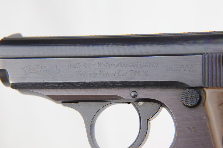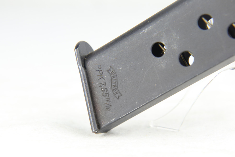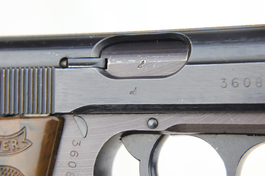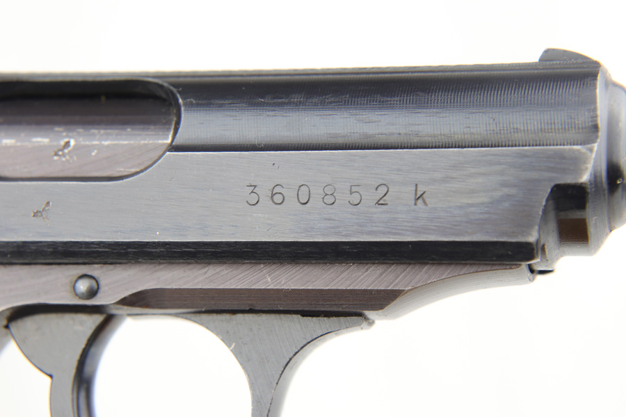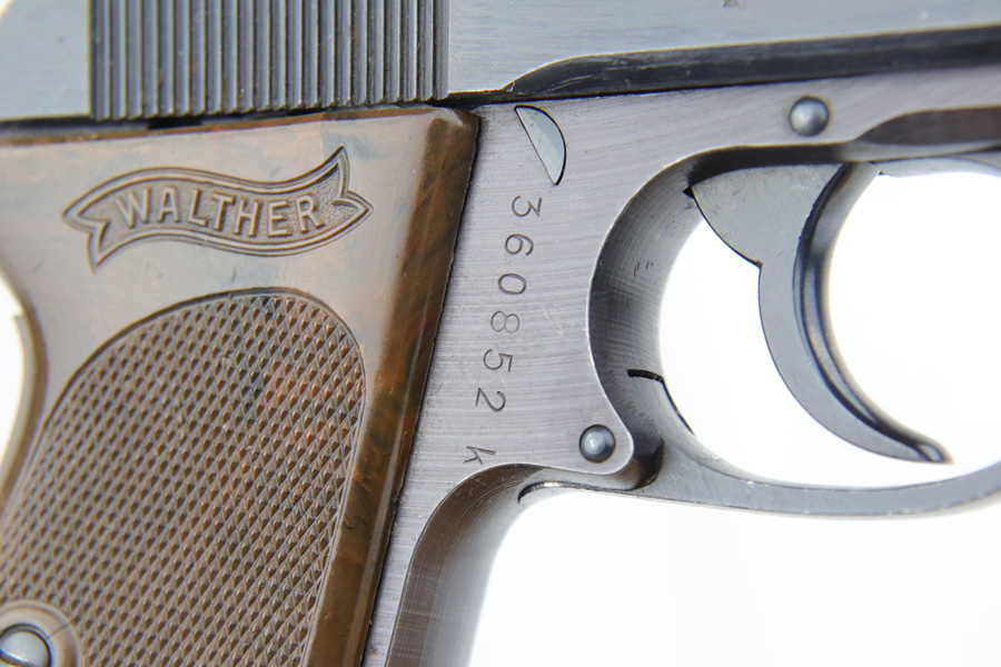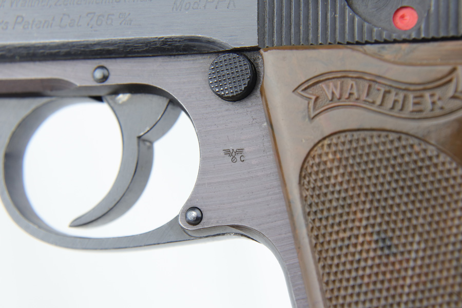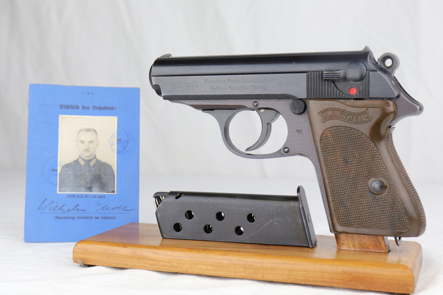 1/10/19 – This is a minty Police Walther PPK with transitional finish and grip. The bluing is not quite high-polish but still better than later military blue. Slight plum color to the frame. Only very minor muzzle wear with a mint bore. Chocolate brown grip. Correct wartime magazine. It came with a Police identity document from 1942 – we don’t have any way of proving the gun belongs to this Major but as it came with the gun, we are including it.