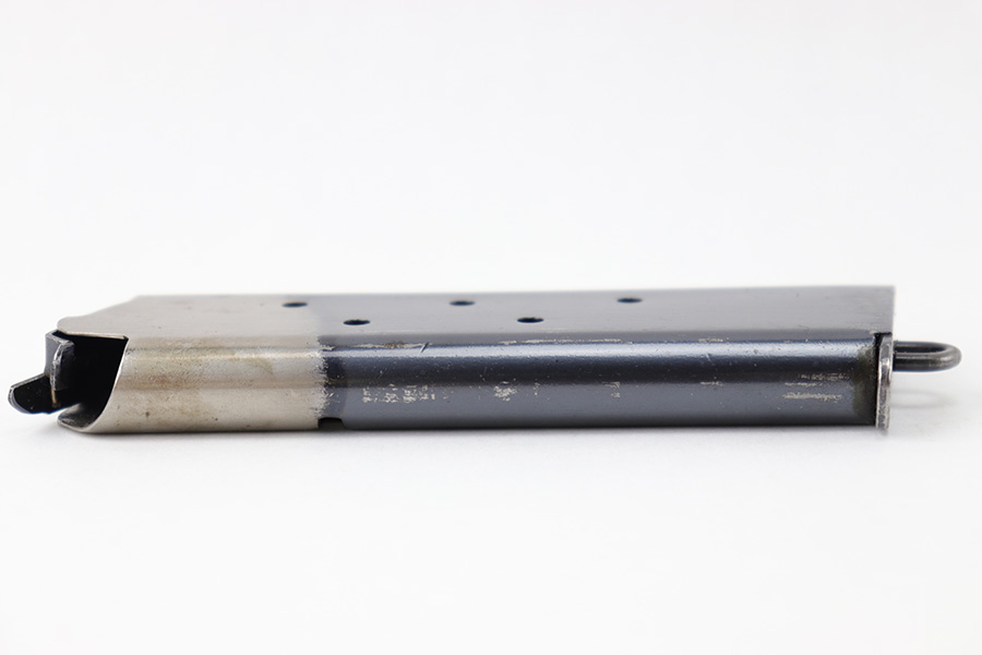 7/24/23 – This is a minty condition, early WW1 production Colt M1911 magazine. The magazine has a clean two-toned finish and a lanyard loop on the base. No markings or stamps. Minimal surface patina and no rust or pitting. This example is in top-tier condition. Fully functional spring.
