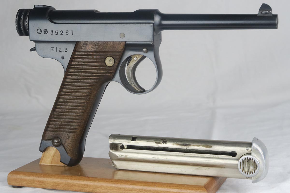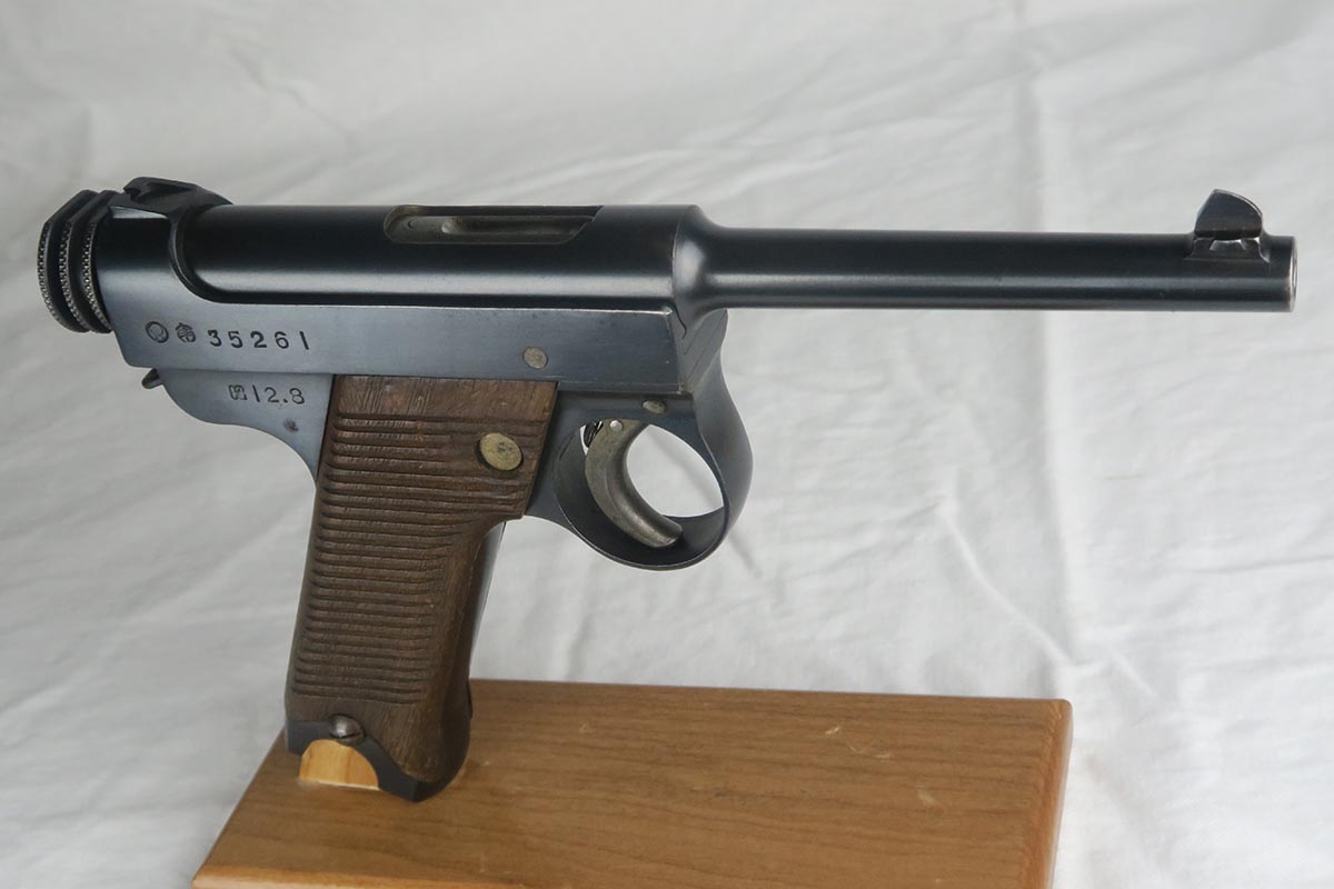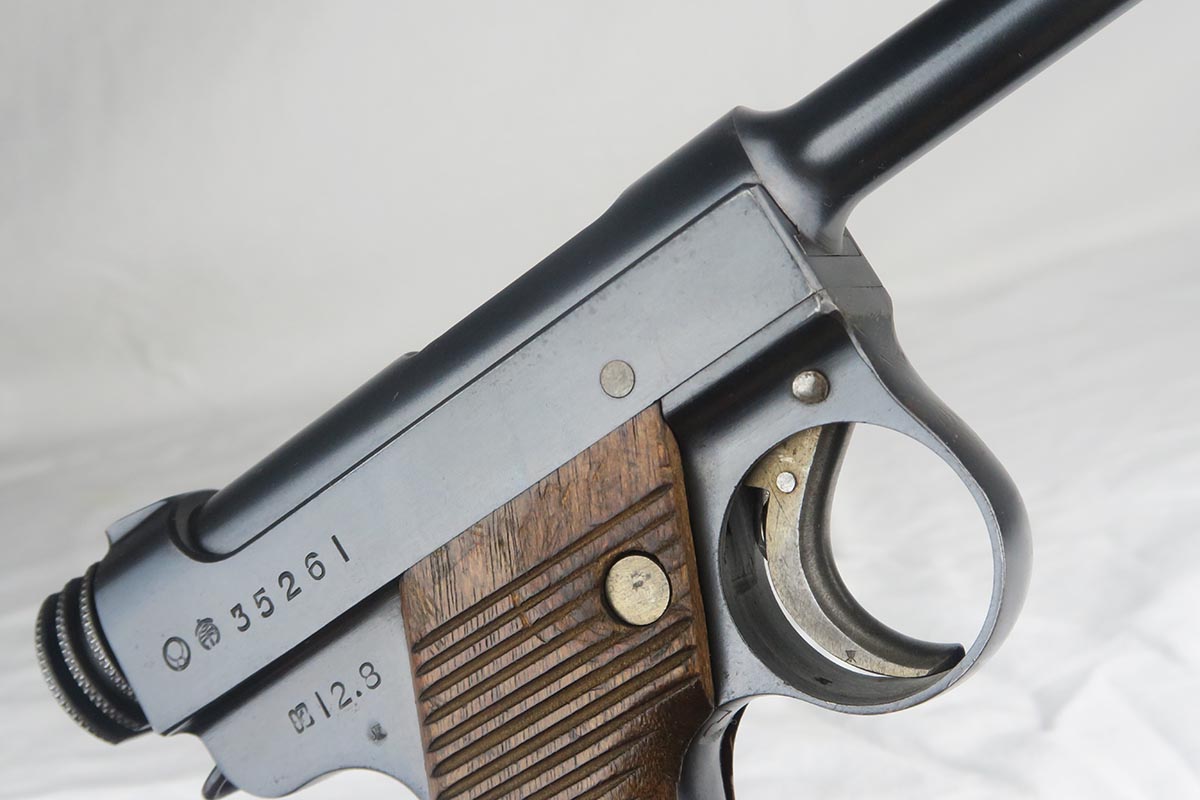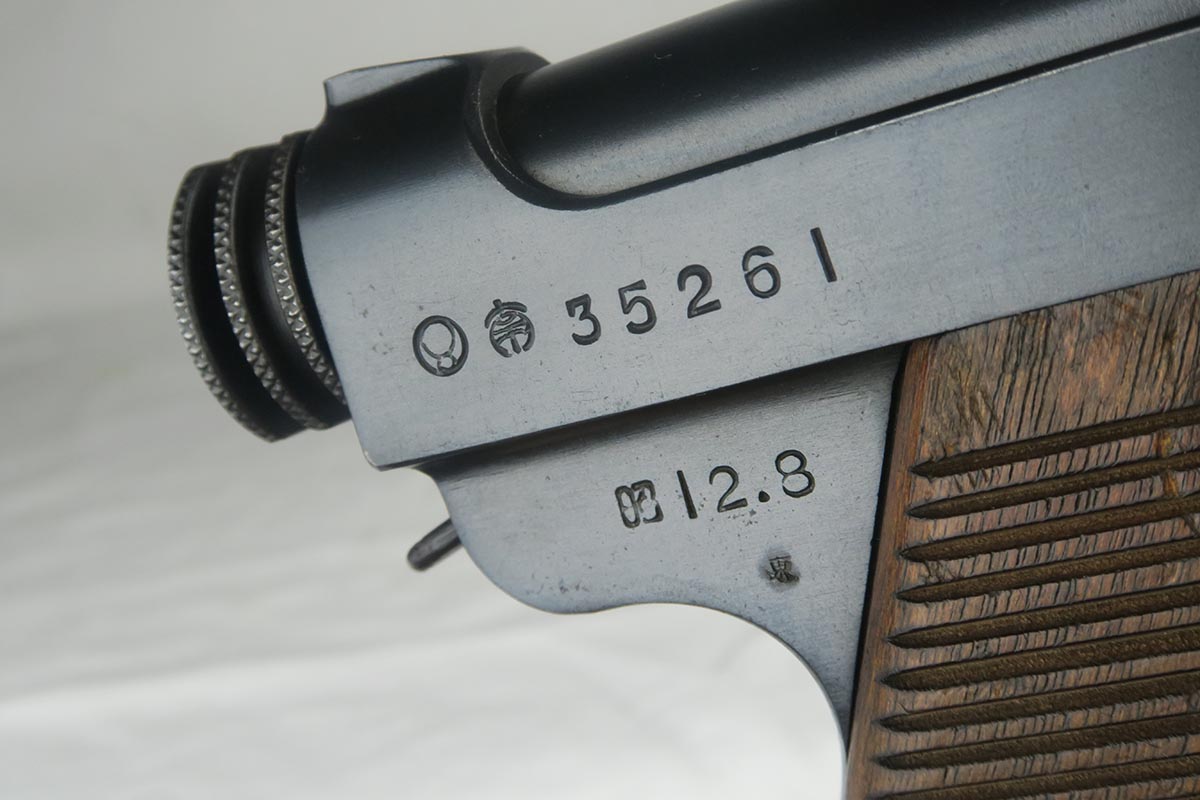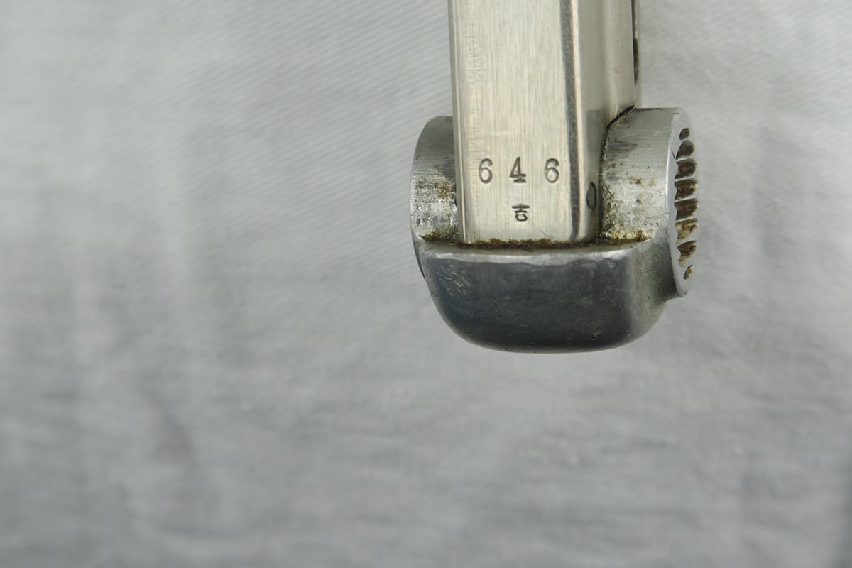 11/9/17- This is an early, near-mint Type 14 Nambu from August of 1937. The finish is all original with only minor muzzle wear and some dings on the trigger guard. Magazine is not matching but is correct, early nickel. Grips are hand numbered to match the pistol. Excellent bore.