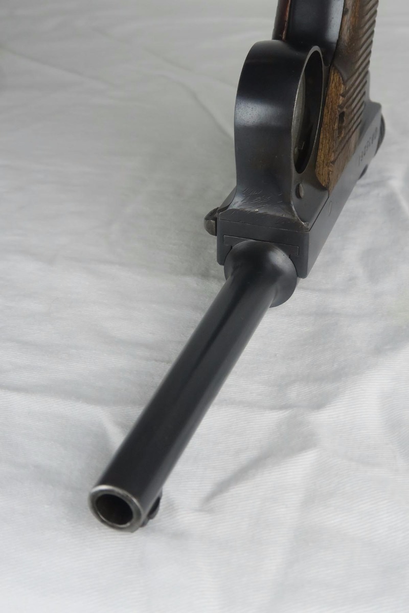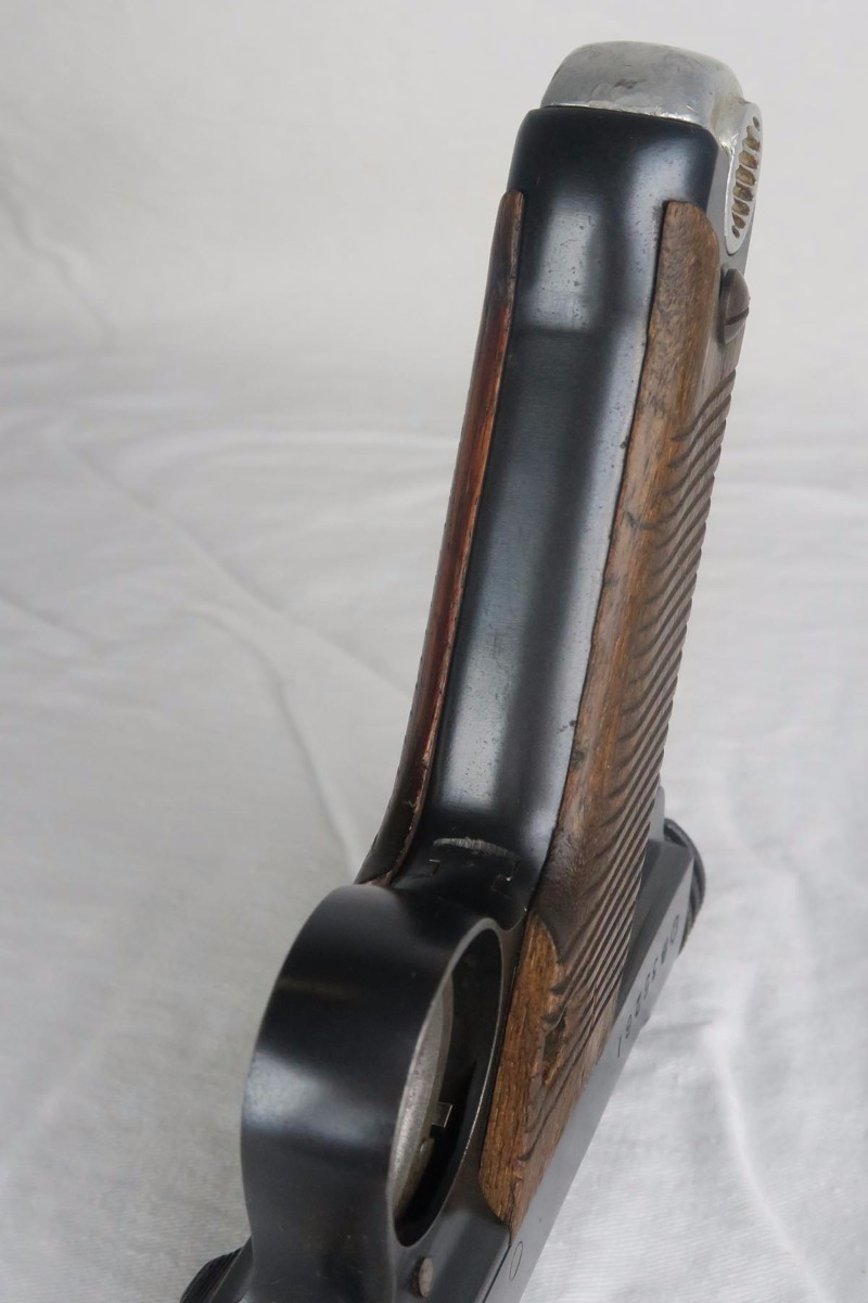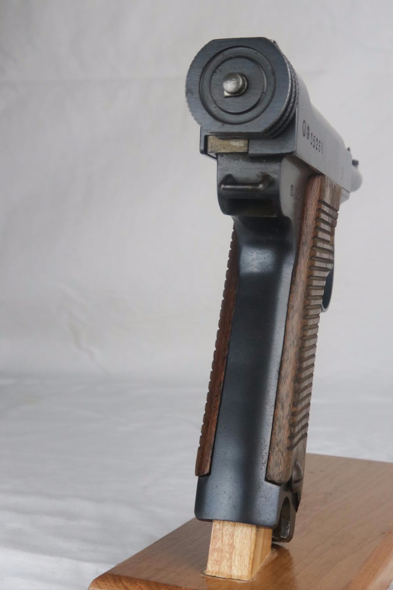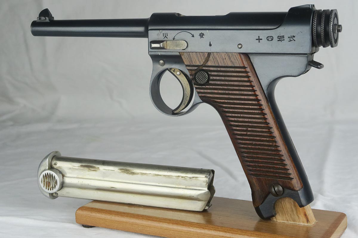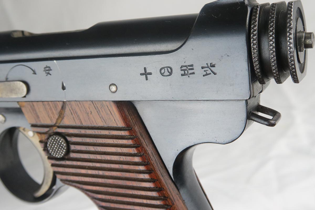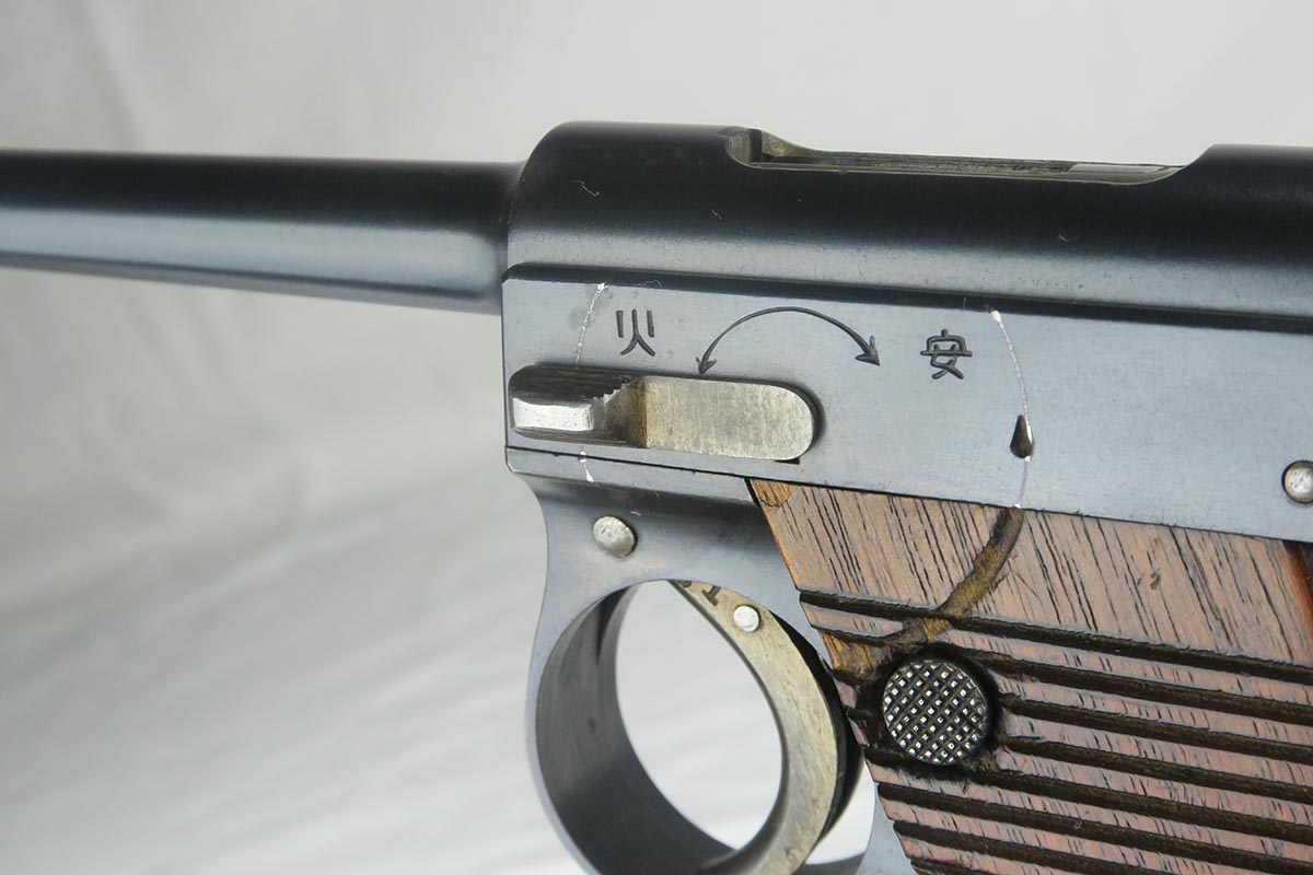 11/9/17- This is an early, near-mint Type 14 Nambu from August of 1937. The finish is all original with only minor muzzle wear and some dings on the trigger guard. Magazine is not matching but is correct, early nickel. Grips are hand numbered to match the pistol. Excellent bore.