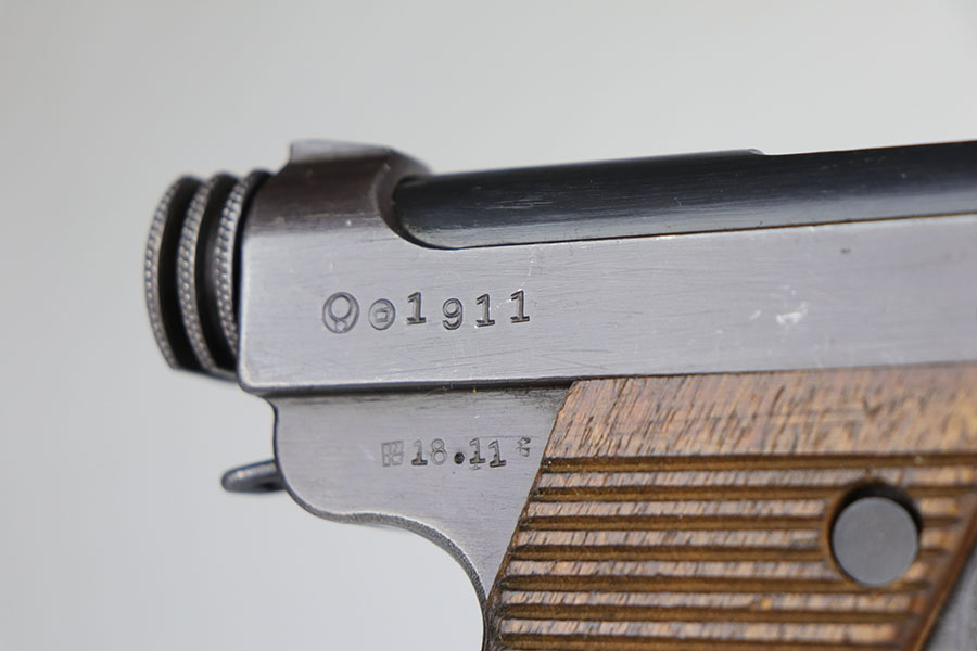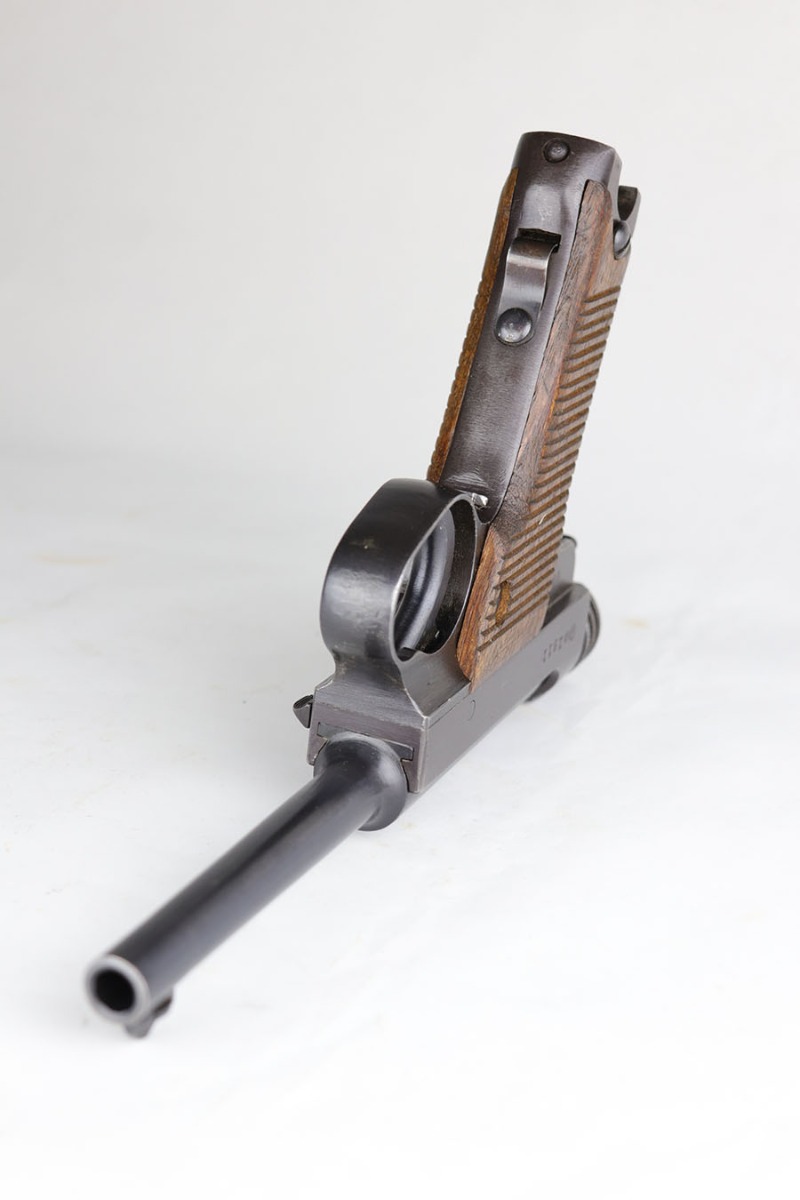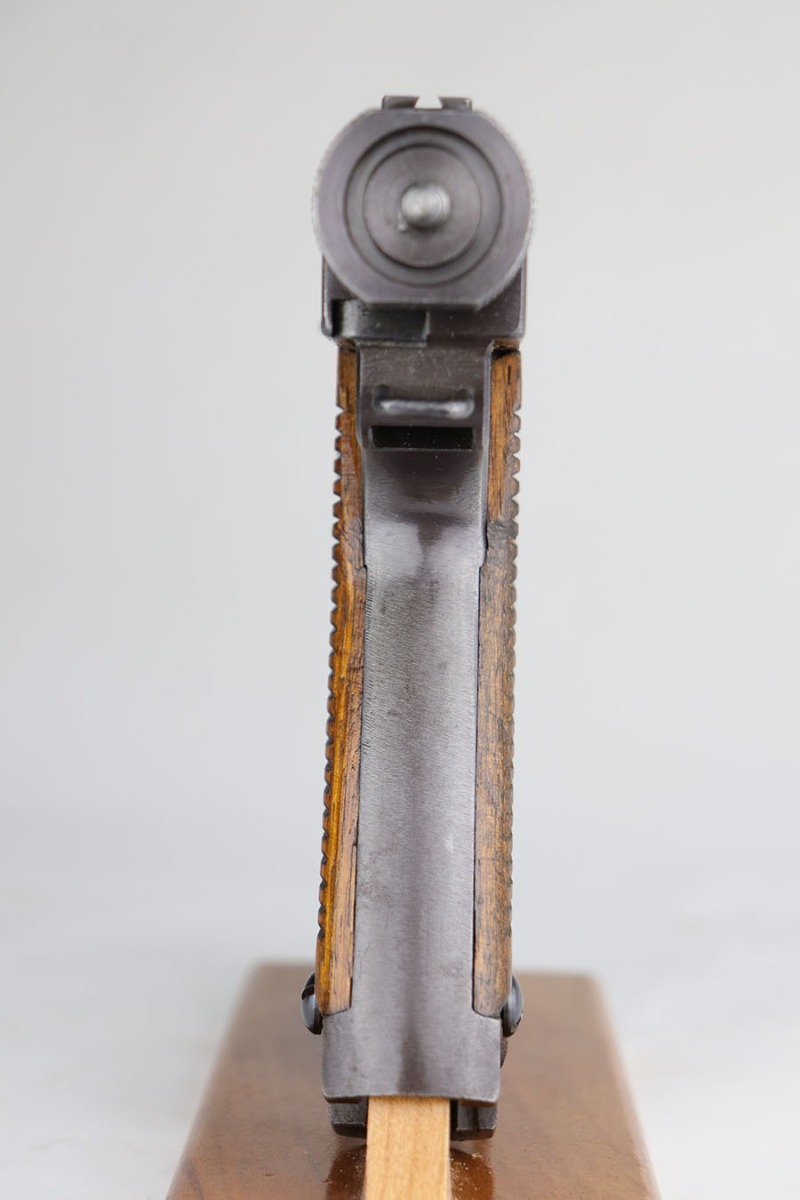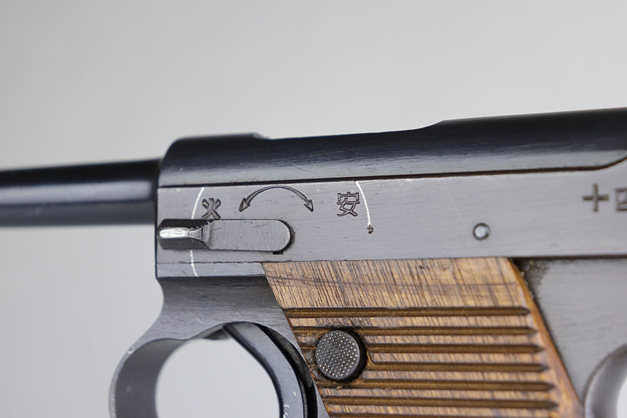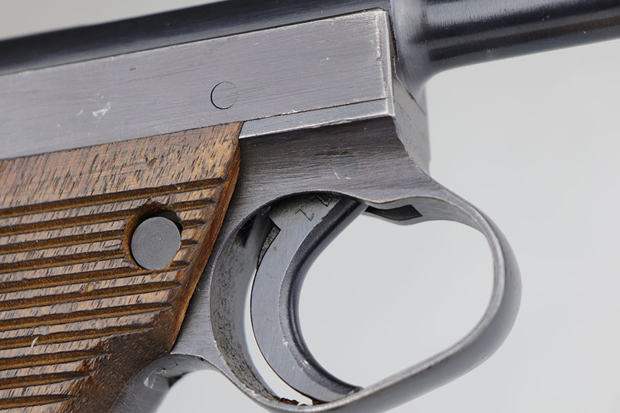 5/28/20 – This is a near-mint Type 14 Nambu from November of 1943. It was made at the Toriimatsu branch of the Nagoya arsenal in the second series run, and still has the original matching grips and magazine. Also has a cool serial! The bluing rates at 98-99% with just a bit of edge muzzle and frame wear. Mint bore and excellent grips.