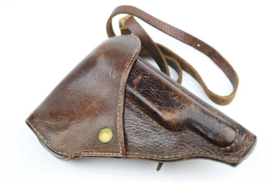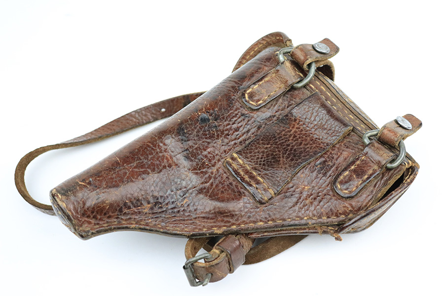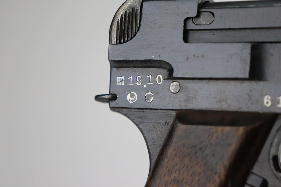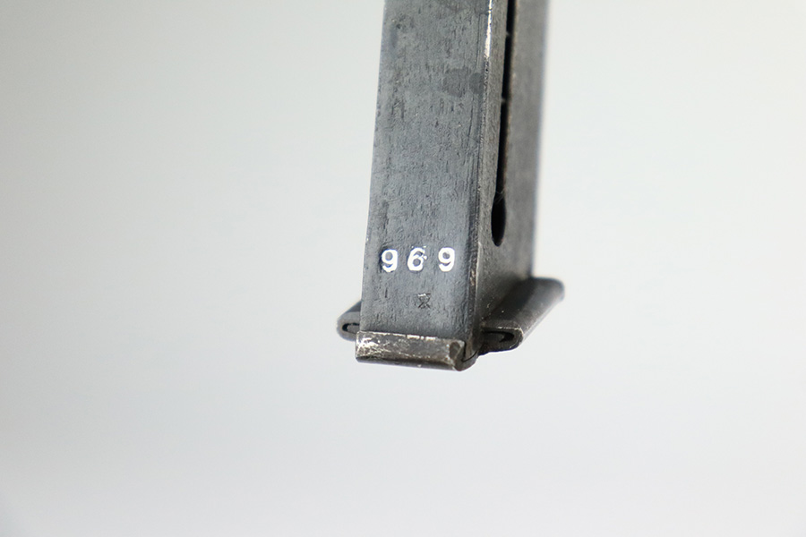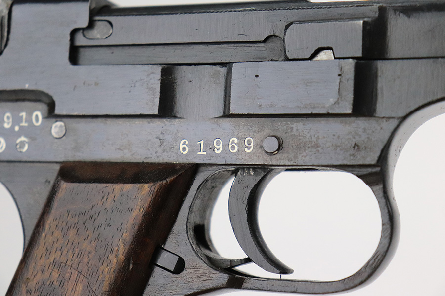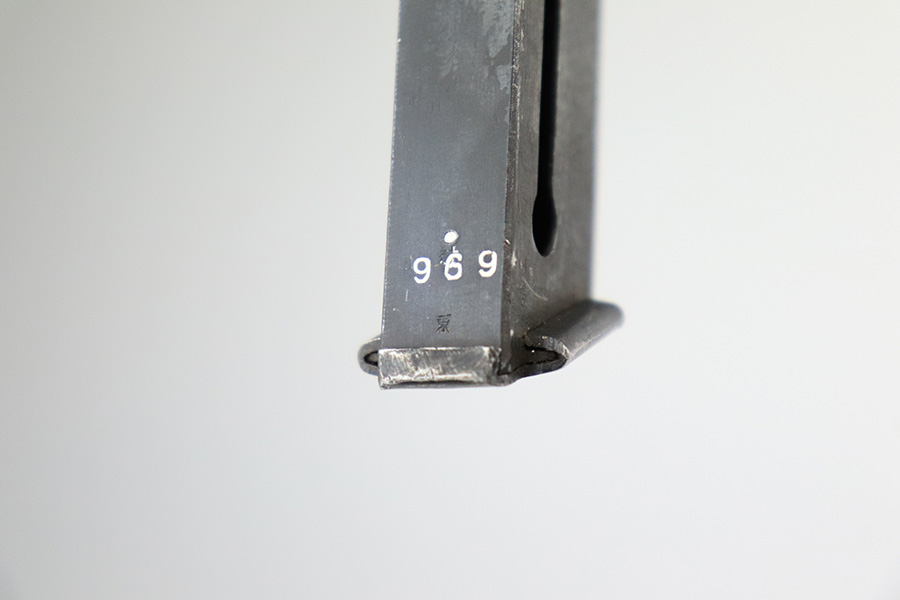 7/27/22 – This is a near-mint and complete Type Nambu rig with shoulder holster and both of the original, matching magazines. The pistol was made in October of 1944 at the Kokobunji branch of the Nagoya Arsenal. It has 98-99% of the original blue, with just a bit of edge wear on the high points. Minty bore and nice slab grips. Comes with scarce shoulder holster complete with strap. There’s obviously age and handling wear to both the strap and holster, but it’s structurally sound.
