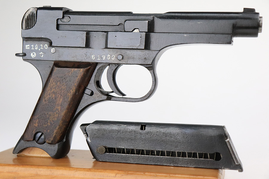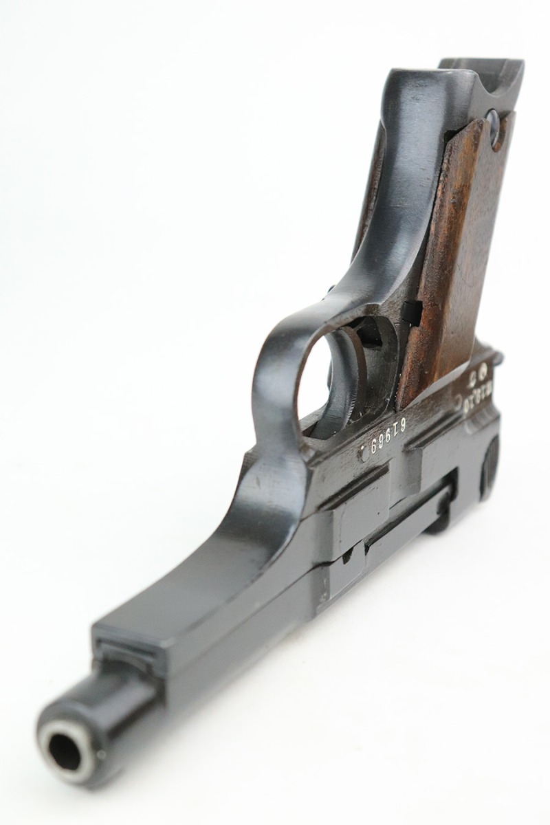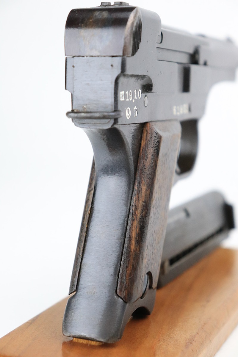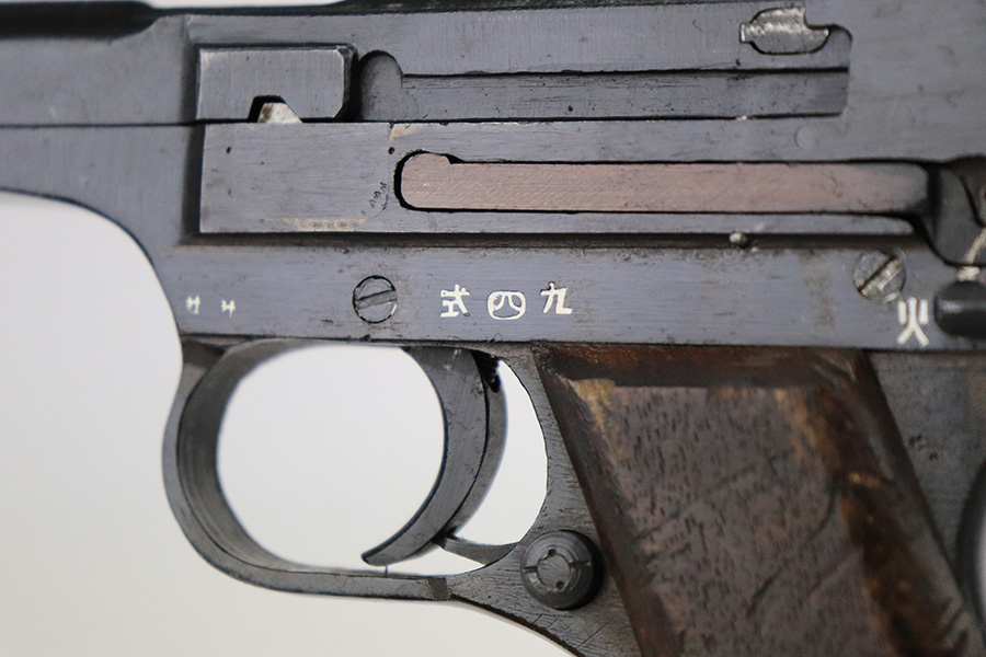 7/27/22 – This is a near-mint and complete Type Nambu rig with shoulder holster and both of the original, matching magazines. The pistol was made in October of 1944 at the Kokobunji branch of the Nagoya Arsenal. It has 98-99% of the original blue, with just a bit of edge wear on the high points. Minty bore and nice slab grips. Comes with scarce shoulder holster complete with strap. There’s obviously age and handling wear to both the strap and holster, but it’s structurally sound.