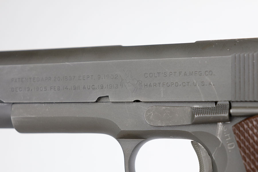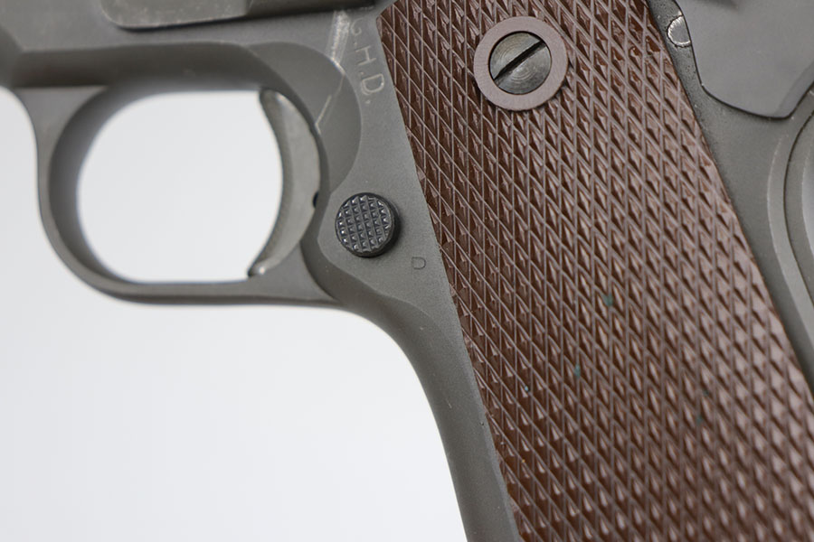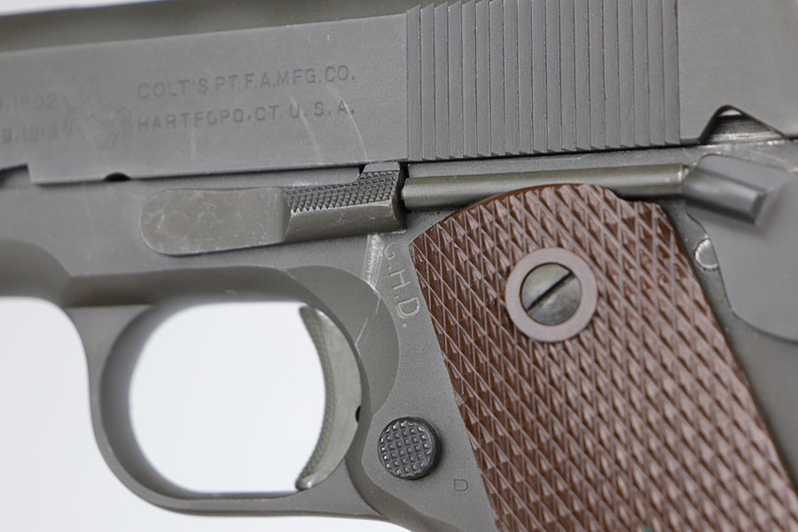5/19/20 – This is an excellent example of a M1911A1 Colt from World War II. It was manufactured in 1944 and has about 98% of its original finish. All parts are matching and it has a correct Colt barrel. It is G.H.D. (Guy H. Drewery) inspector marked. Correct grips and WW2 magazine. Mint bore.