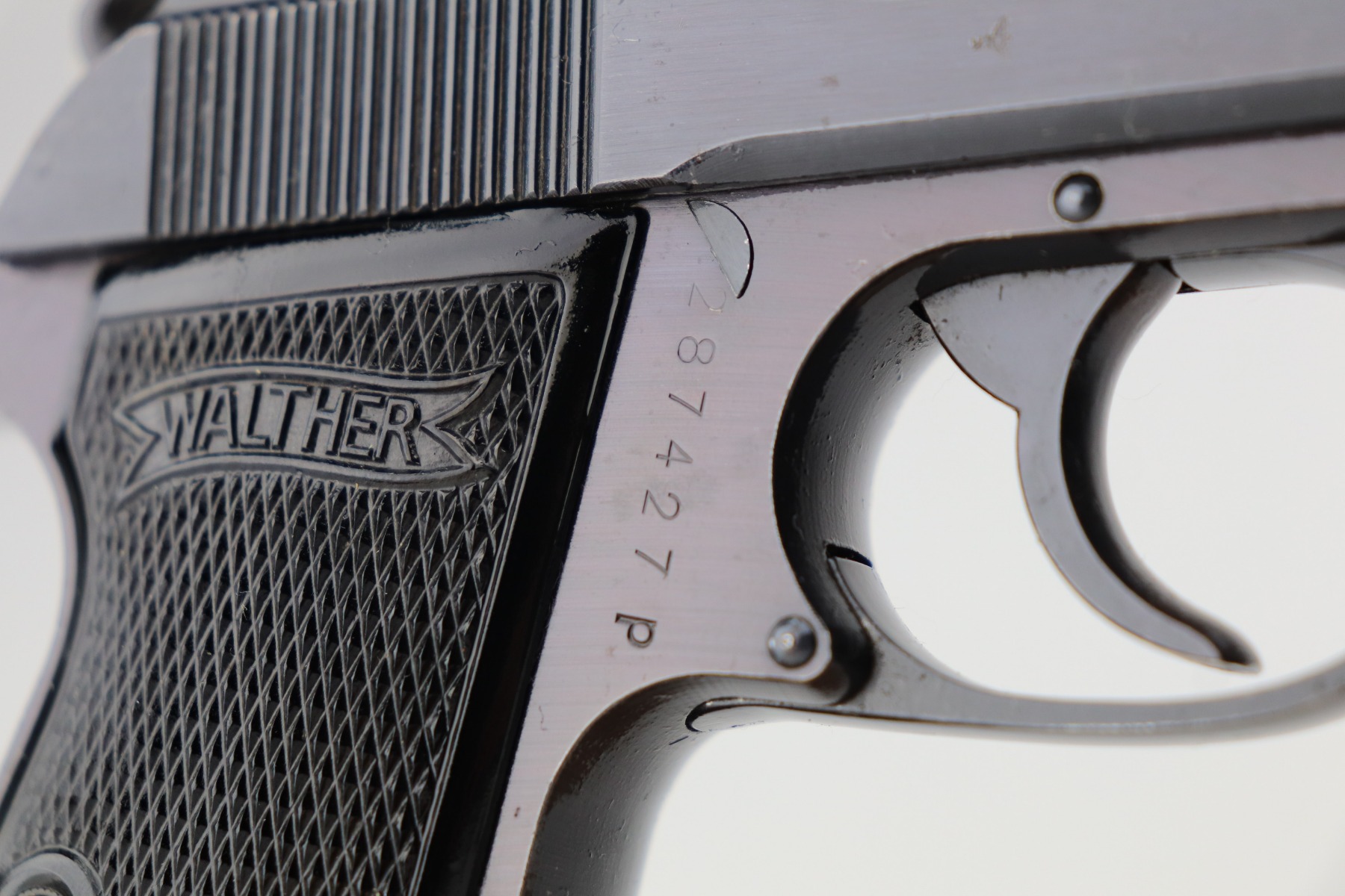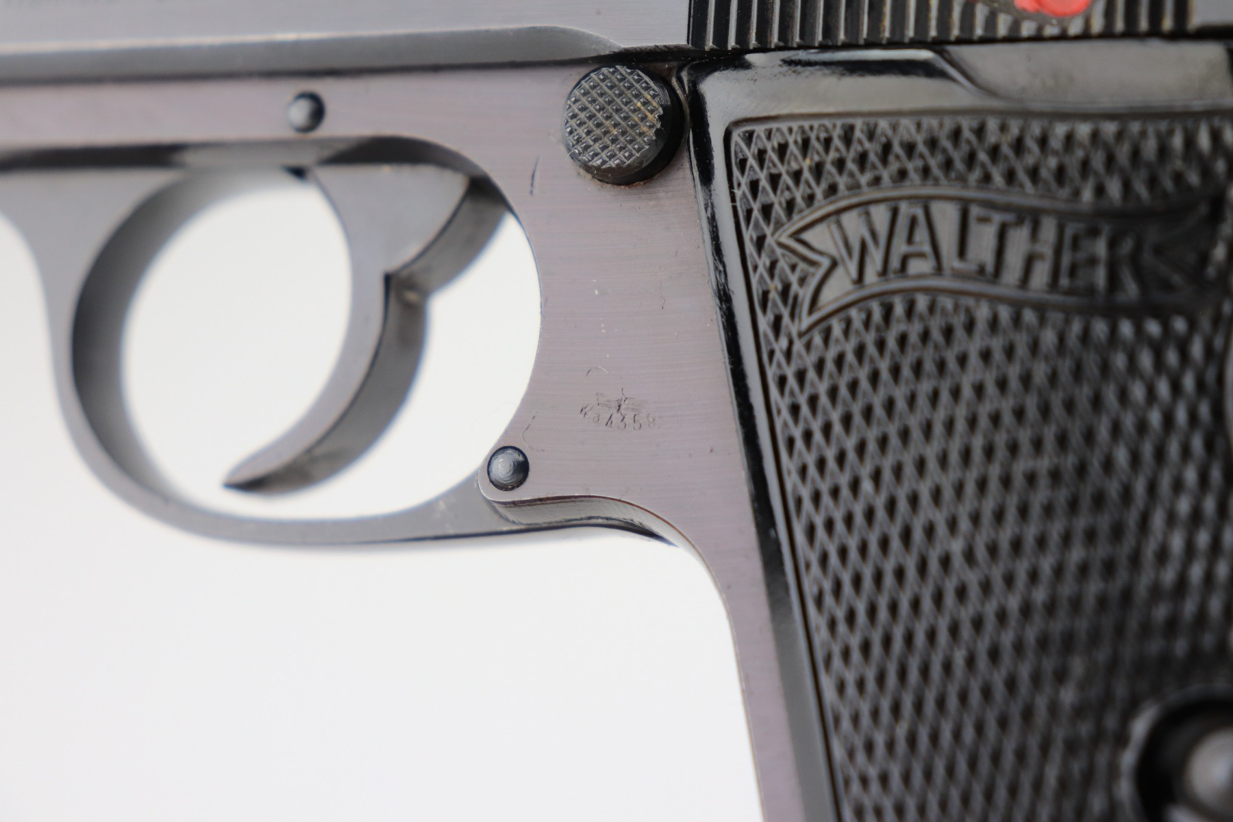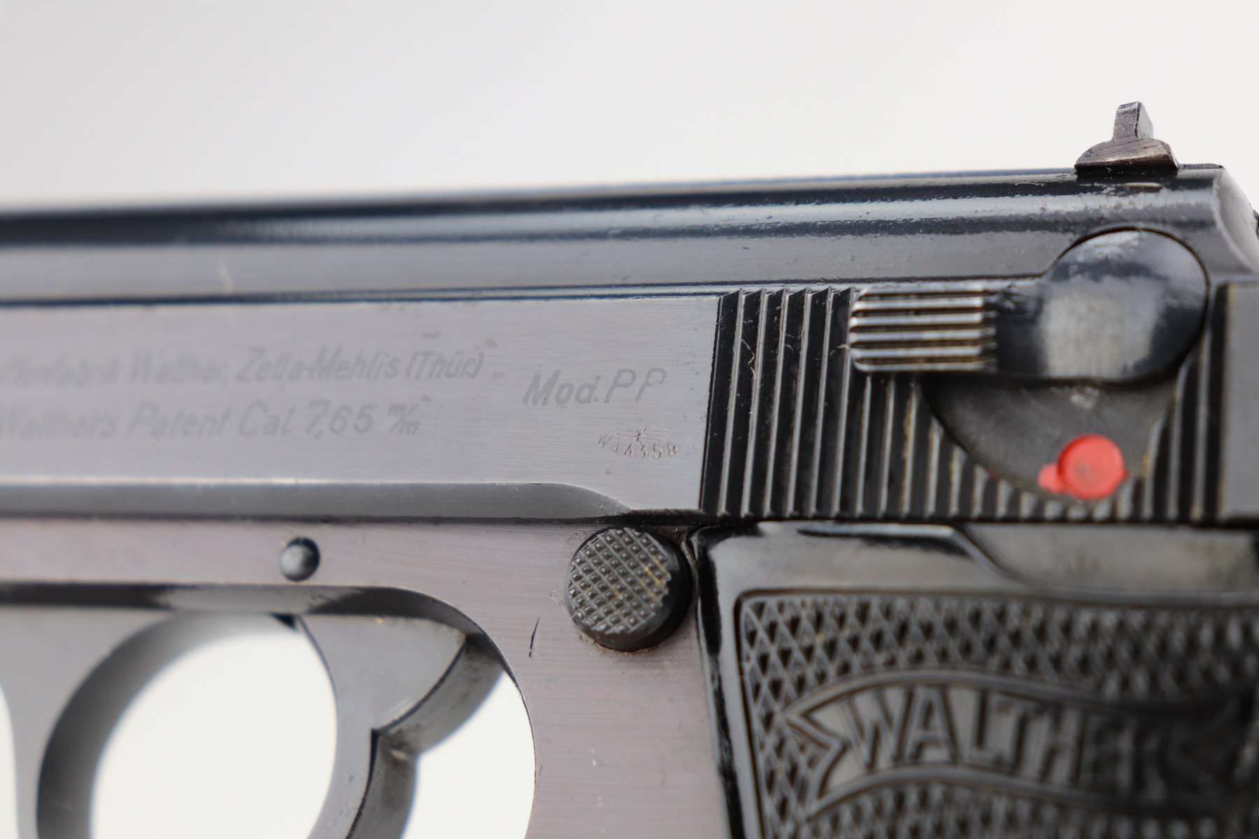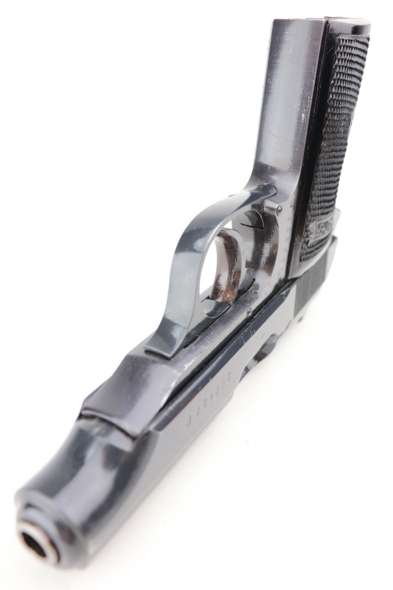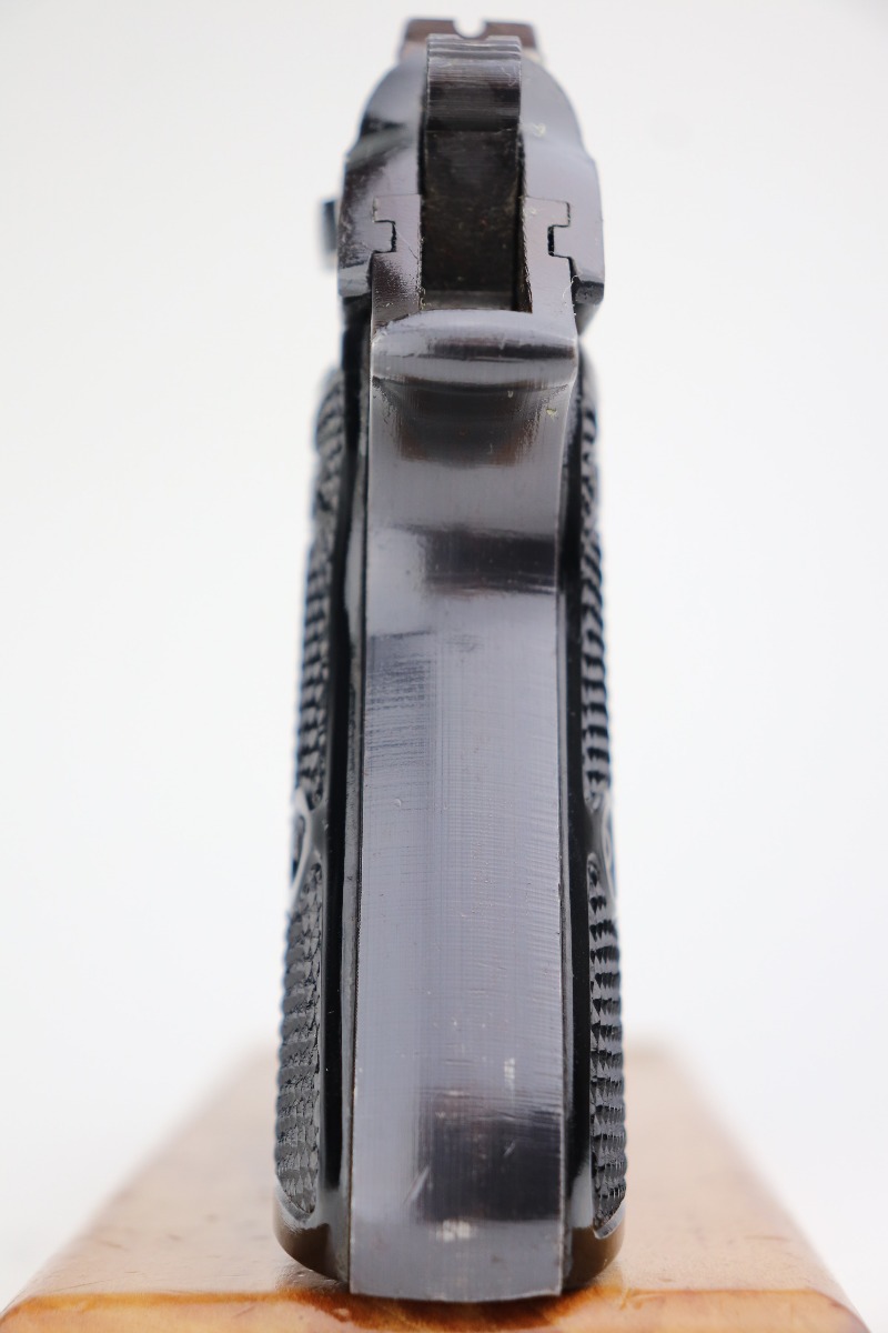 2/25/21 – This is a minty example of a Walther PP issued to the Nazi military in 1942. It is all matching and has the proper “Waffen 359” military proofs. It is in minty condition, retaining about 98% of its original bluing. There is just a hint of wear around the muzzle and a few very light handling marks on the straps. There is one small area of very minor freckling on the right side of the slide. Two very light surface scratches in the same area. It comes with excellent grips and a very neat magazine. The magazine features a factory error – it was originally stamped 9mm but changed to 7.65mm in the factory. The finger extension bottom is reproduction. The bore is stone-mint.