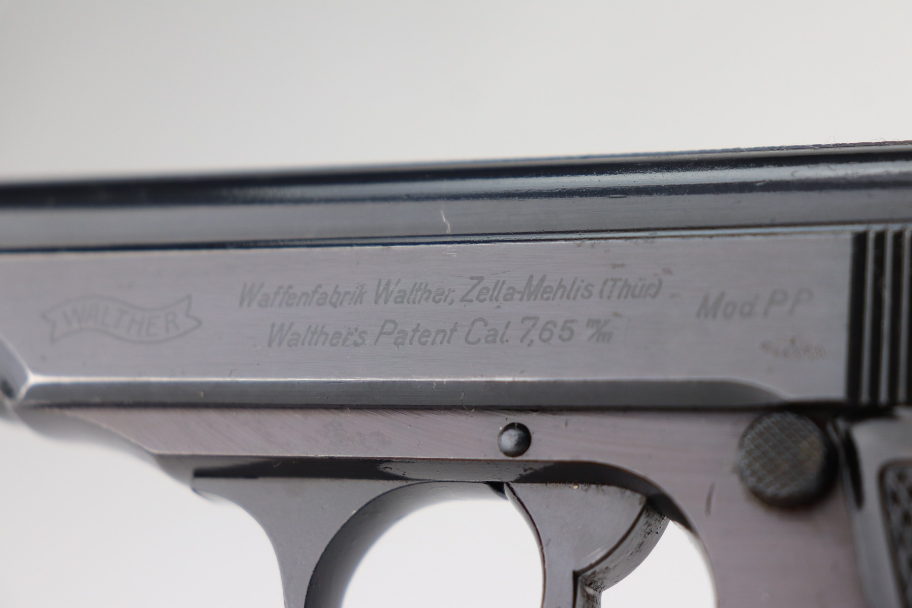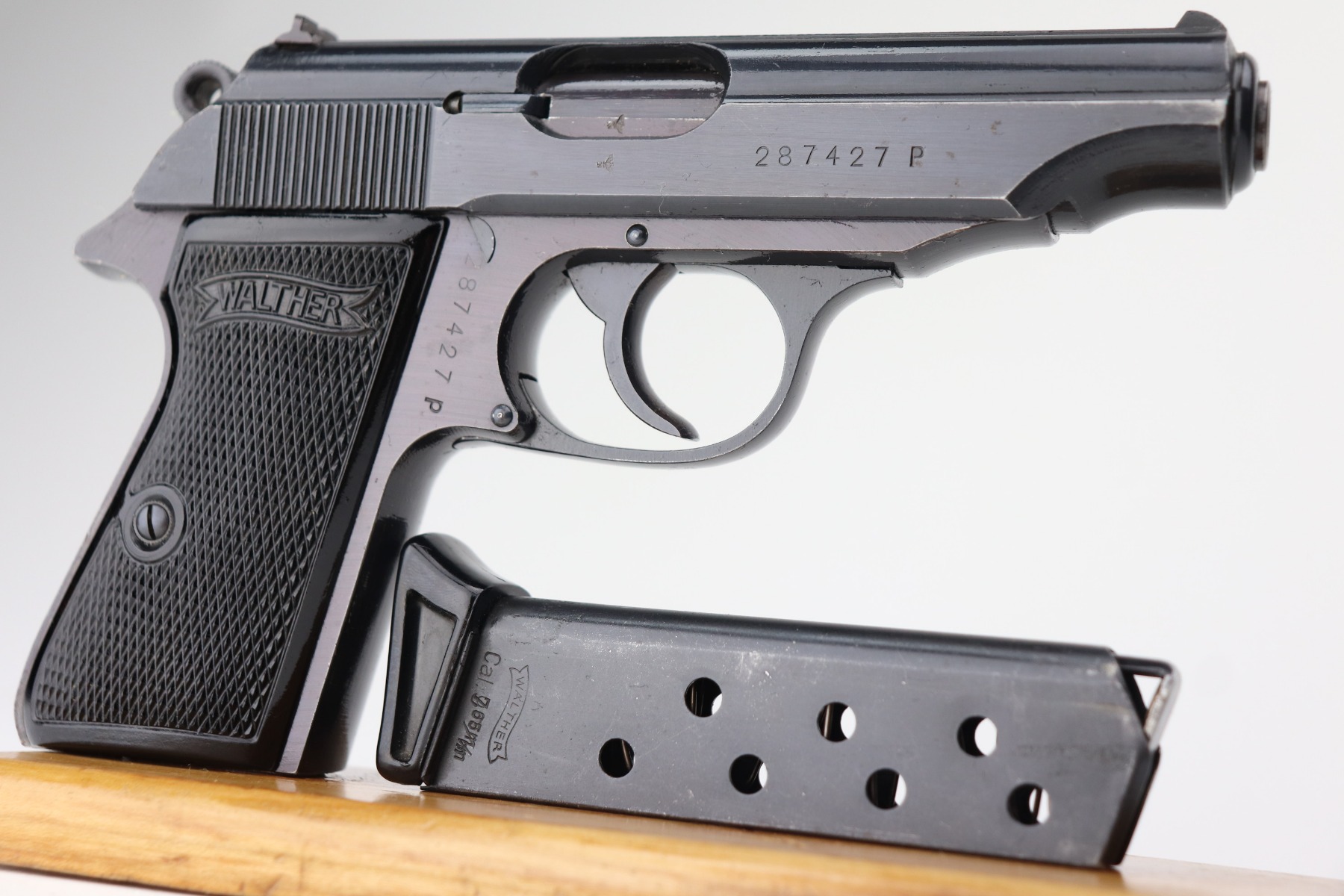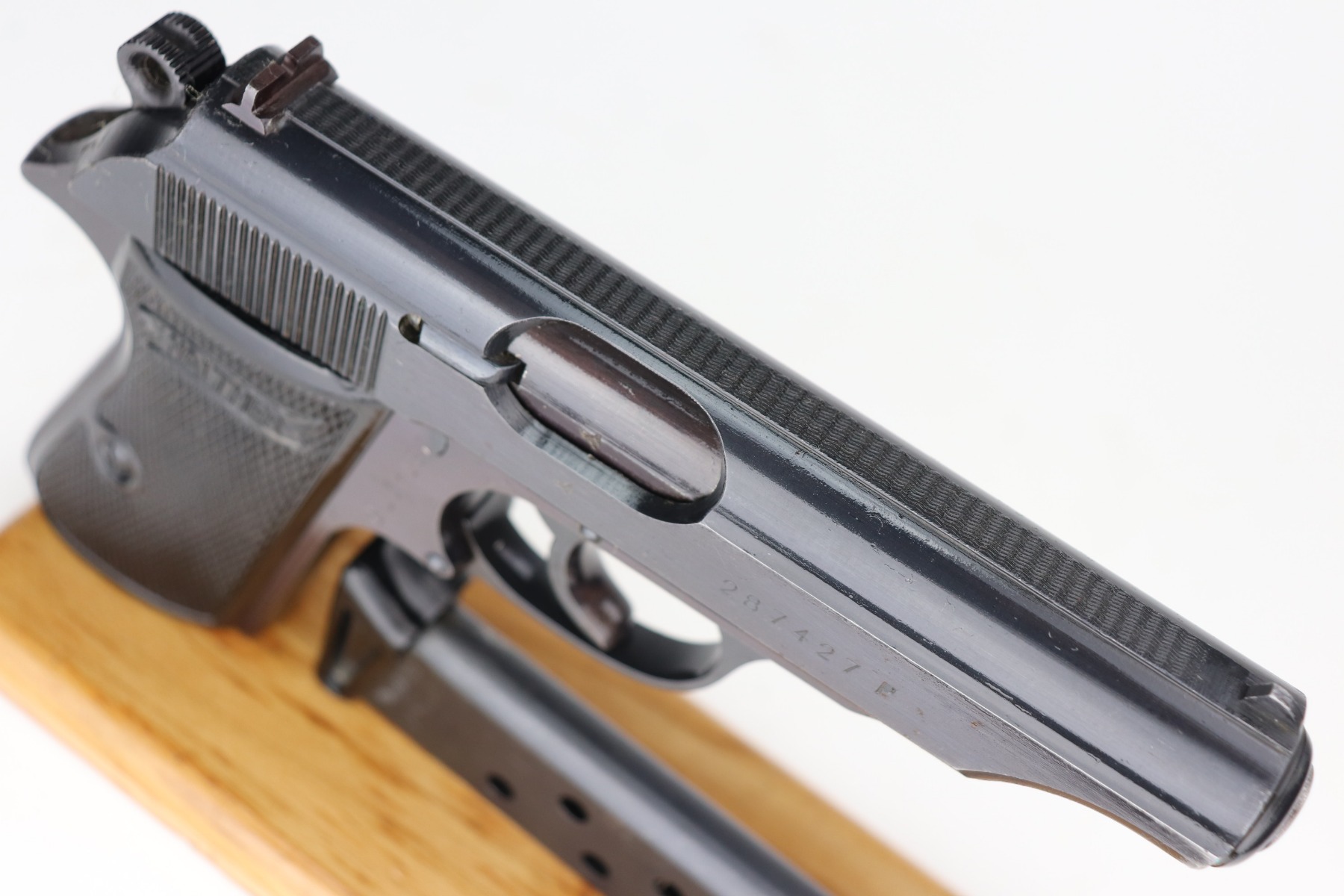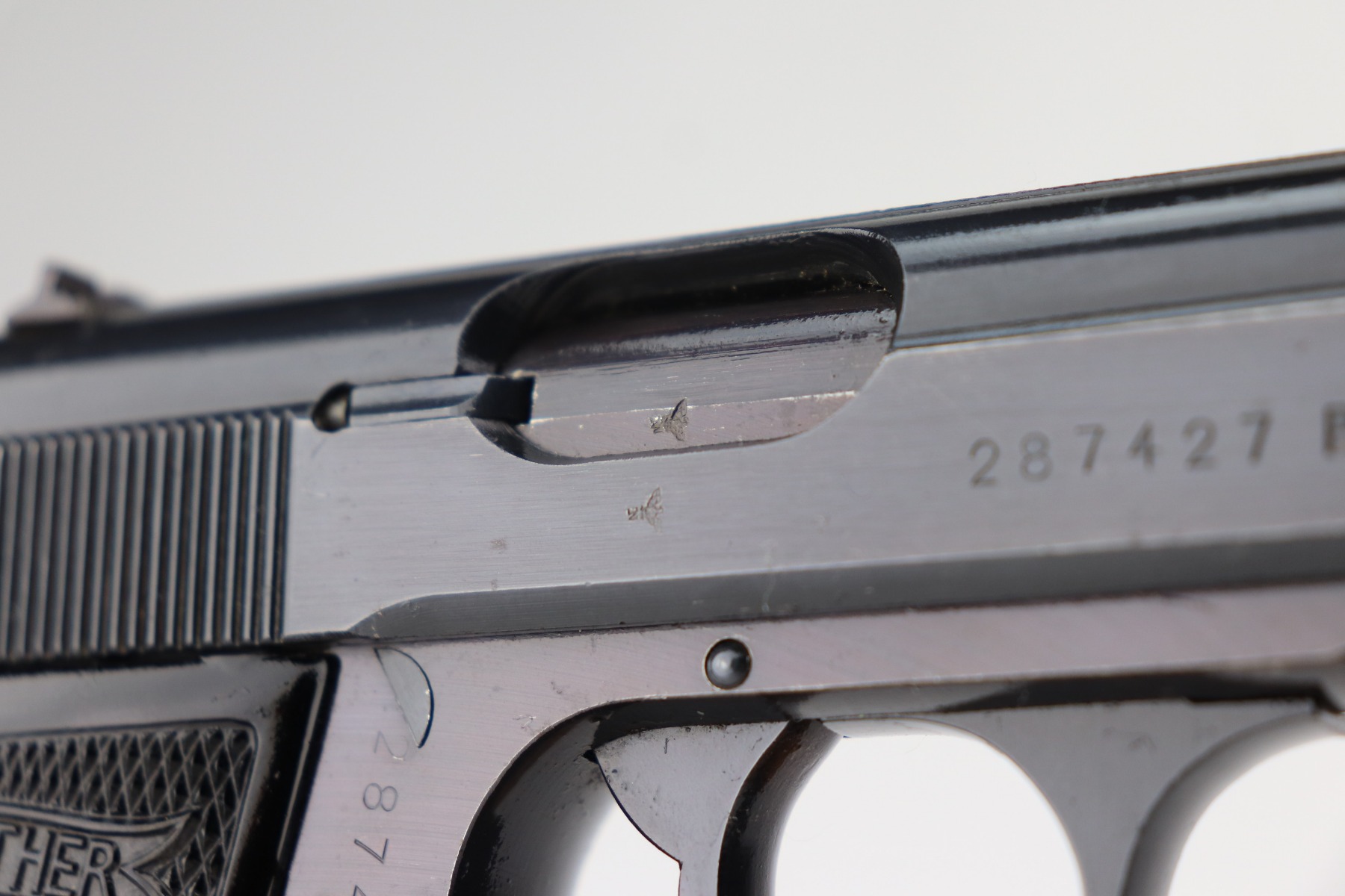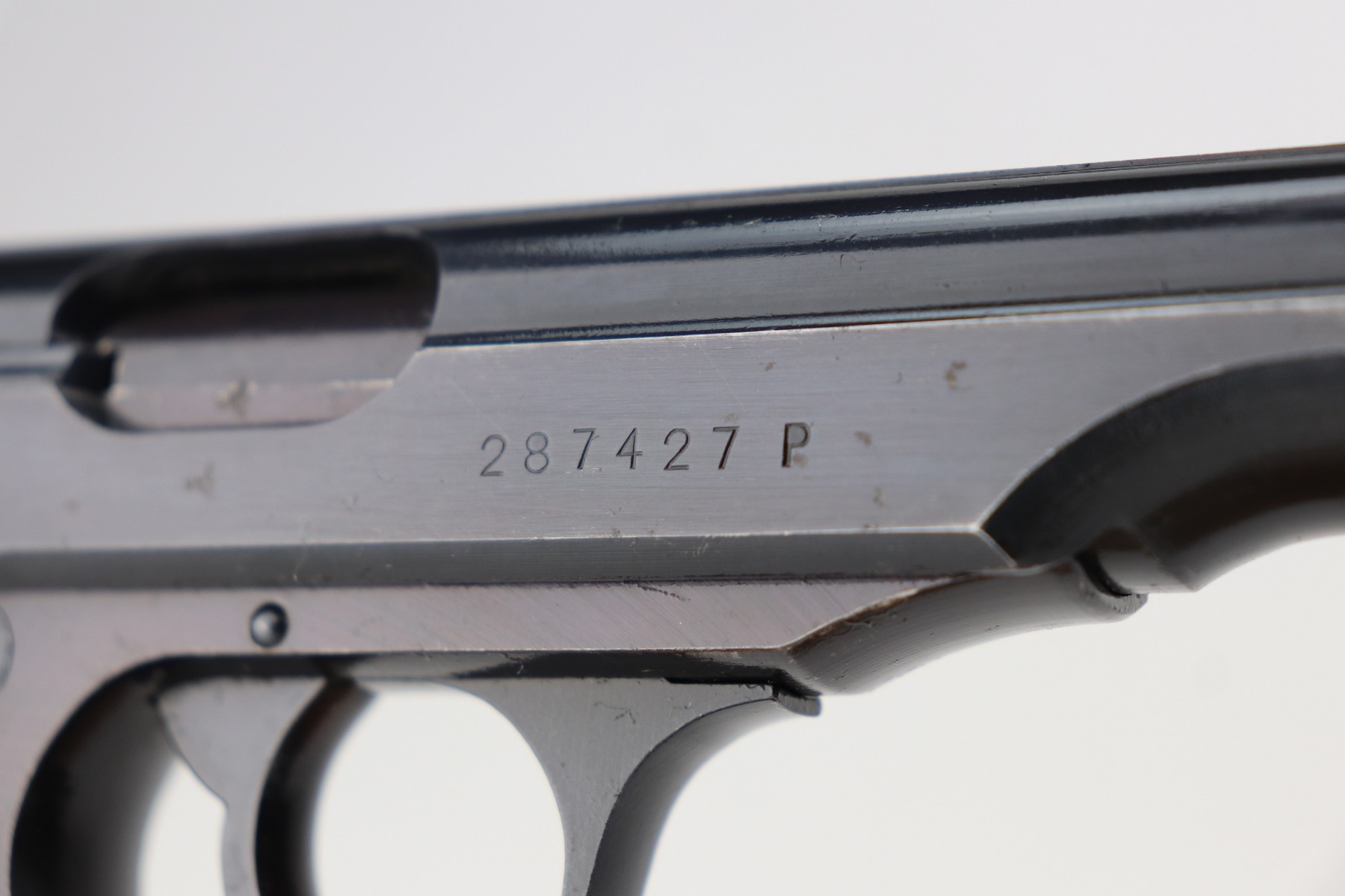 2/25/21 – This is a minty example of a Walther PP issued to the Nazi military in 1942. It is all matching and has the proper “Waffen 359” military proofs. It is in minty condition, retaining about 98% of its original bluing. There is just a hint of wear around the muzzle and a few very light handling marks on the straps. There is one small area of very minor freckling on the right side of the slide. Two very light surface scratches in the same area. It comes with excellent grips and a very neat magazine. The magazine features a factory error – it was originally stamped 9mm but changed to 7.65mm in the factory. The finger extension bottom is reproduction. The bore is stone-mint.