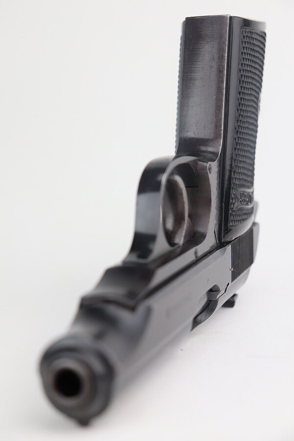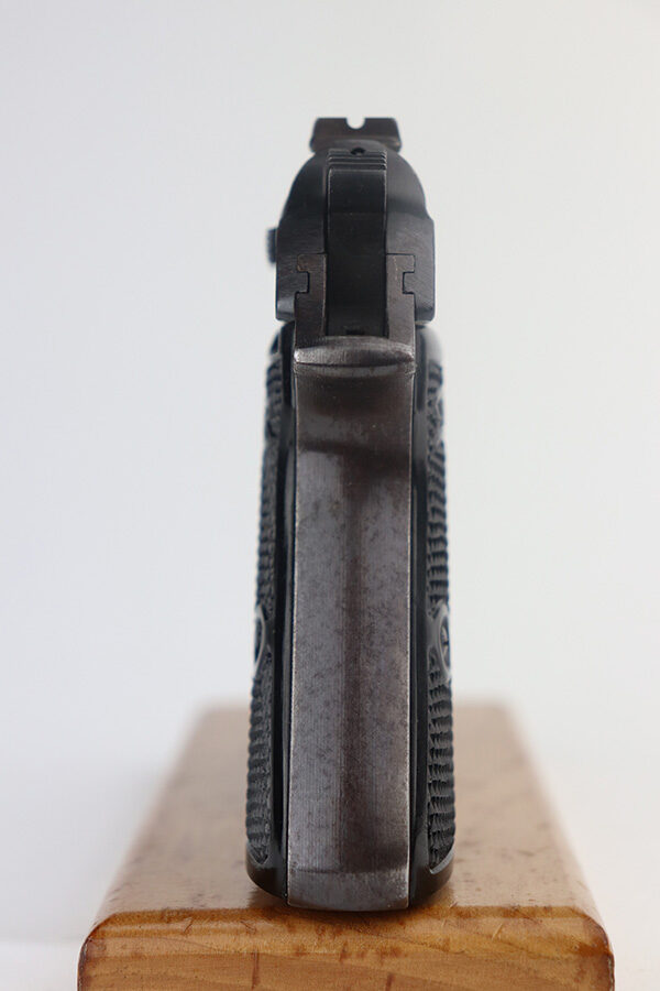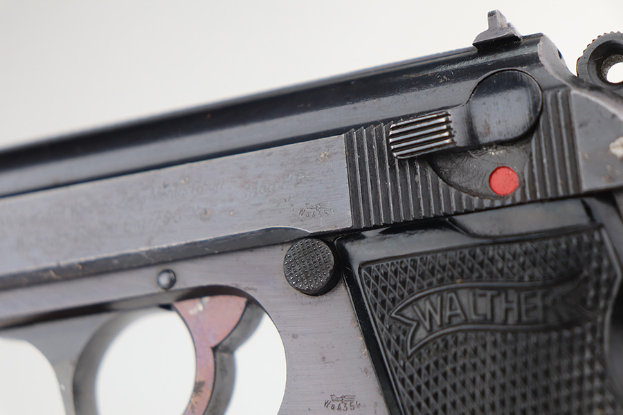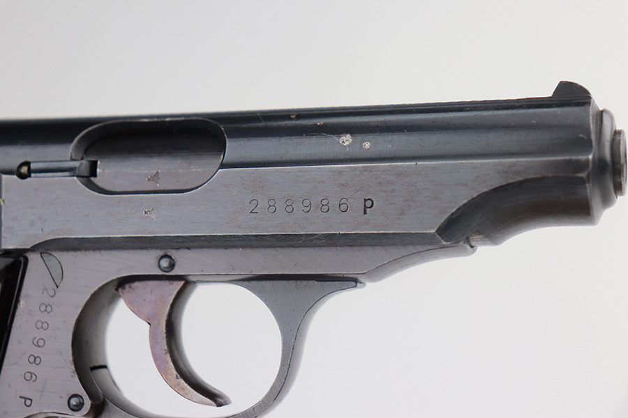 5/20/21 – This is a minty example of a Walther PP issued to the Nazi military in 1942. The gun is matching and has the proper “waffen 359” military proofs. The gun is minty, retaining about 98% of its original finish. There are tiny micro scratches on the left side of the slide and small dots of discoloration on the right side of the slide and near the tang. Some very light patina on the straps. Comes with excellent grips and a banner-only magazine. Mint bore.