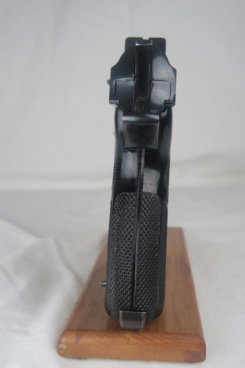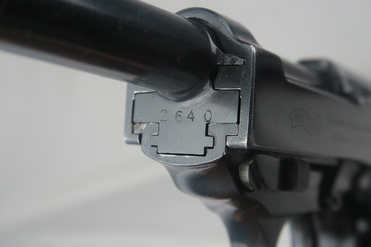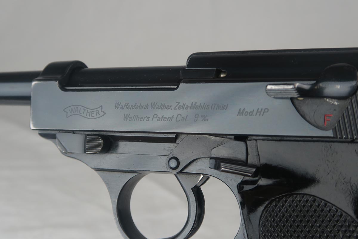 8/18/17 – This a rare, early Walther Mod HP P.38 in near-mint condition.  The pistol is all correct, original and matching.  High-polish bluing rates at 98+% with only minor edge wear and a few minor scratches.  Correct, excellent grips and two proper commercial magazines.  Eagle/N proofs on slide and frame.  Excellent bore and mechanical function.  This is a consignment item, with price set by the consignor.