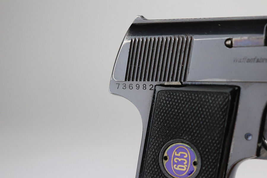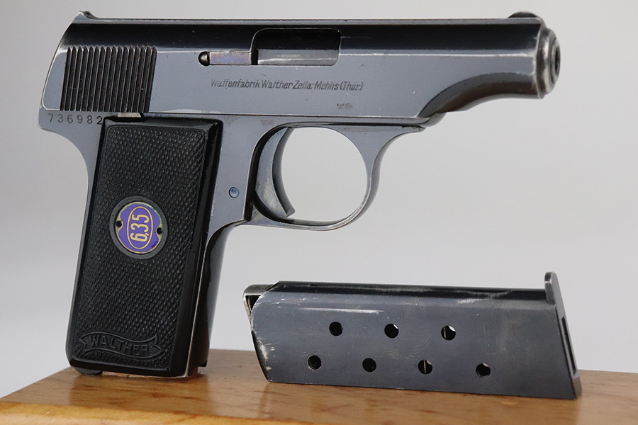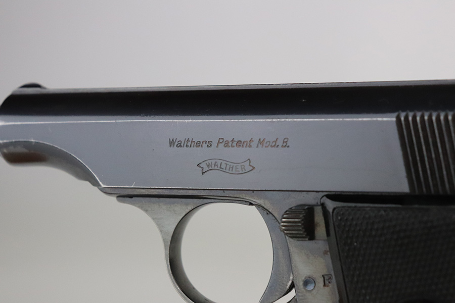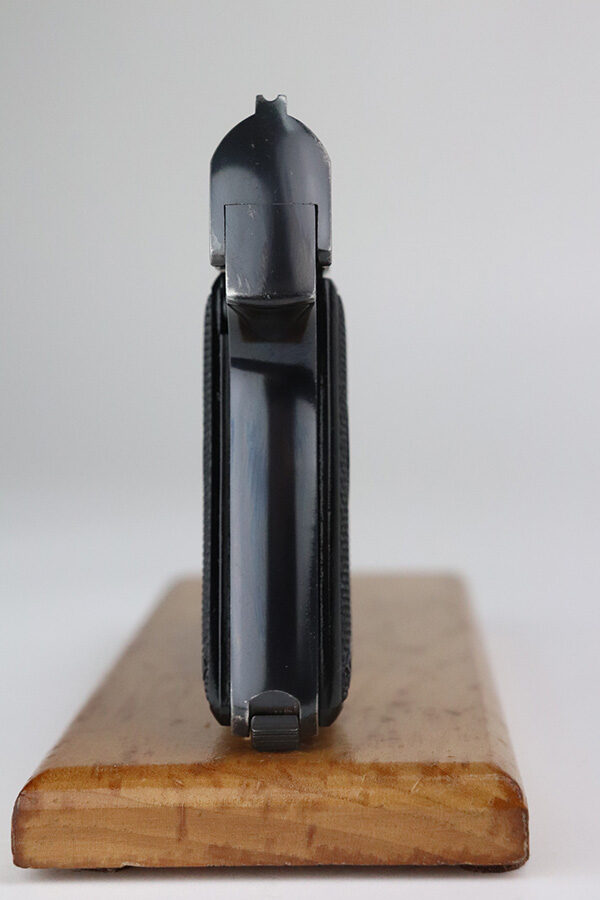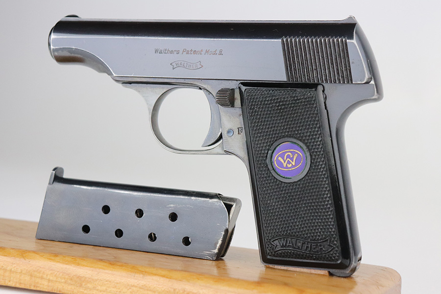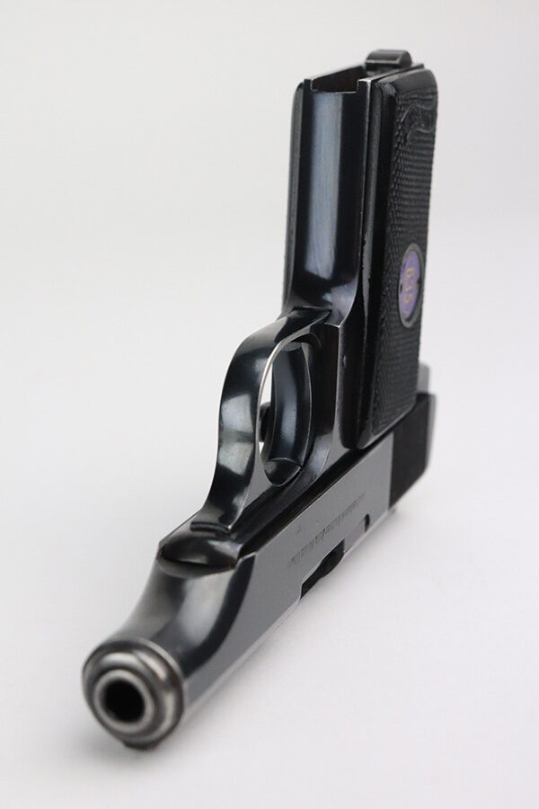 7/27/21 – This is a minty example of a Walther Model 8, chambered in .25. The gun is all correct and has retained about 98% of its original finish. There are just hints of wear on some of the high edges and a few very light scratches and handling marks here and there. Comes with excellent grips and one proper magazine. The bore is shiny with strong rifling. It would be mint except for a very slight bulge.