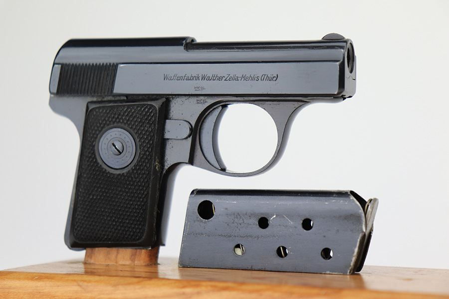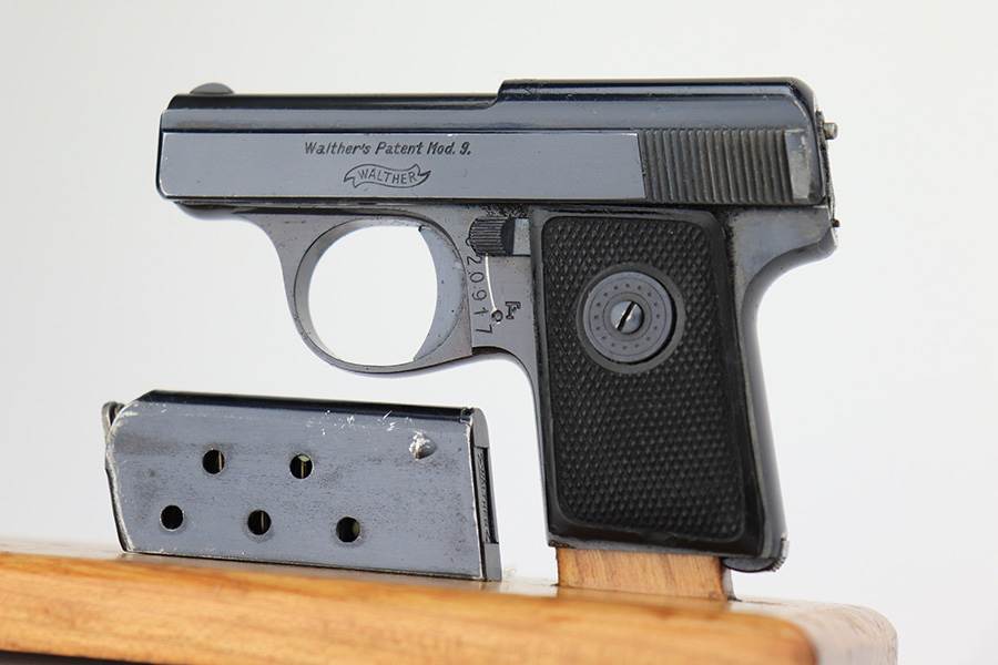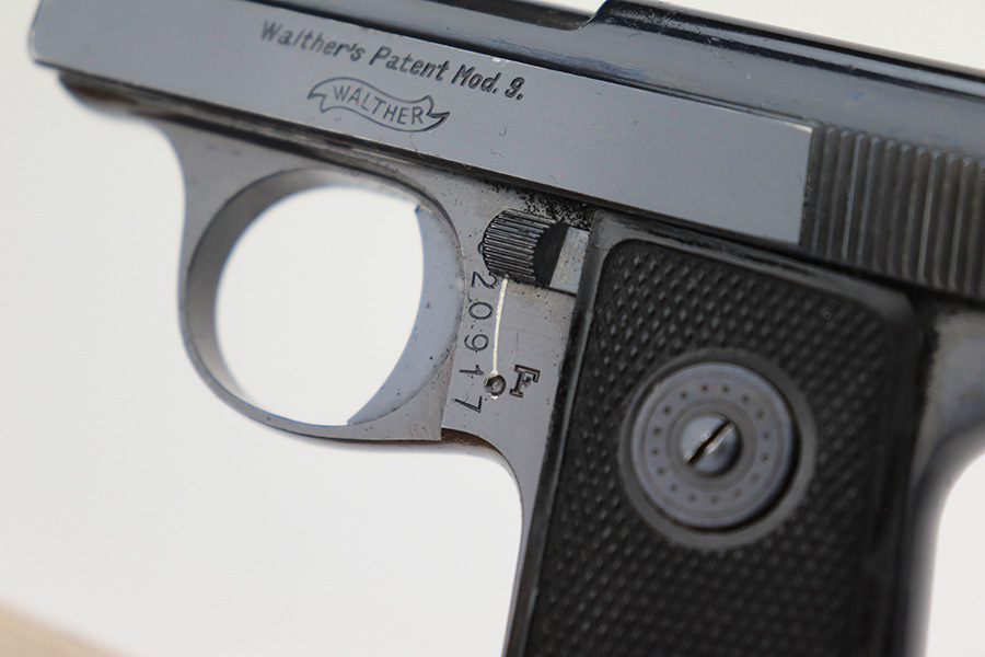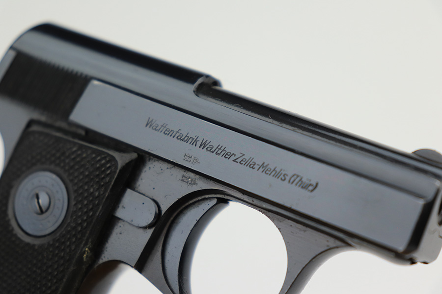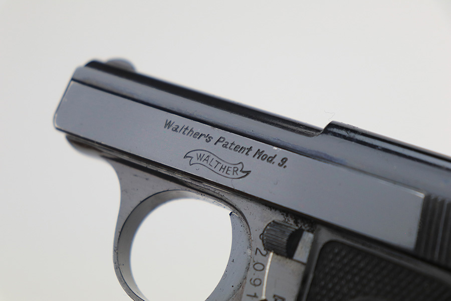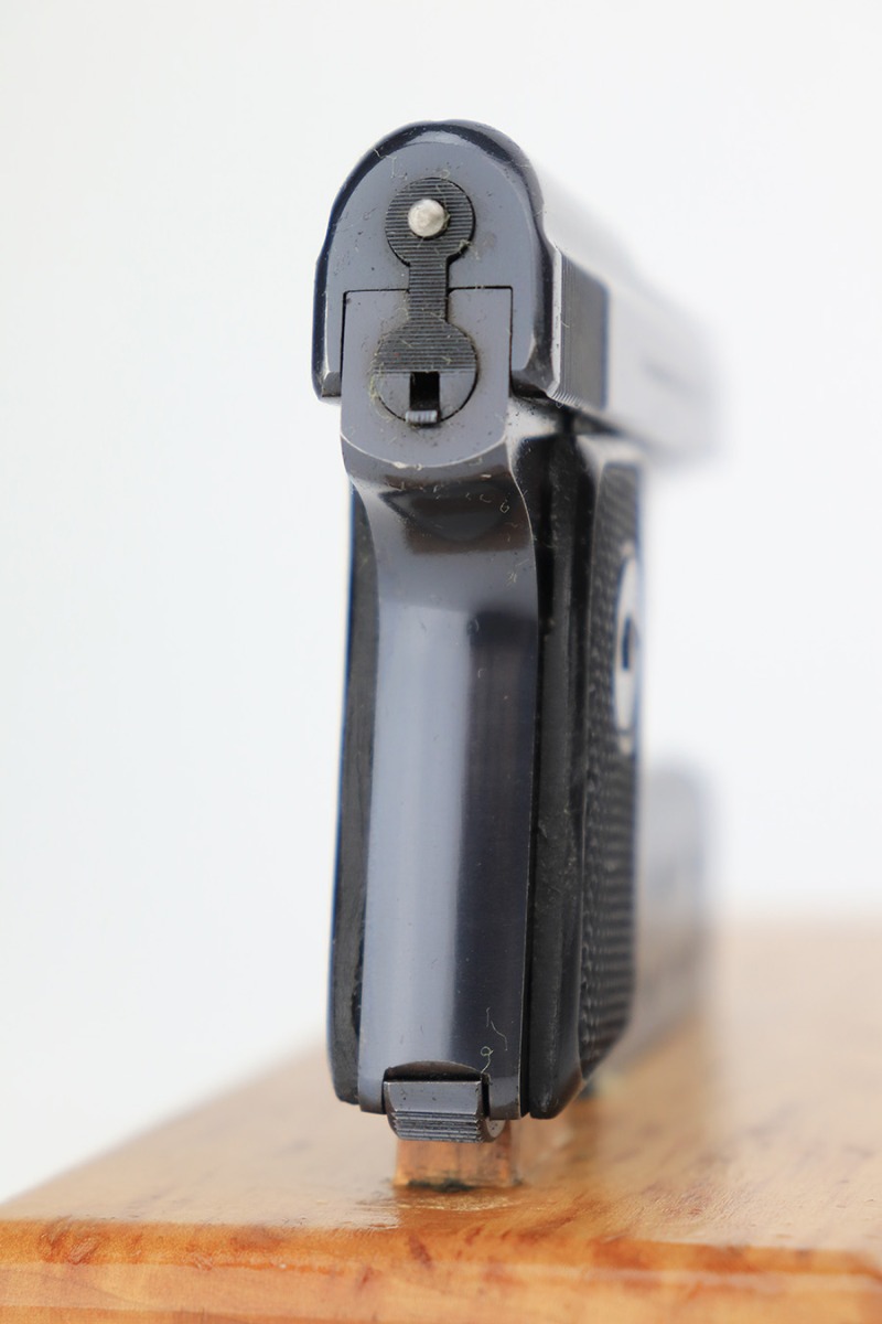 4/20/23 – This is a near-mint example of a 2nd Generation Walther Model 9 manufactured in the early 1930’s. It is all matching and has the proper “Crown N” proofs. It has retained nearly all of its original high polish finish with just hints of wear on some of the high edges. Fitted with a set of nice reproduction black plastic grips (the left panel is a little loose) and comes with a proper Walther banner magazine. Mint bore.