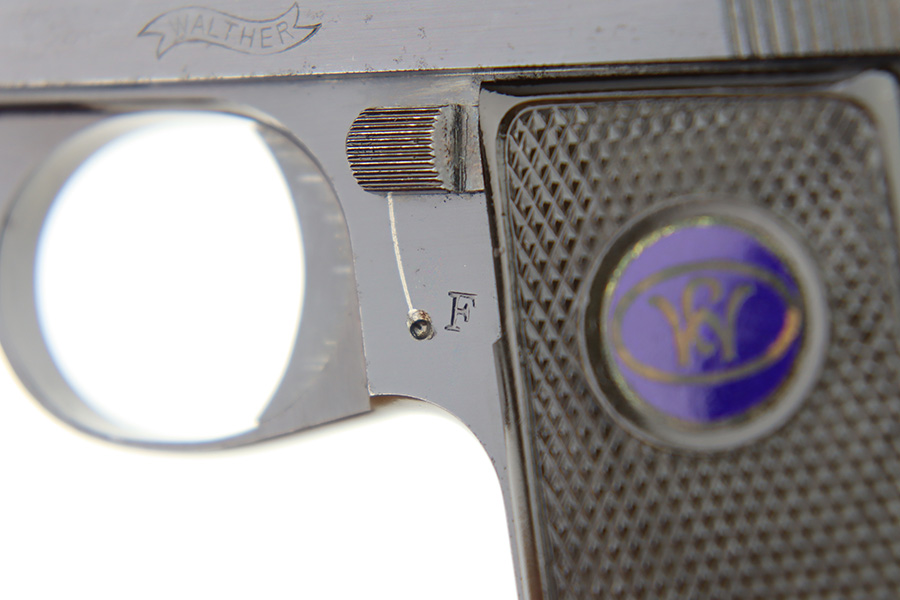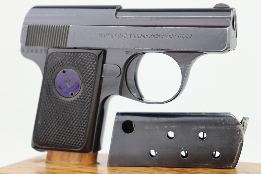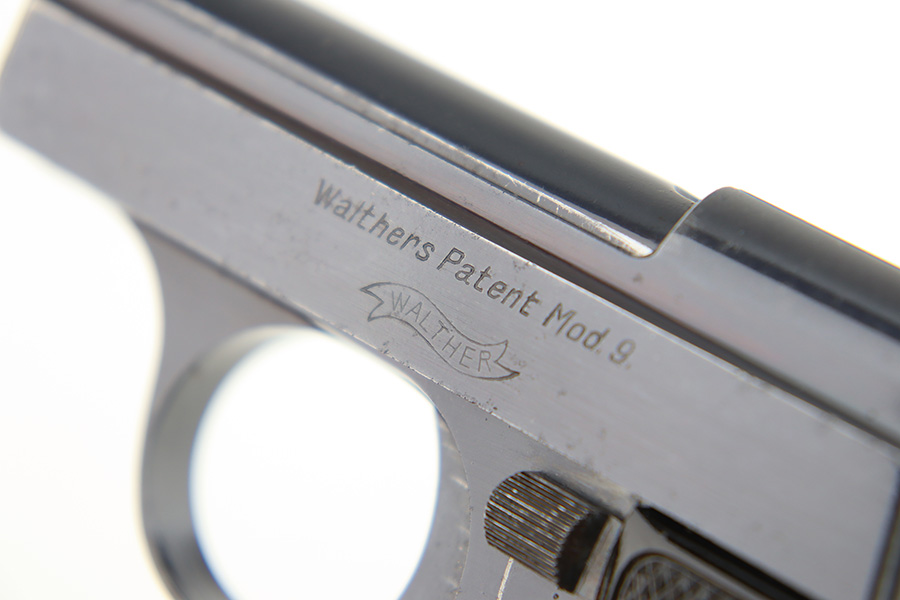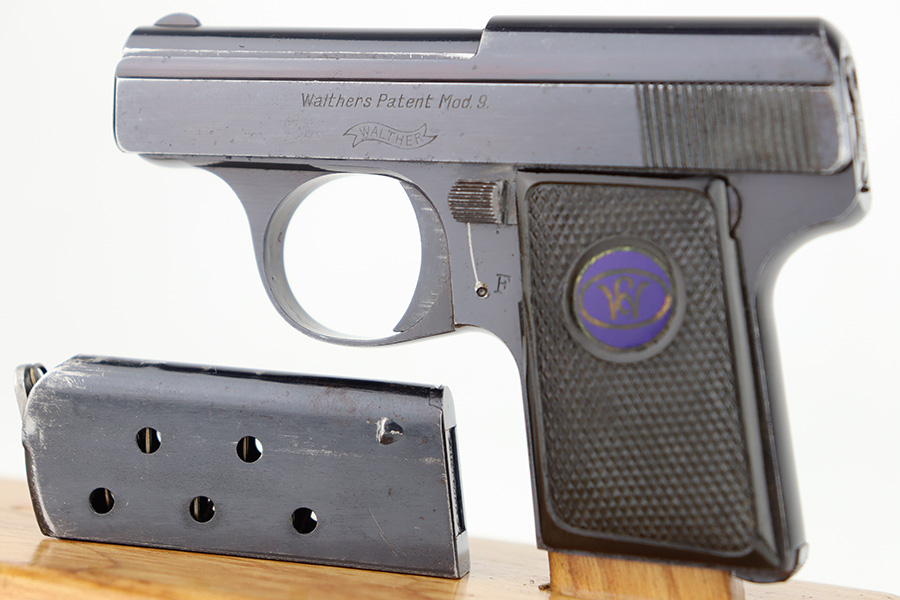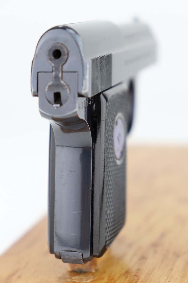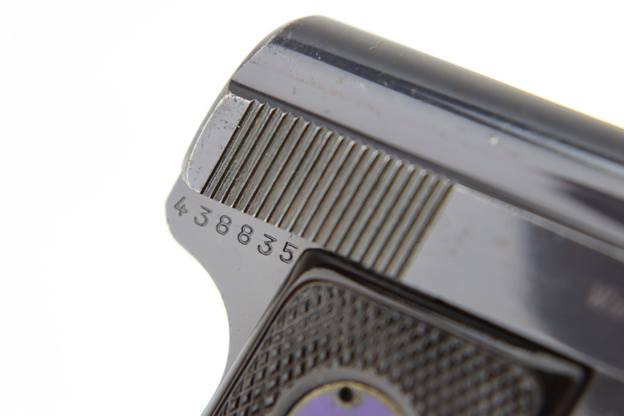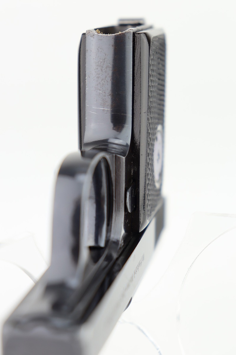 12/1/23 – This is a near-mint Walther Model 9 from the 1920’s. All matching and “Crown N” proofed. It has retained nearly all of its original finish with just hints of high edge wear and hints of freckling on the grip straps. Fitted with period-correct black bakelite grips – some tiny chipping on the right grip medallion. Excellent bore. Comes with one proper “Walther” marked magazine.