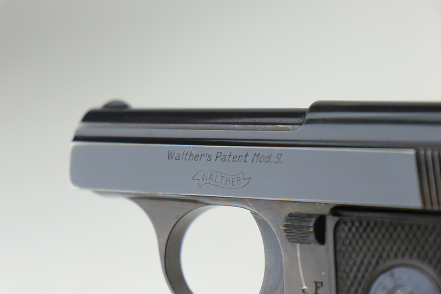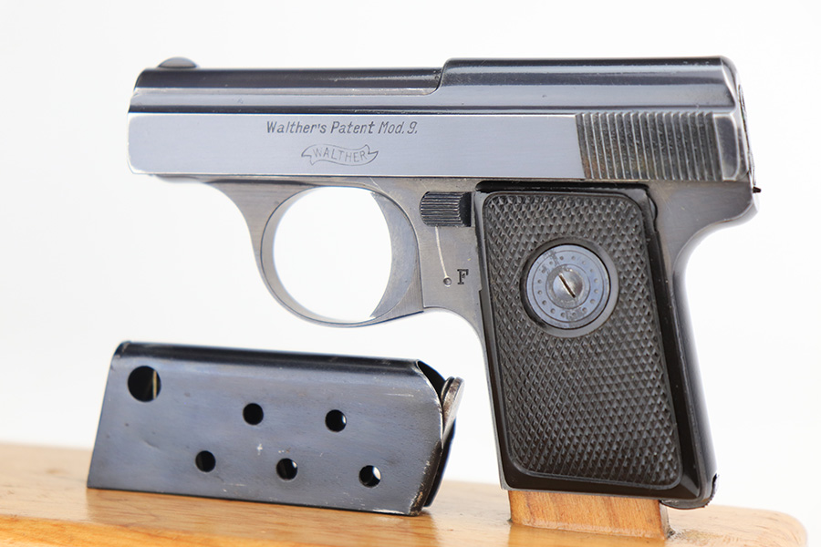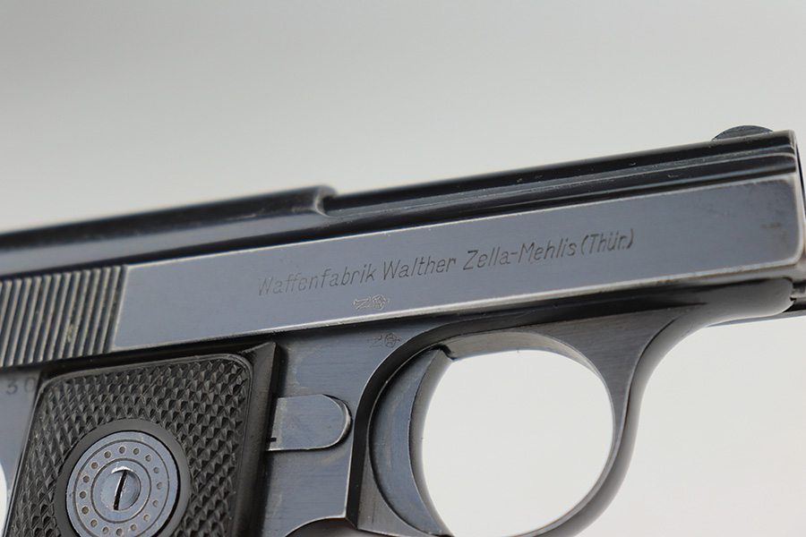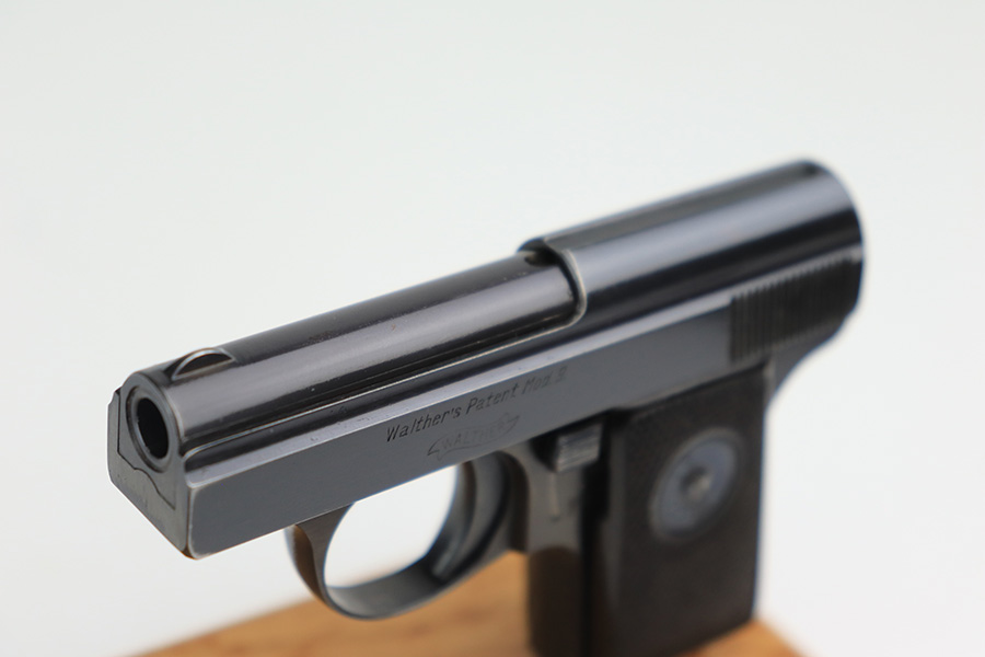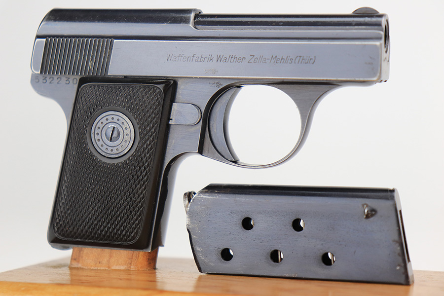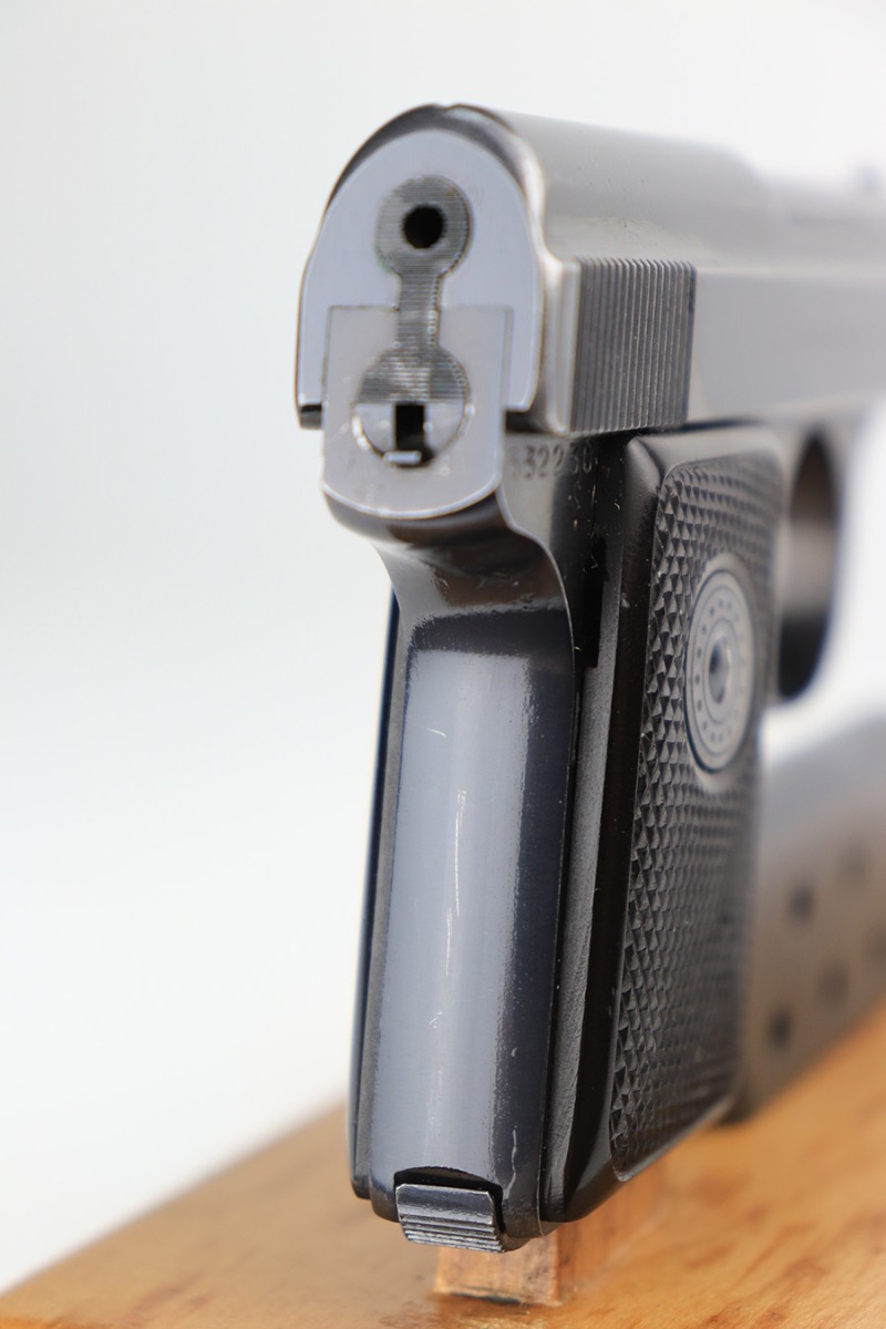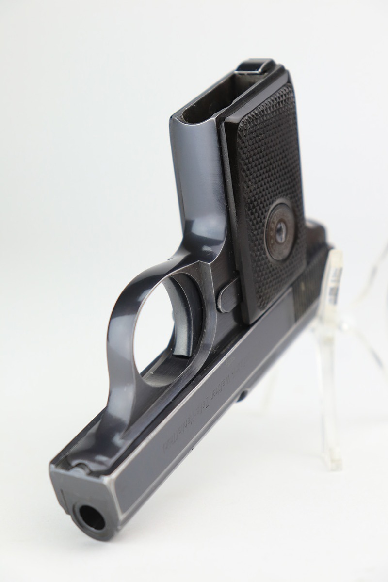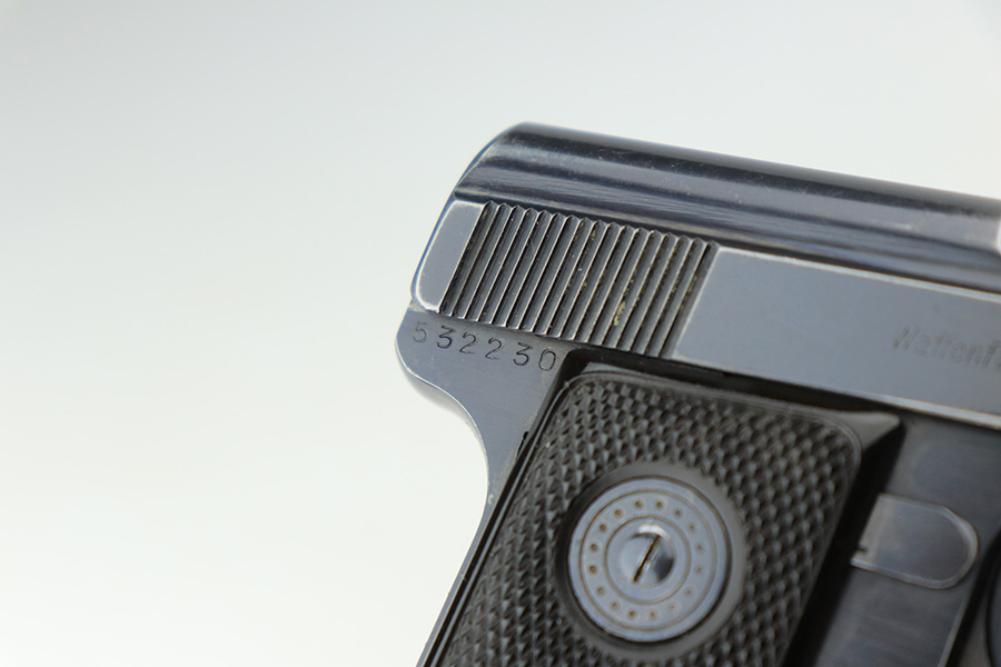 4/13/22 – This is a minty example of a first-variation Walther Model sold in the commercial market in the 1920’s. It is all matching and has the proper “Crown N” commercial proofs. It has retained more than 98% of its original high polish finish. There is just some very minor wear around the high edges in general. The grip straps are beautiful – there are just one or two very light scratches on the back strap. Comes with an excellent .25 caliber Walther mag and excellent period-correct bakelite grips – there is just a tiny hairline crack in the top left corner of the left panel. The bore is stone-mint.
