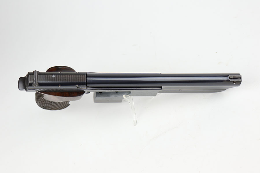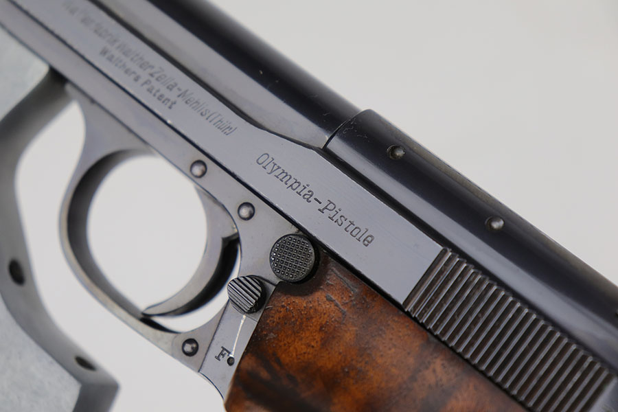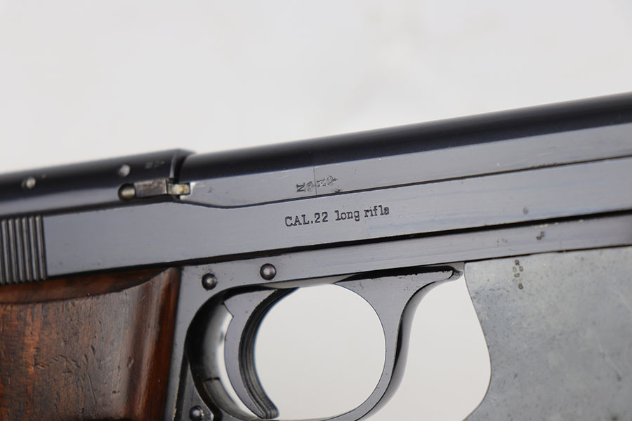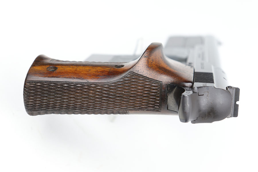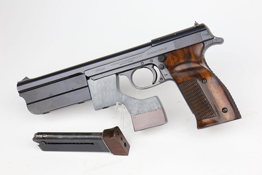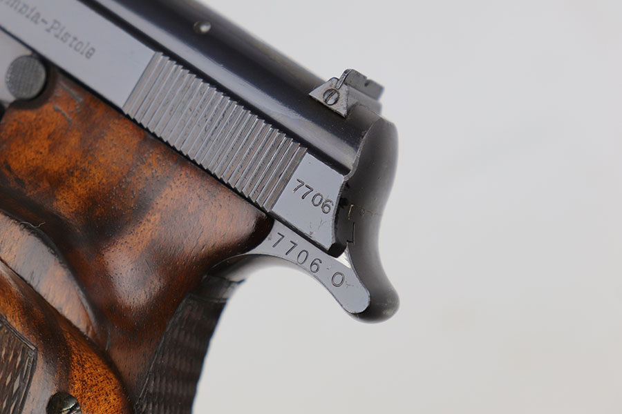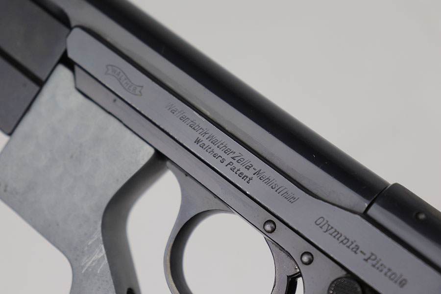 8/11/20 – This is an excellent Walther Olympia Jaeger Pistol made in the late 1930’s. The original design was actually developed for use by the German Olympic team who used it during the 1936 Berlin Olympics. Germany won both the Gold & Silver medals in the 25 meter Rapid Fire Pistol matches during those games. The Olympia is a single-action, blow-back pistol with an internal hammer and push-button magazine release. This is the Sport Modell or standard variation, and was made after 1937 but before 1940 as it has Crown/N proofs but flat side barrel. It is chambered for the .22 Long Rifle and has a 7.25″ barrel. This example has retained about 98% of its original bluing and still has the matching, numbered magazine. It also has the added weight set attached under the barrel/frame. There is minor high point wear but very little bluing loss overall. Mint bore and excellent two-piece grips.