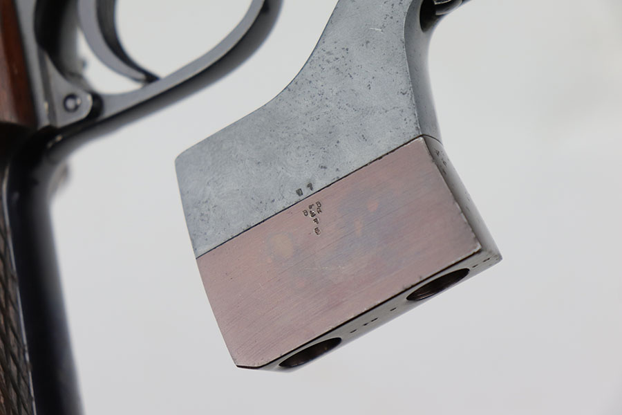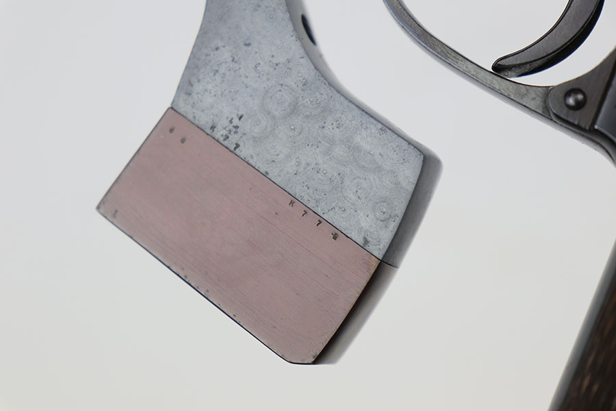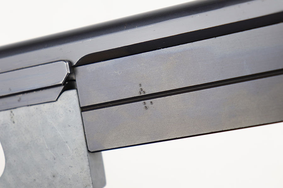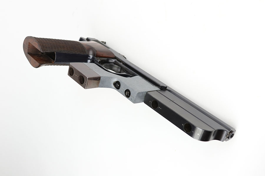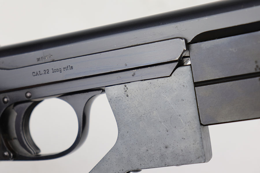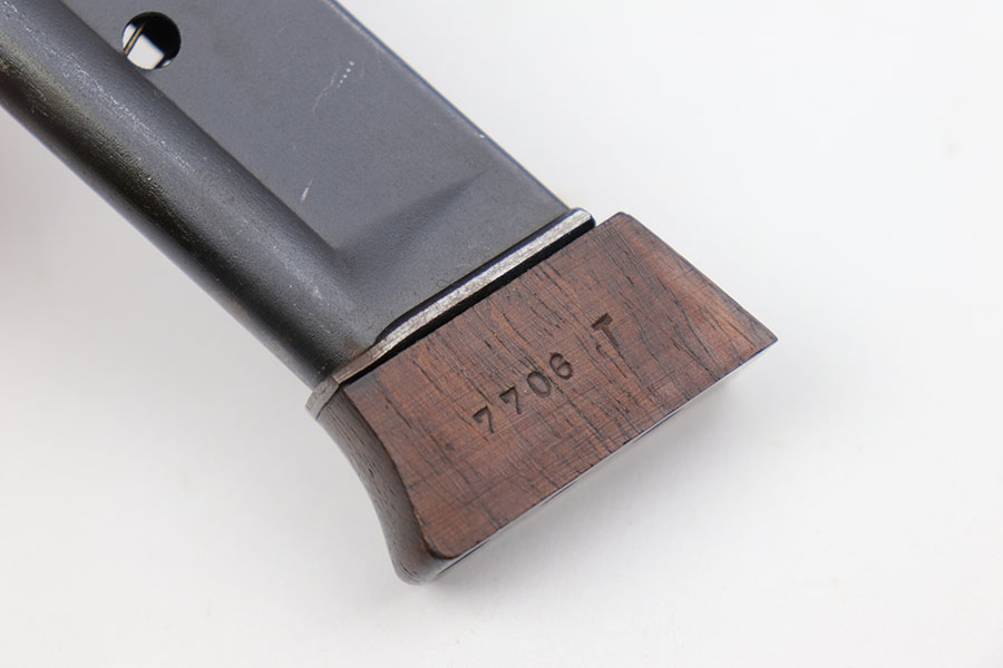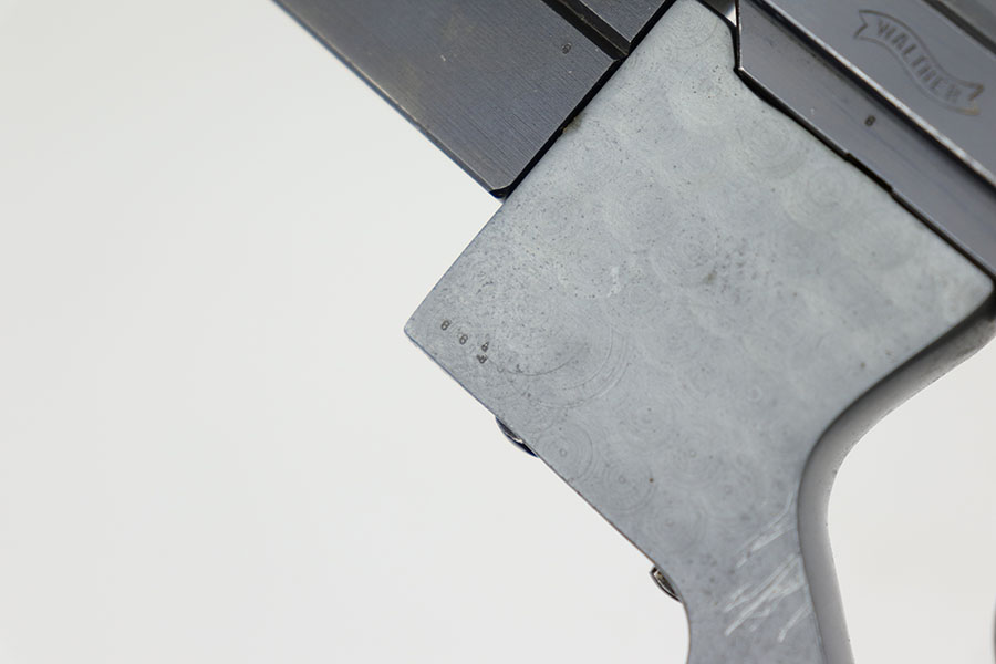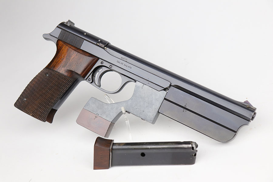 8/11/20 – This is an excellent Walther Olympia Jaeger Pistol made in the late 1930’s. The original design was actually developed for use by the German Olympic team who used it during the 1936 Berlin Olympics. Germany won both the Gold & Silver medals in the 25 meter Rapid Fire Pistol matches during those games. The Olympia is a single-action, blow-back pistol with an internal hammer and push-button magazine release. This is the Sport Modell or standard variation, and was made after 1937 but before 1940 as it has Crown/N proofs but flat side barrel. It is chambered for the .22 Long Rifle and has a 7.25″ barrel. This example has retained about 98% of its original bluing and still has the matching, numbered magazine. It also has the added weight set attached under the barrel/frame. There is minor high point wear but very little bluing loss overall. Mint bore and excellent two-piece grips.
