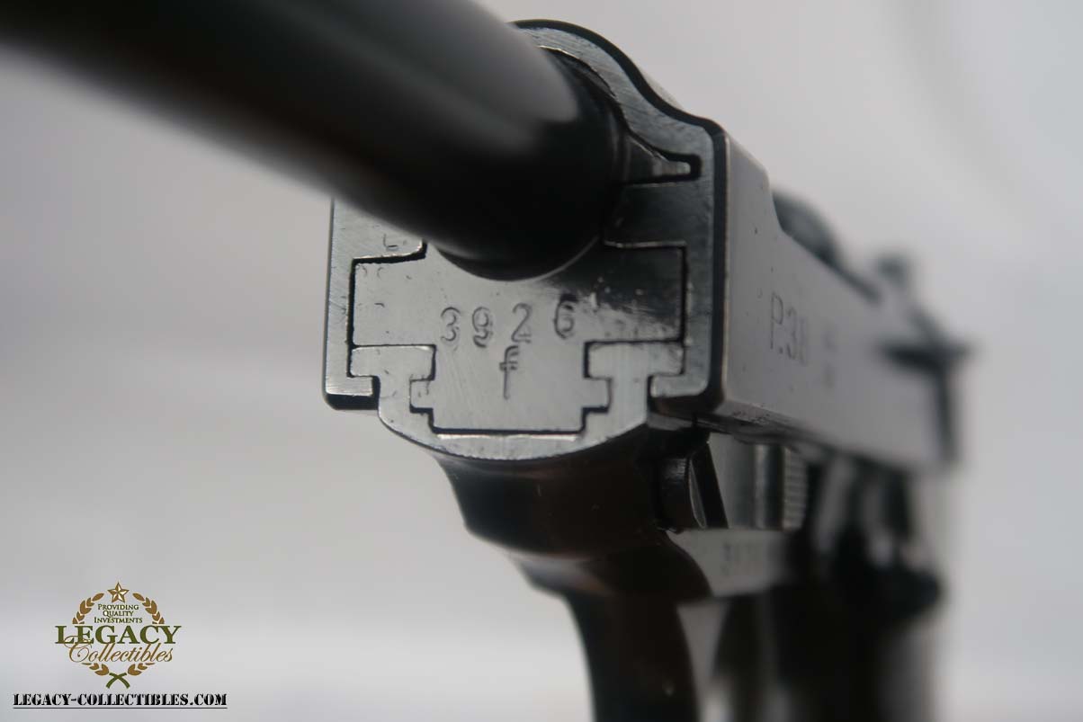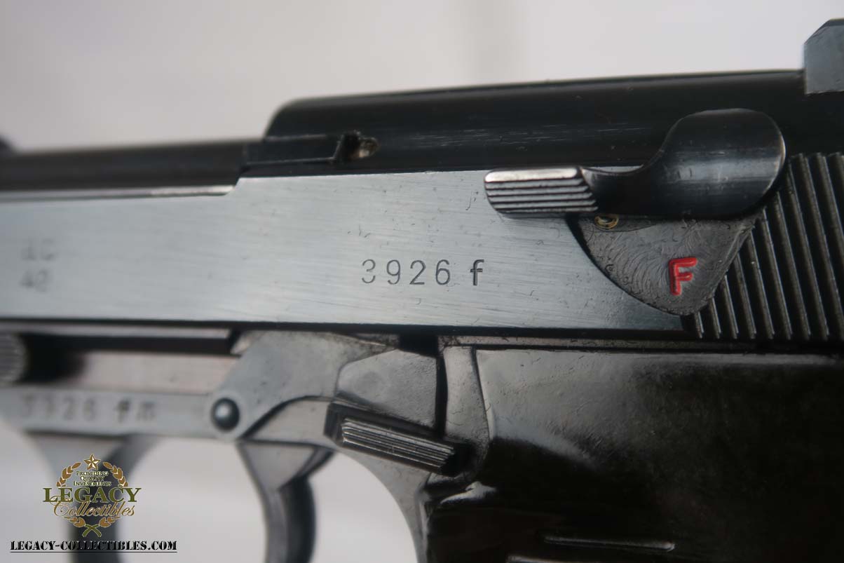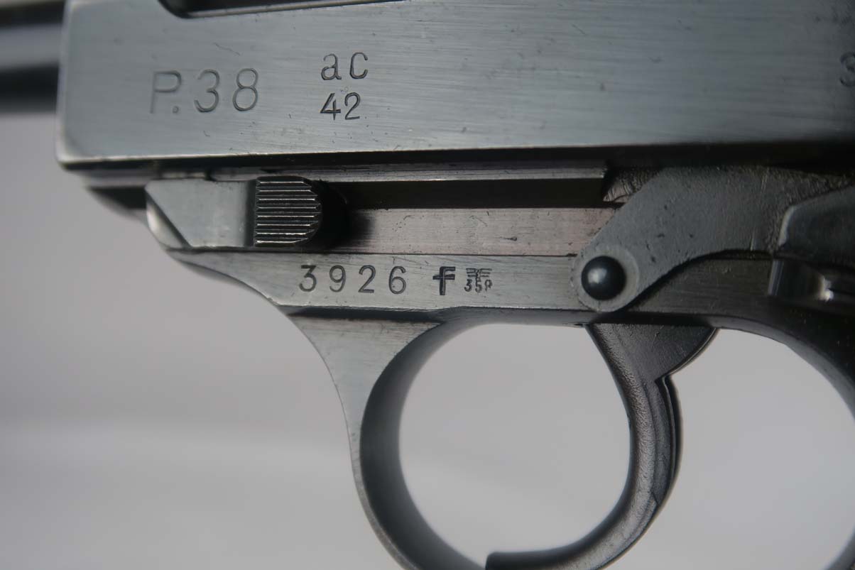 3/22/17 – This is a beautiful AC 42. I would rate the original finish at 98-99%. It has all matching parts and the grips are correct for the variation – also in excellent condition. The magazine is a Walther made Eagle 359 proofed piece. The mechanics are excellent as is the bore. I would rate the shiny bore to be a 9 out of 10. Finding P,38’s in this condition is getting increasingly difficult. Don’t let this one pass you by!