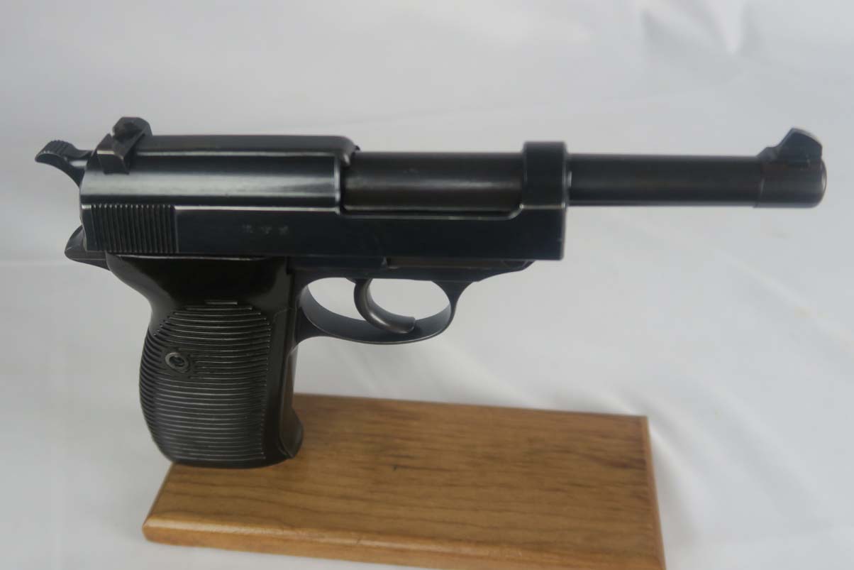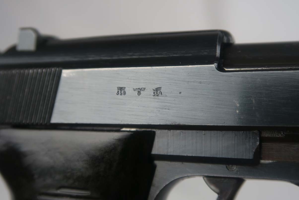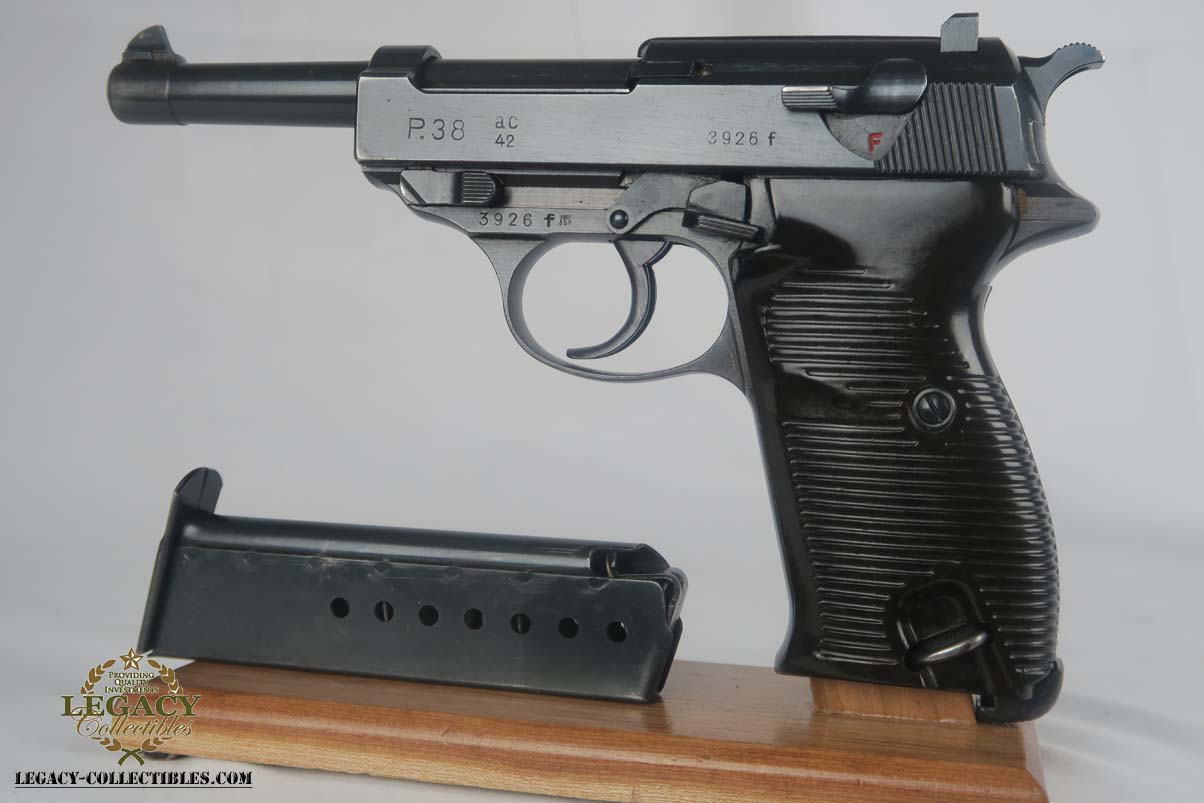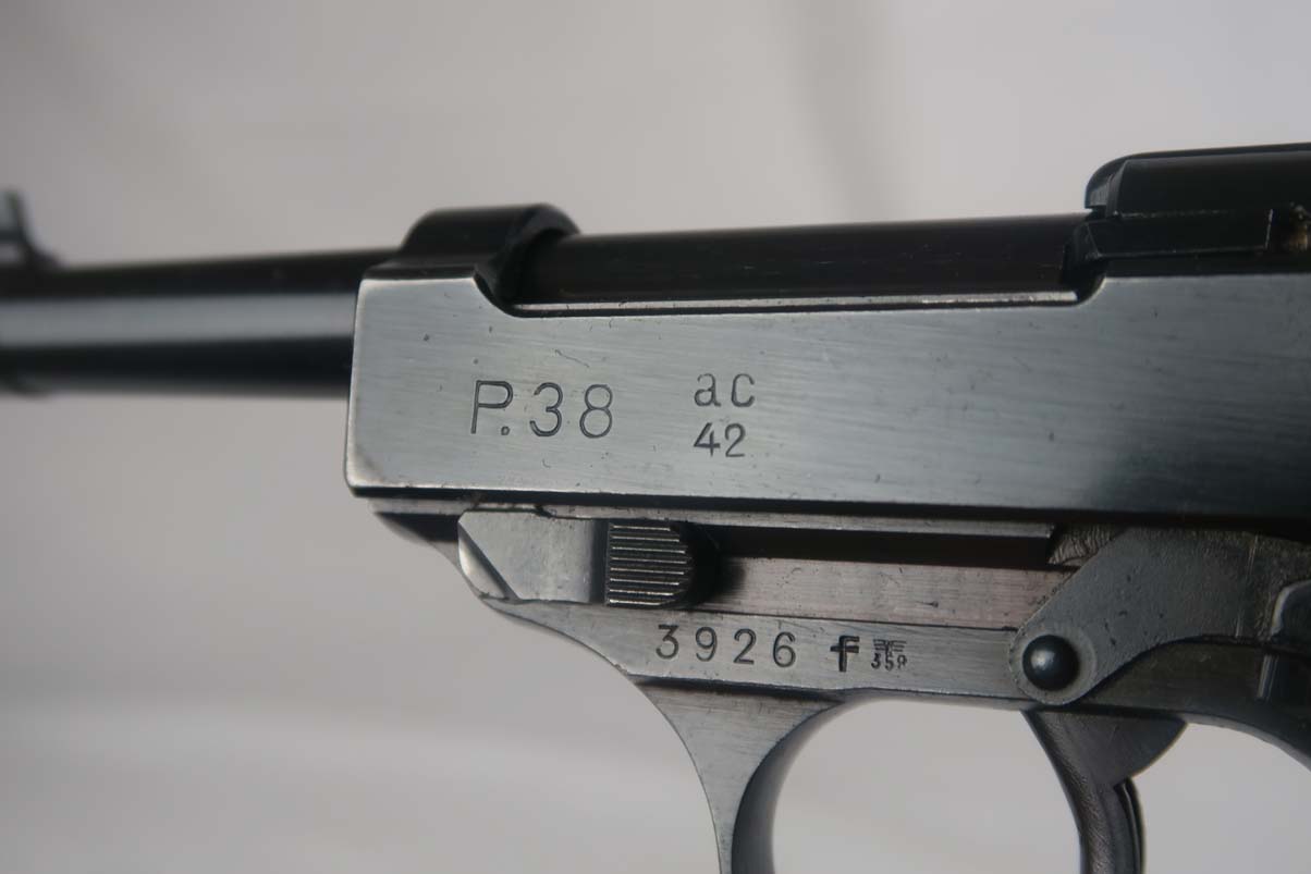 3/22/17 – This is a beautiful AC 42. I would rate the original finish at 98-99%. It has all matching parts and the grips are correct for the variation – also in excellent condition. The magazine is a Walther made Eagle 359 proofed piece. The mechanics are excellent as is the bore. I would rate the shiny bore to be a 9 out of 10. Finding P,38’s in this condition is getting increasingly difficult. Don’t let this one pass you by!