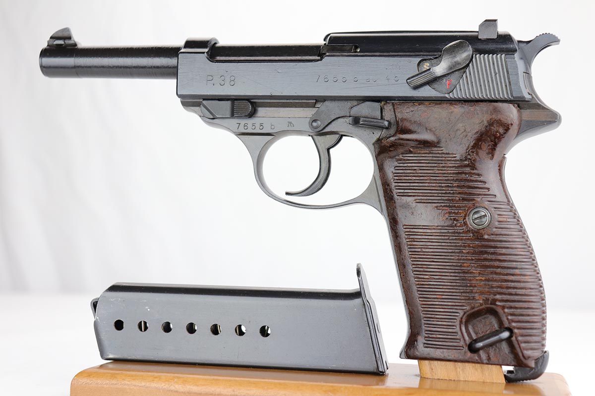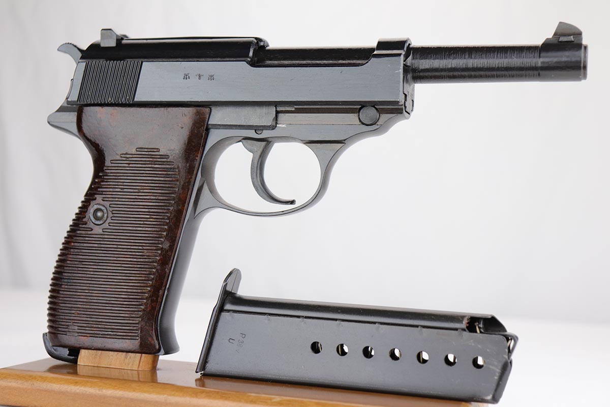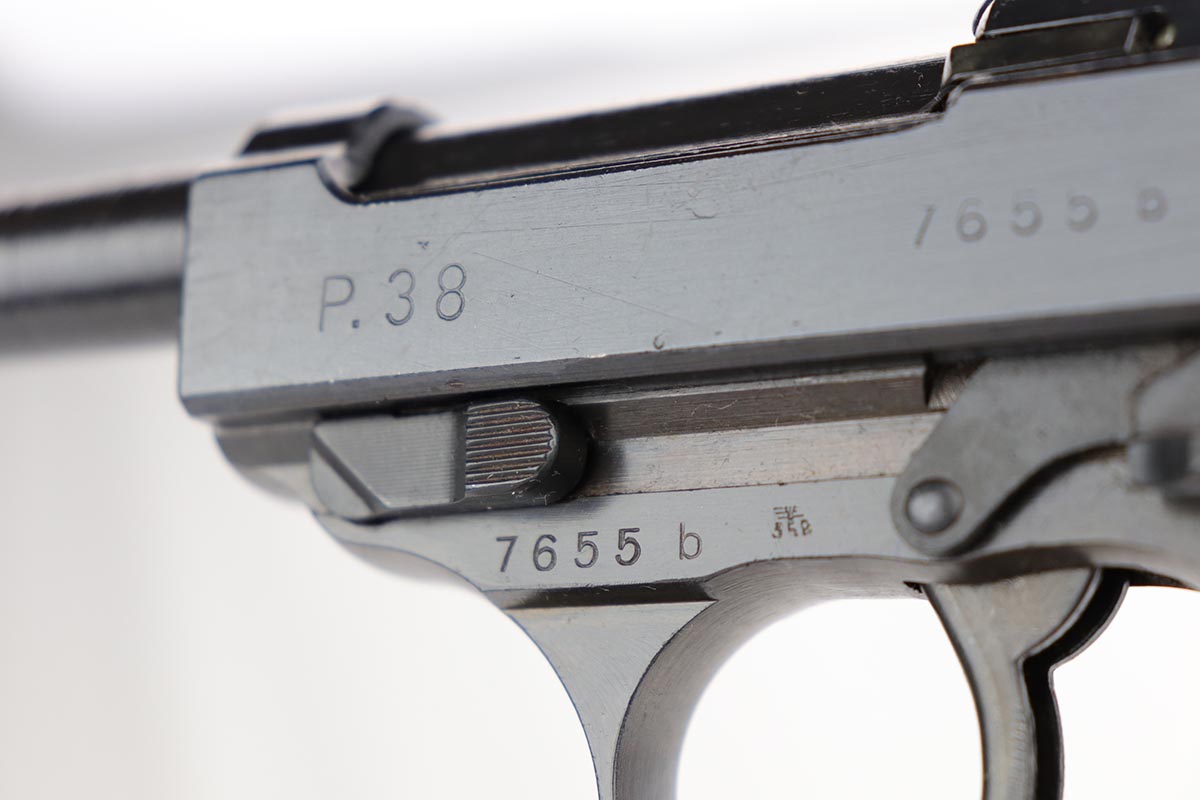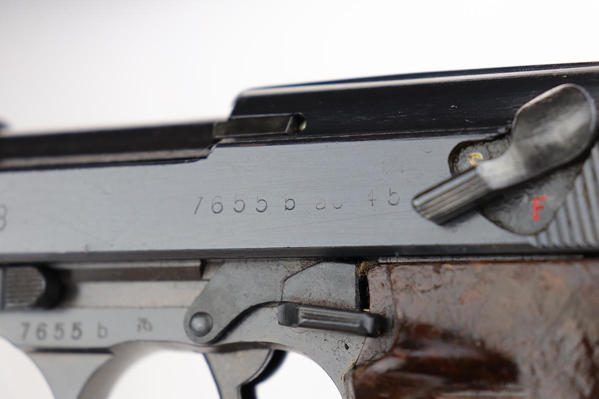 10/24/19 – This is a near-mint Walther P.38 that was manufactured in March of 1945 for the Nazi Army. It has hardly any finish loss, but there are a few thin scratches on either side of the slide. The grips are in good shape but have minor signs of handling wear. Proper mechanics, including de-cocker. Walther magazine. Bore is excellent but there is minor freckling right near the muzzle.