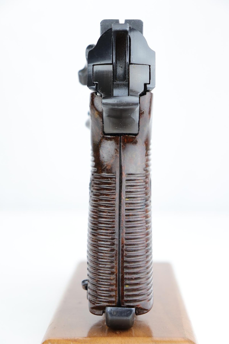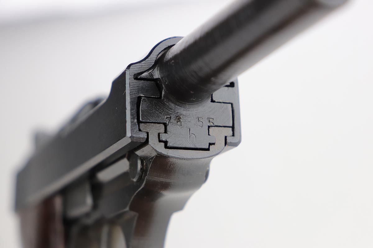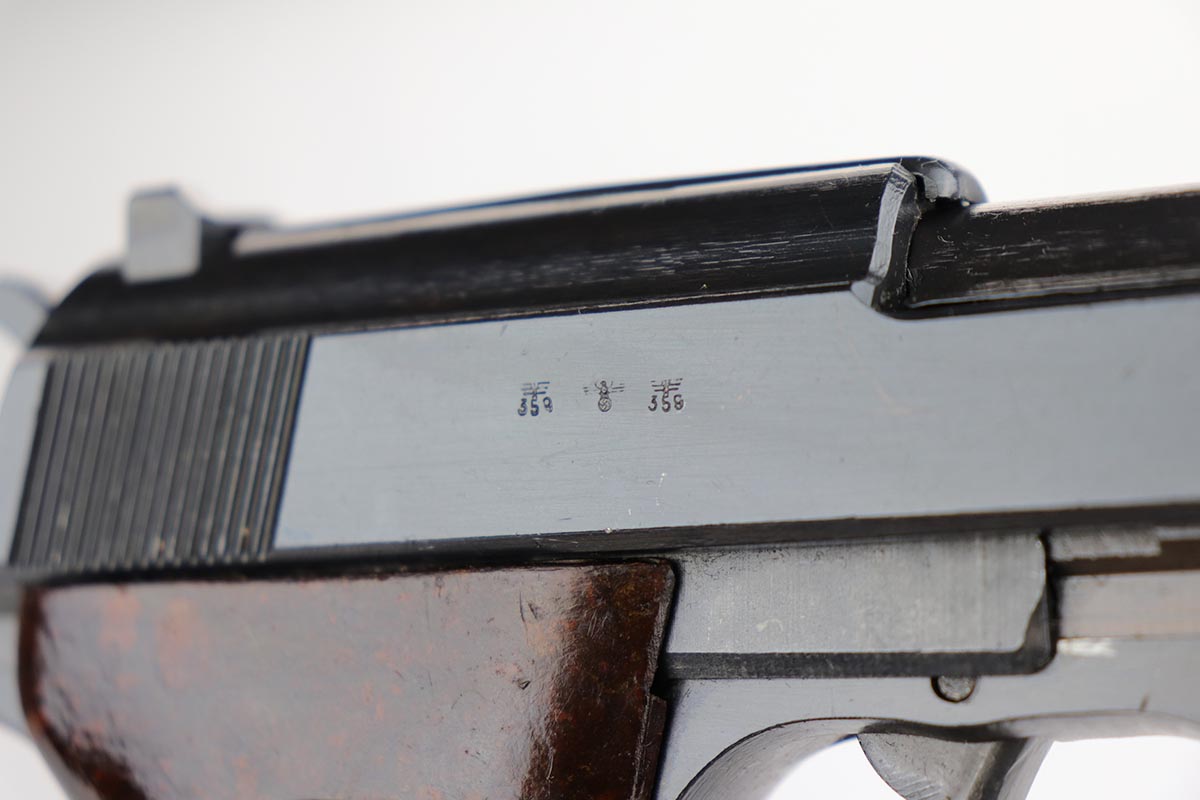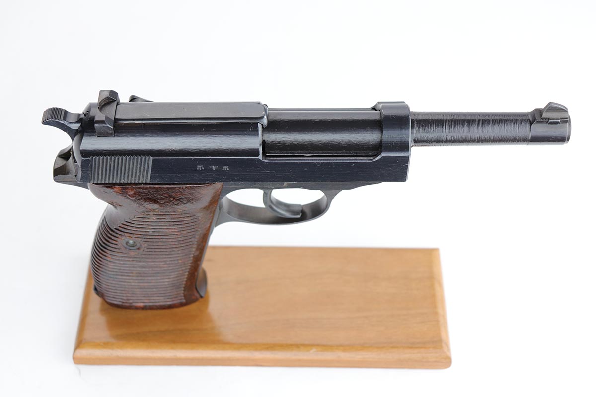 10/24/19 – This is a near-mint Walther P.38 that was manufactured in March of 1945 for the Nazi Army. It has hardly any finish loss, but there are a few thin scratches on either side of the slide. The grips are in good shape but have minor signs of handling wear. Proper mechanics, including de-cocker. Walther magazine. Bore is excellent but there is minor freckling right near the muzzle.