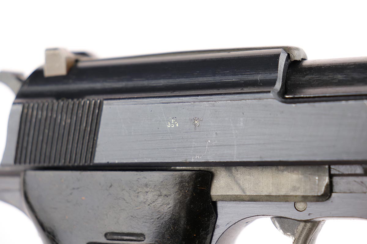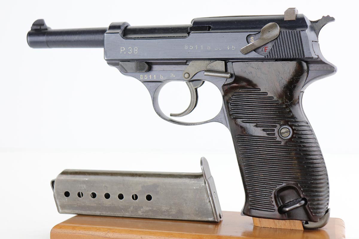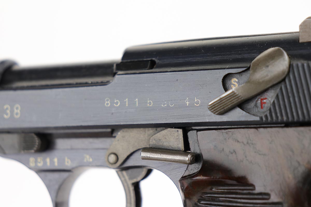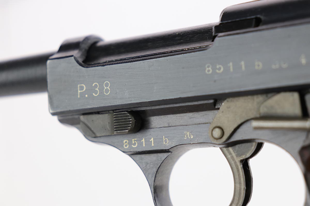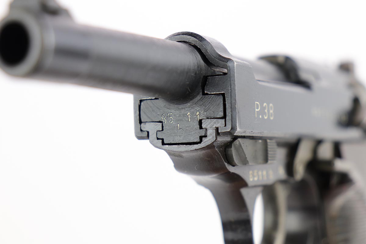 2/14/20 – This is a near-mint Walther P.38 from March of 1945. The original finish rates at 98-99% with minor muzzle wear and a bit of patina on the front strap. The pistol has all matching numbers, and is a late example with only two of the inspection stamps on the right side of the slide. It also has a nice mix of phosphate and blue parts, which create a nice “dual-tone” quality to the pistol. Nice brown grips and a minty bore. Proper mechanics, including de-cocker. Scarce, late magazine with ribbed follower. Listing also includes a nice softshell holster that is 1944 dated and has a sharp waffenamt.