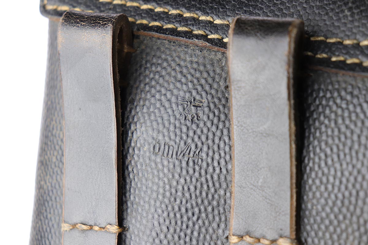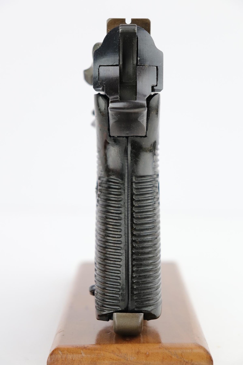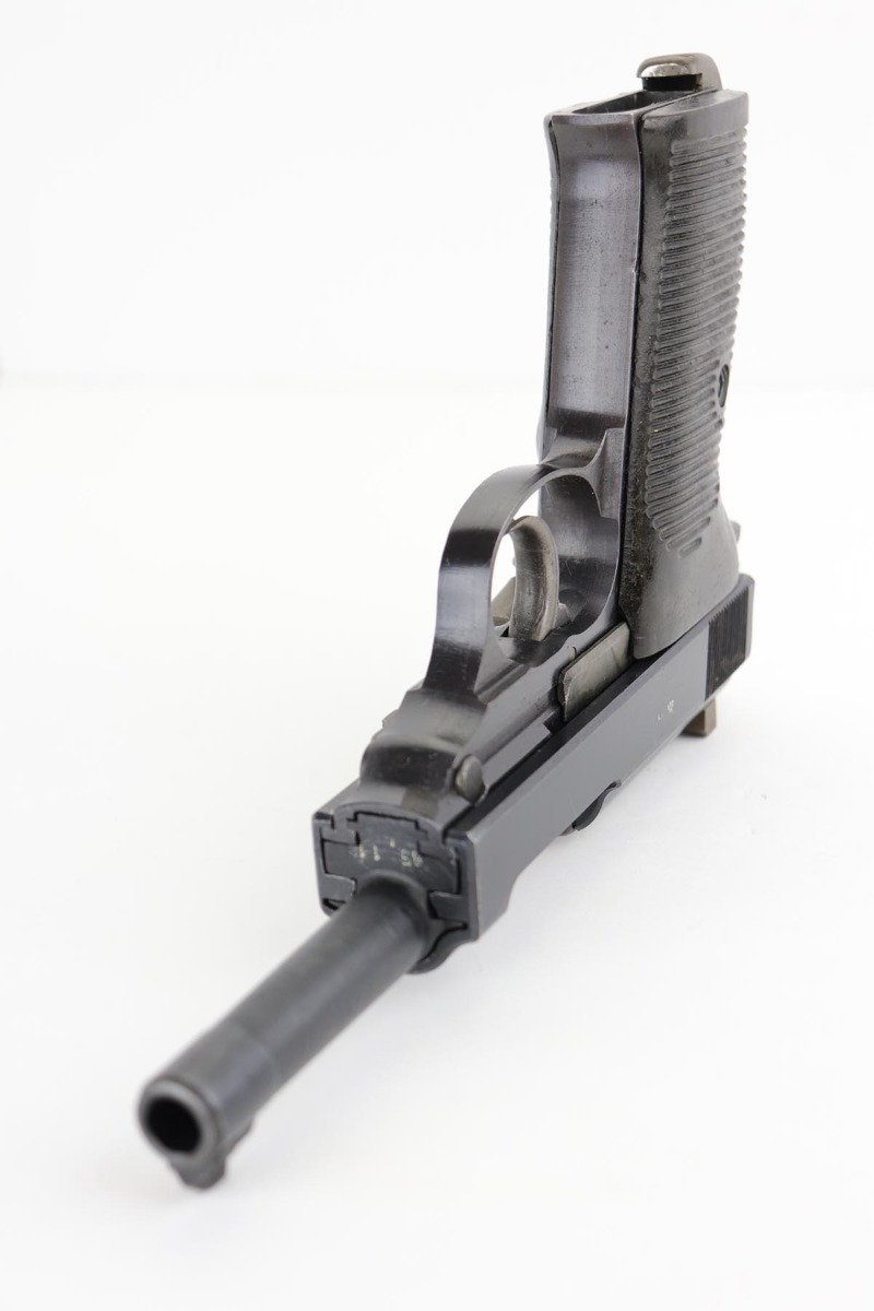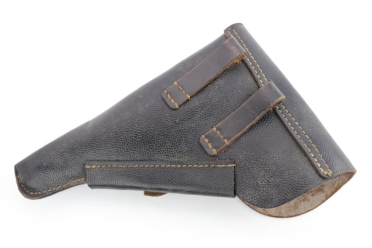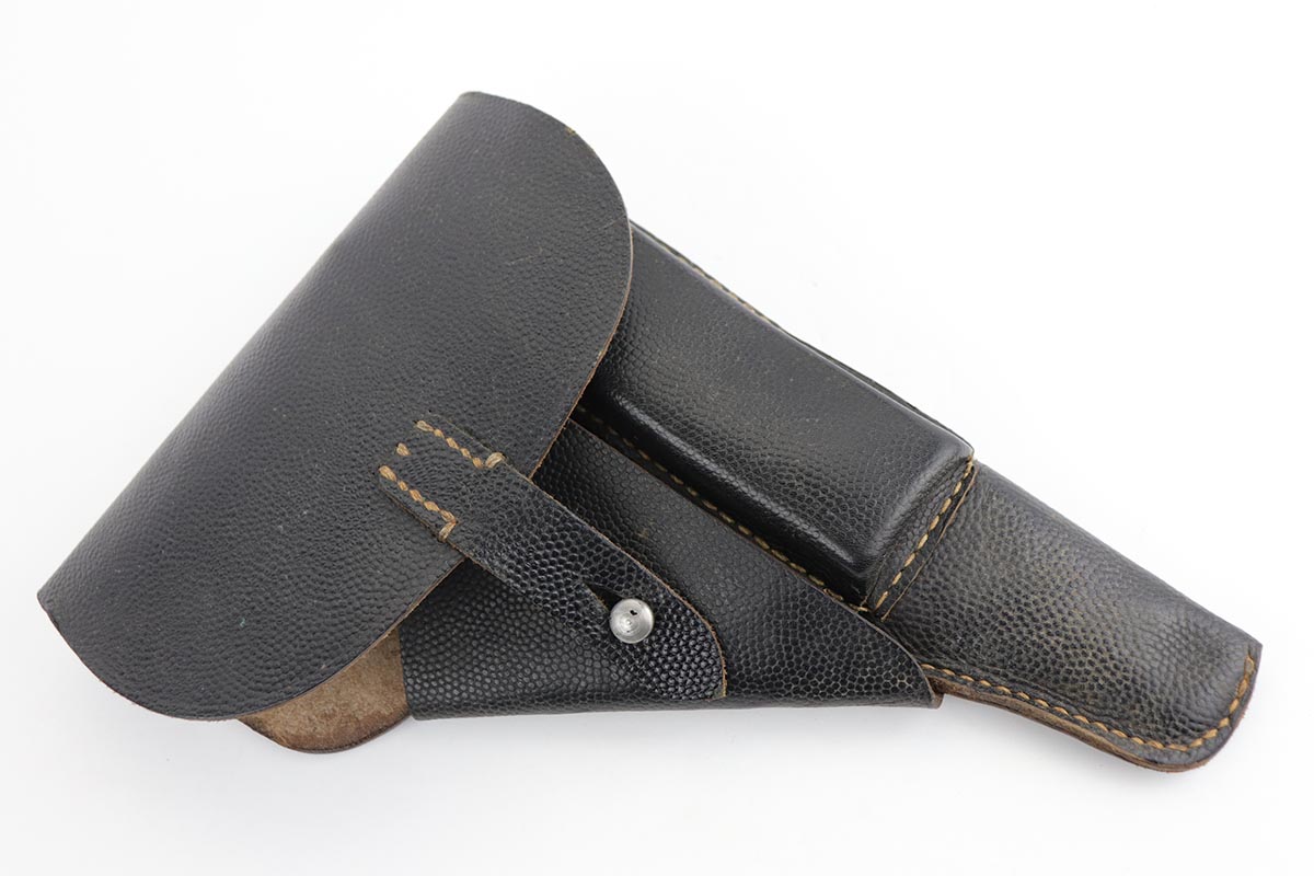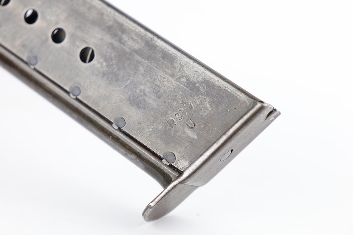 2/14/20 – This is a near-mint Walther P.38 from March of 1945. The original finish rates at 98-99% with minor muzzle wear and a bit of patina on the front strap. The pistol has all matching numbers, and is a late example with only two of the inspection stamps on the right side of the slide. It also has a nice mix of phosphate and blue parts, which create a nice “dual-tone” quality to the pistol. Nice brown grips and a minty bore. Proper mechanics, including de-cocker. Scarce, late magazine with ribbed follower. Listing also includes a nice softshell holster that is 1944 dated and has a sharp waffenamt.