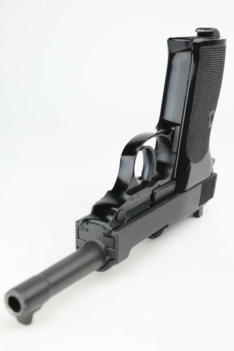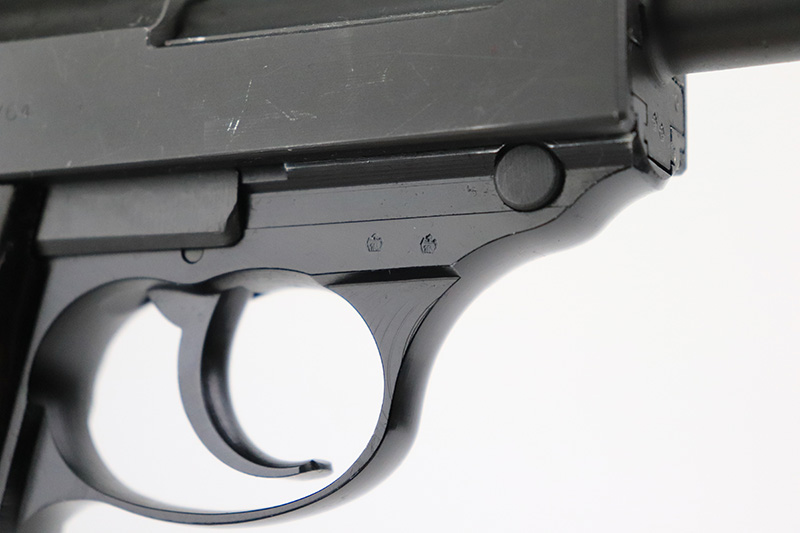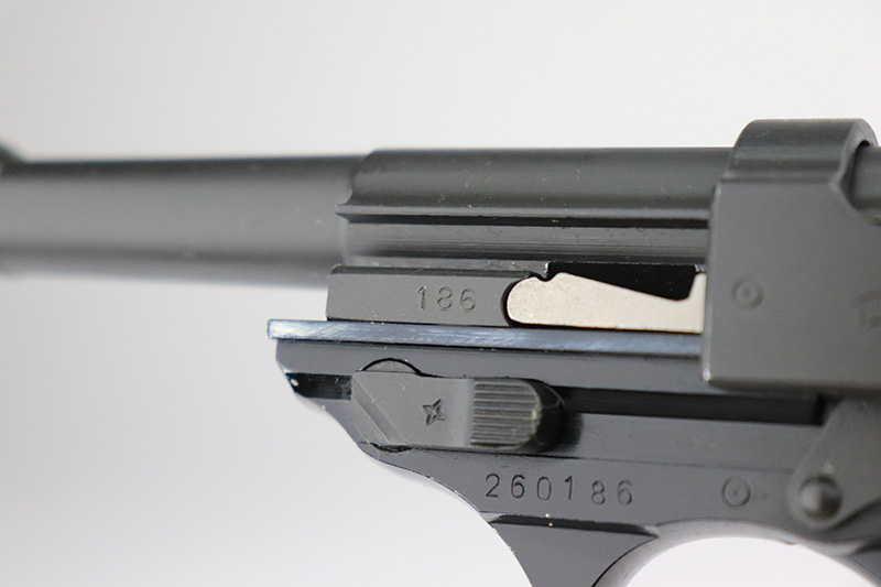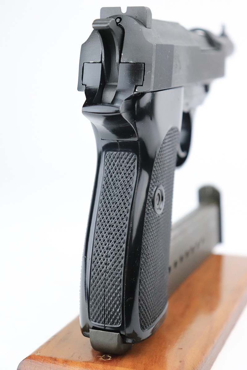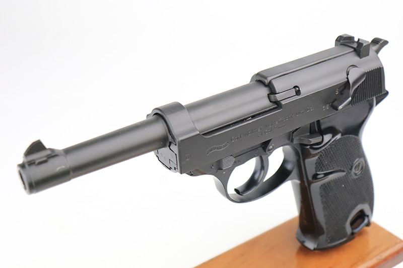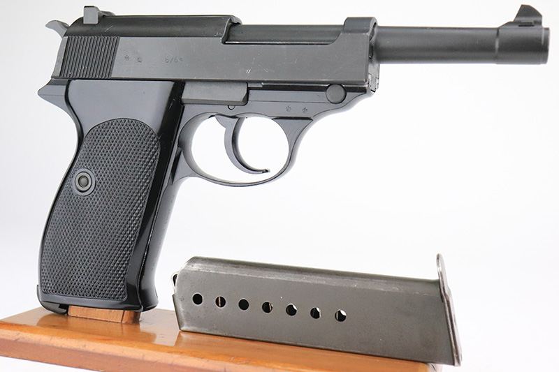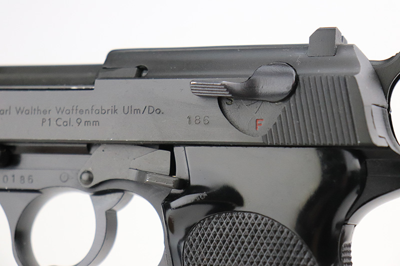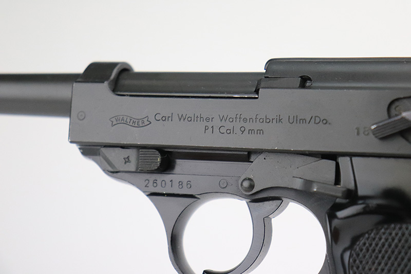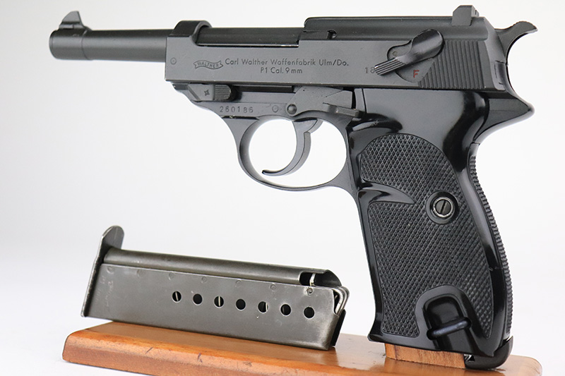 9/21/22 – This is a near-mint example of a Walther P1 manufactured in June of 1964. It is all matching and has the proper West German proofs throughout. Import mark on the front strap. The gun comes with a very nice custom-made wood case with a Walther patch on the inside. The gun has retained virtually all of its original finish with a few tiny handling marks and scuffs here and there (most noticeable on the right side). Comes with excellent black plastic grips and two proper P1 magazines. Mint bore. De-cocker is functional.