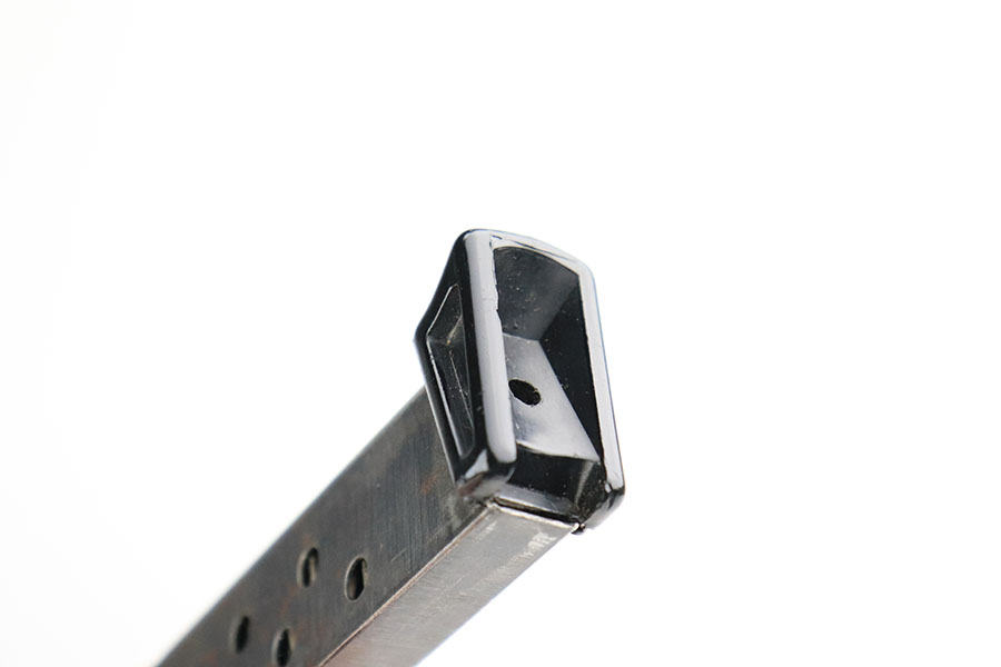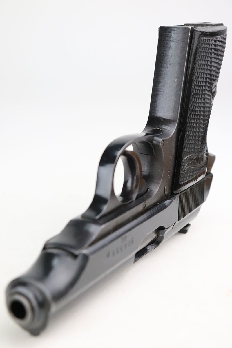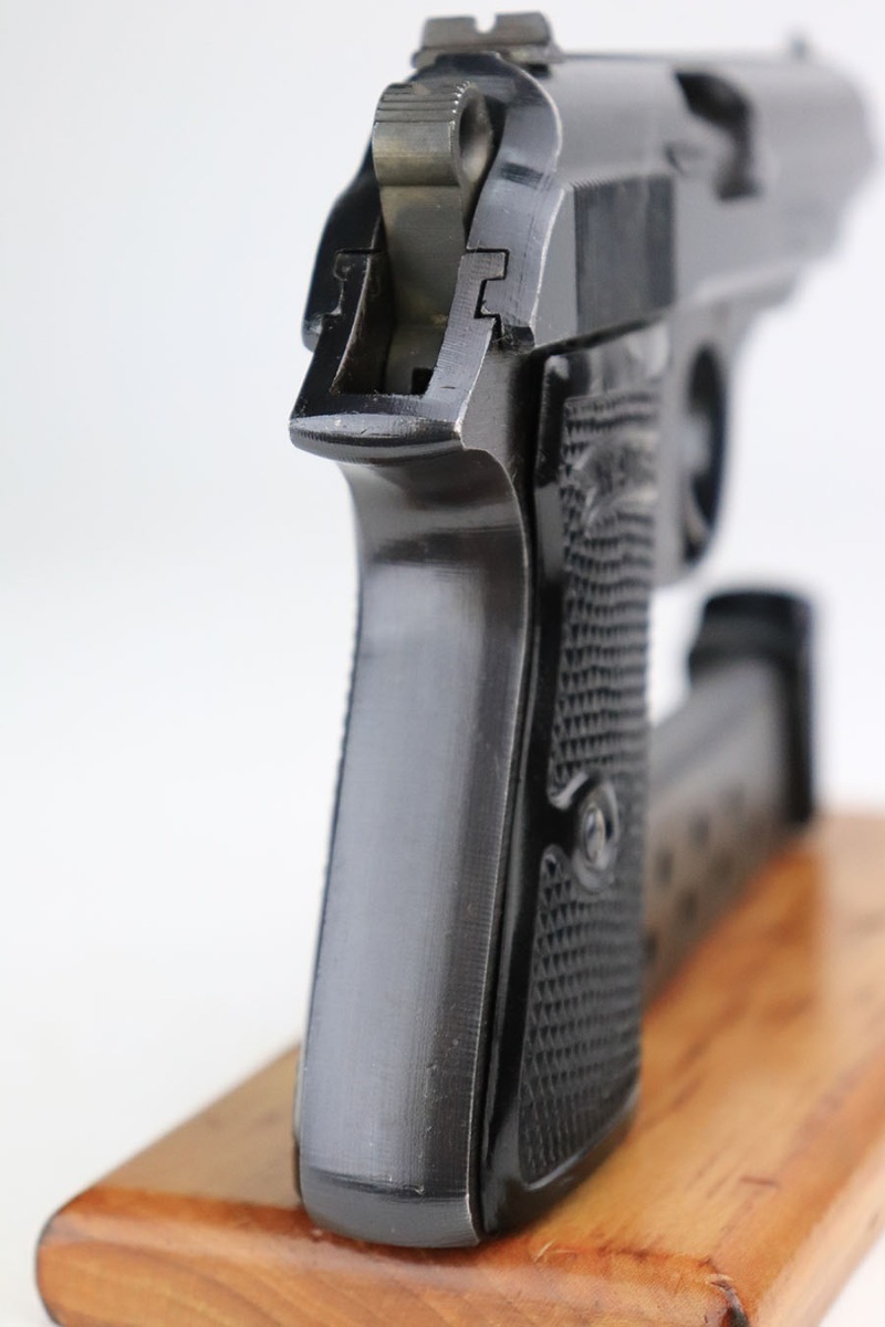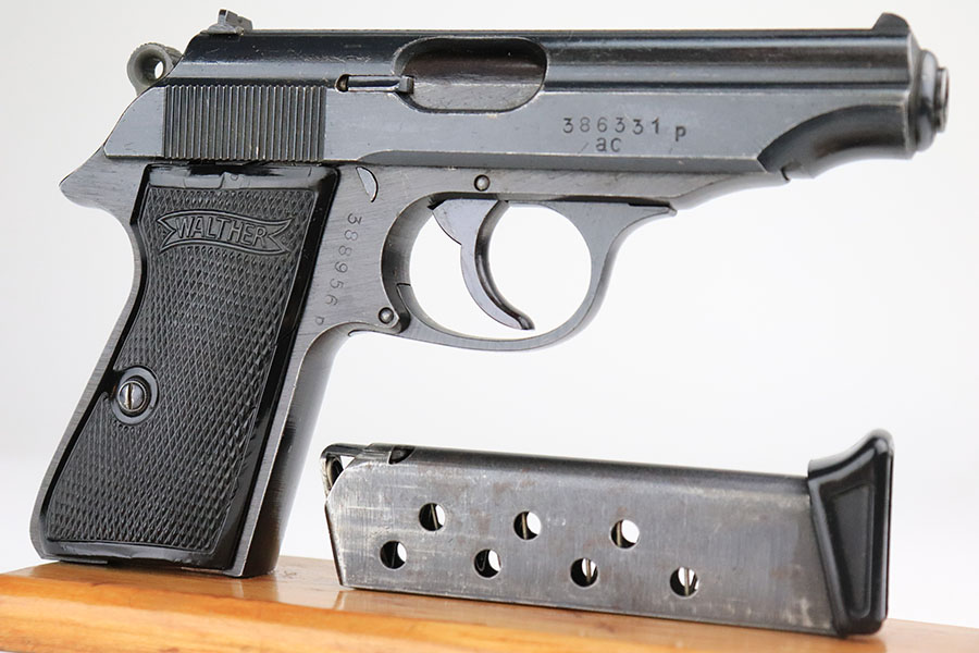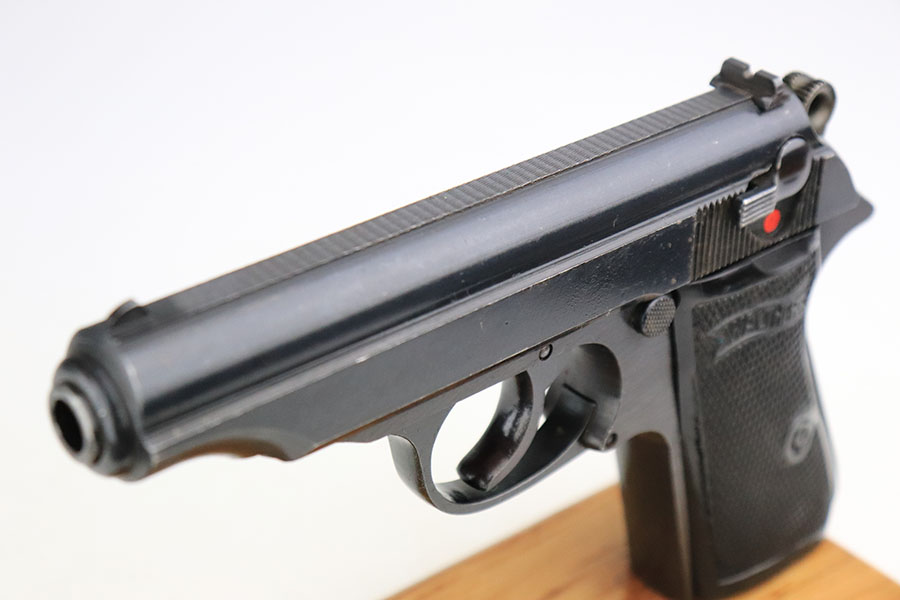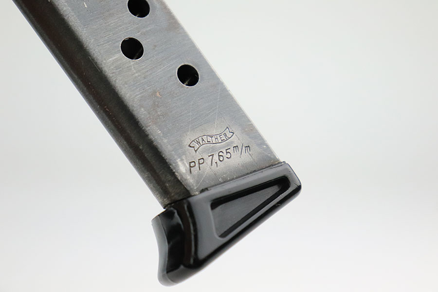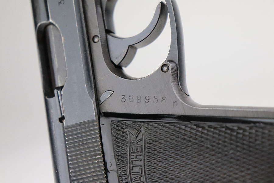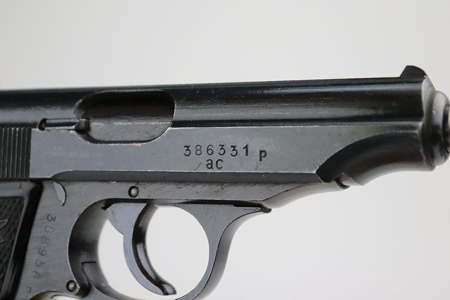 10/17/22 – This is a minty example of an original end-of-war Walther PP from 1945. It’s an ‘ac mismatch’ example with GI put-together slide and frame. The slide was not finished prior to the end of the war, so it has no firing proofs or slide legend. The original blue is excellent with hardly any wear to mention. Mint bore. Finger extension magazine. Original grips but both panels are cracked, unfortunately.