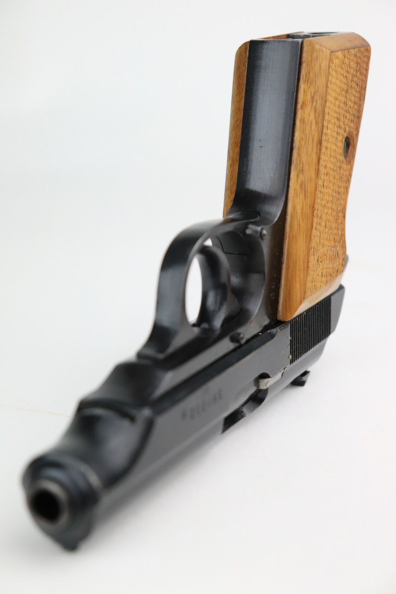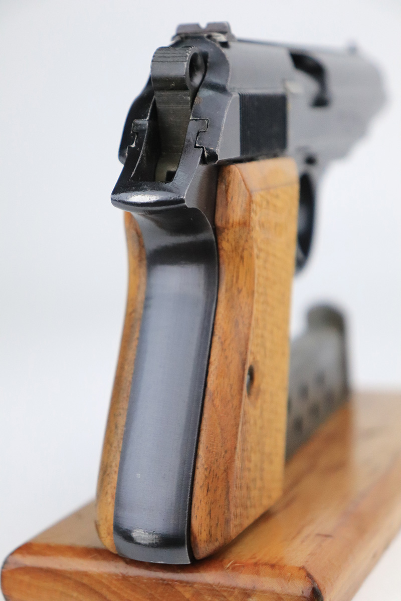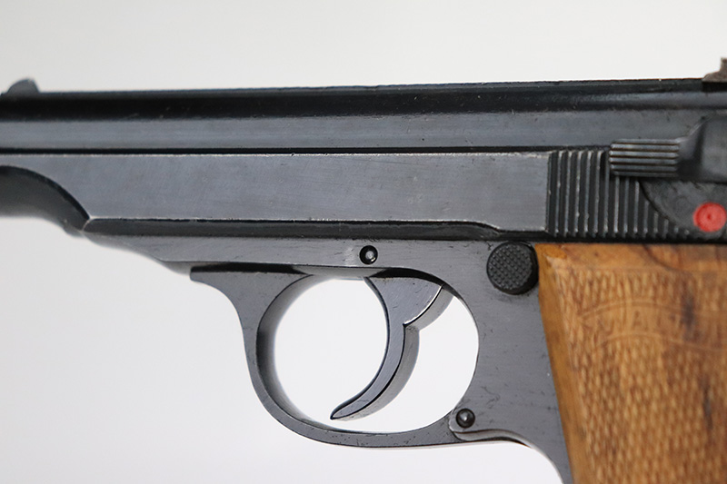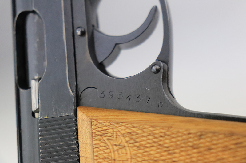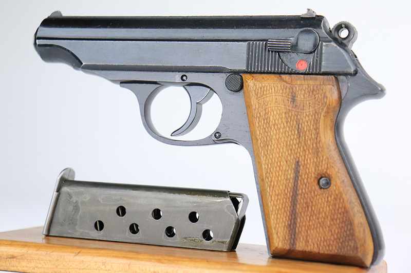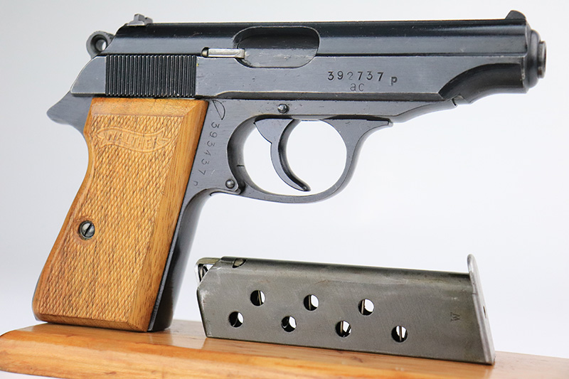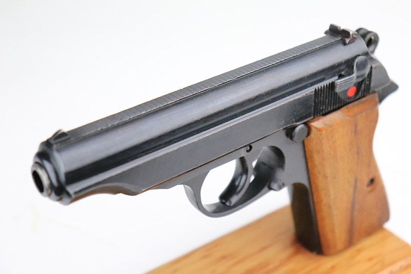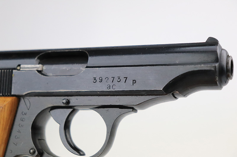 8/26/22 – This is a near-mint example of a Walther PP manufactured at the end of the war in 1945. This is a GI mismatched gun put together by an American GI at the very end of the war. It has no proof marks, indicating it was never issued and never made it out of the Walther factory. It properly has no slide legend and has an “ac” Walther factory code on the right side of the slide. It has retained nearly all of its original finish with hints of wear around some of the high edges and some tiny handling marks on both sides of the slide. Comes with minty end-of-war wood grips and a rare end-of-war “W” marked phosphate magazine. The bore is mint.
