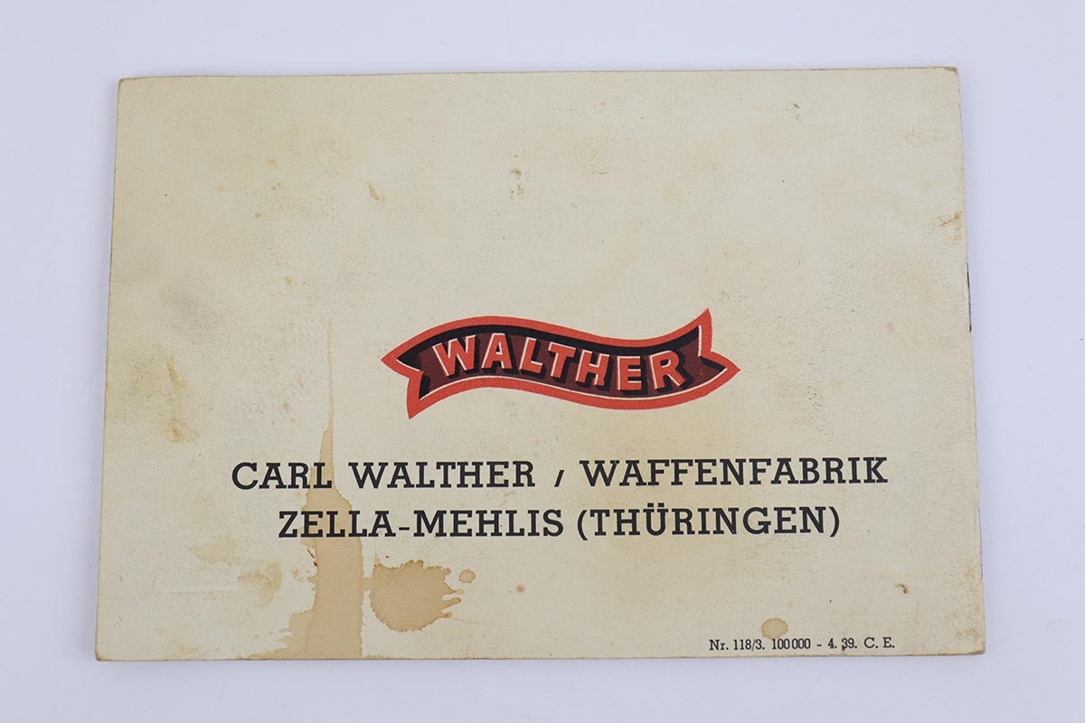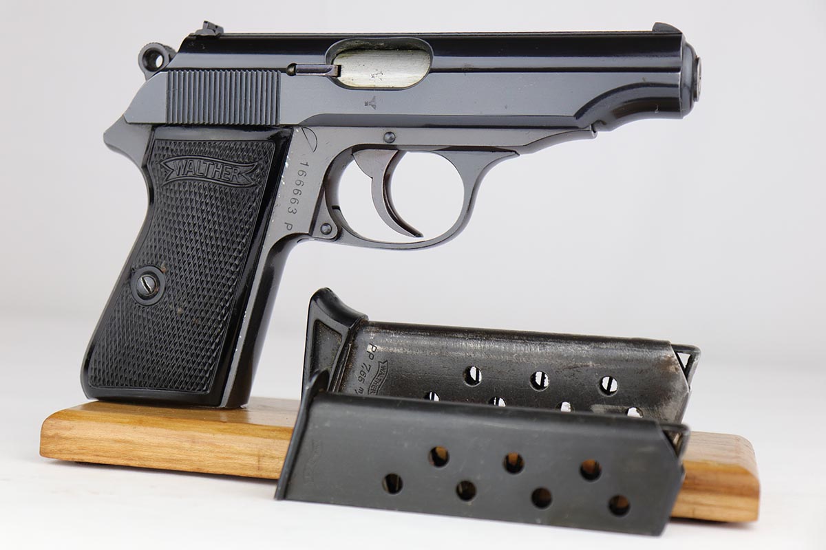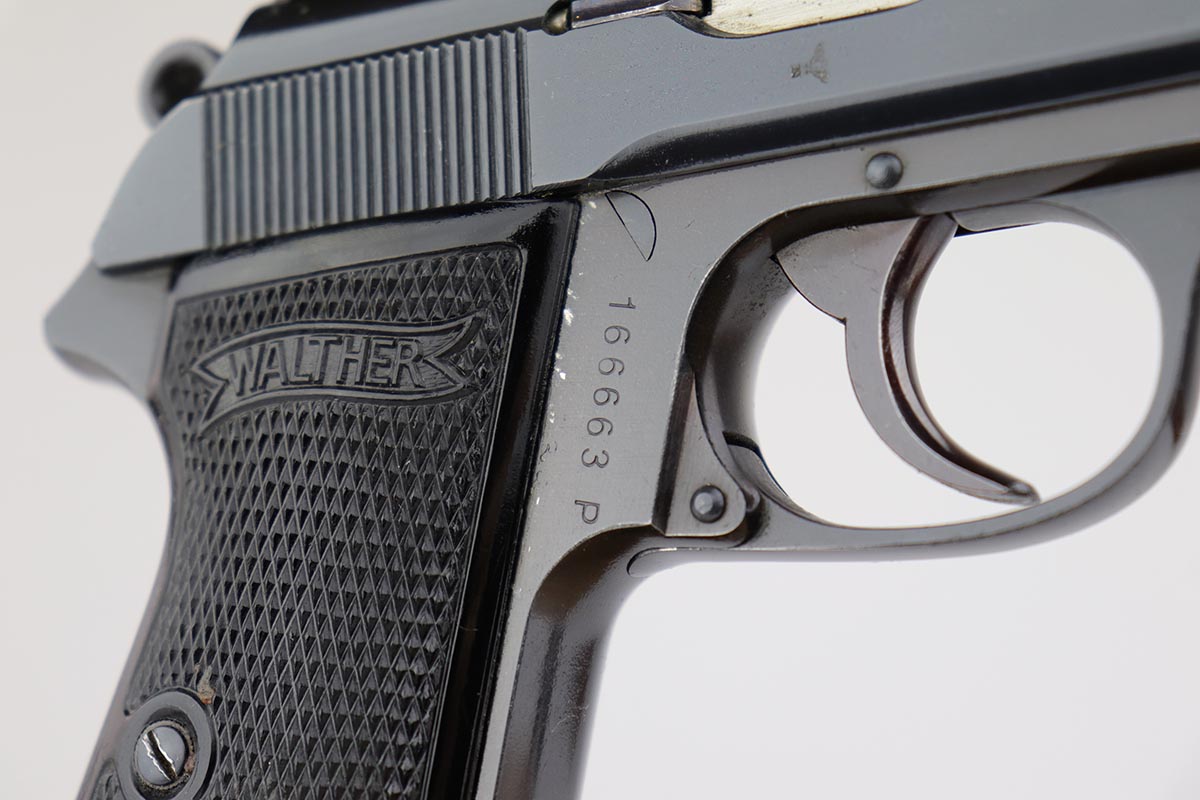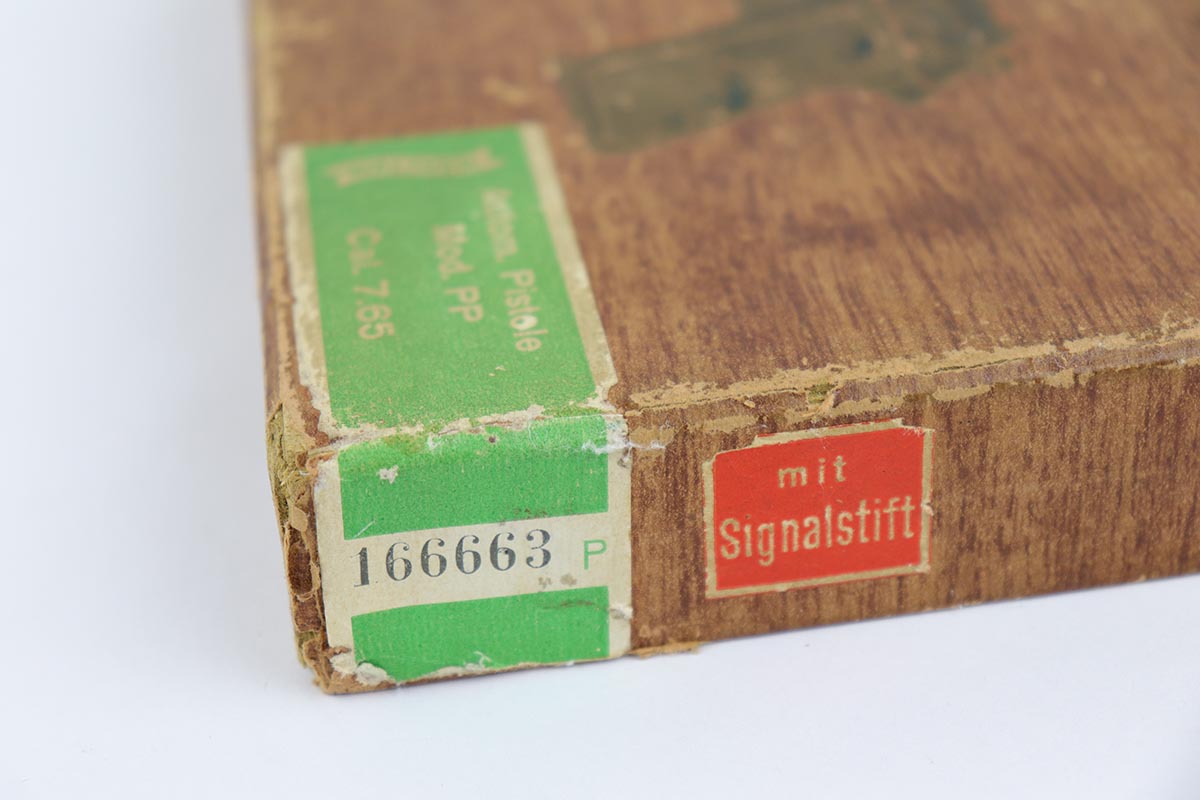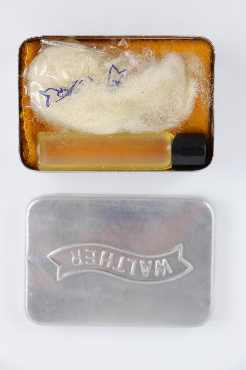 12/29/20 – This is a near-mint Walther PP that was made for the German commercial market, and comes in the original, matching box with spare magazine, cleaning rod, oiler kit and manual. The pistol retains about 98% original high-polish blue, with minor muzzle wear, an area of finish loss on the bottom of the back strap and a tiny spot of freckling on the right side of the slide. Serial dates the pistol to about 1940, and the manual is 1939 dated. Original cleaning rod is present and in the original cellophane. Correct spare magazine. Walther factory tin with oiler and horse hair with factory marked cellophane.