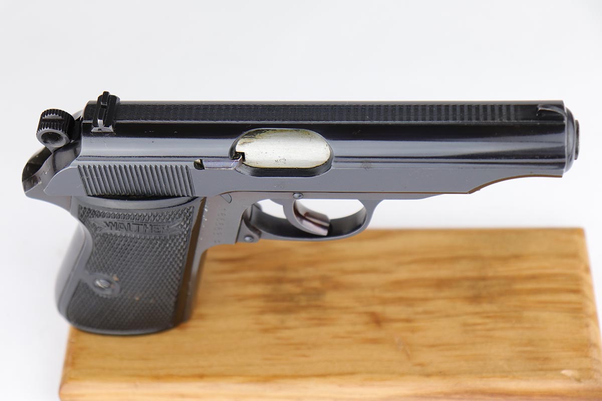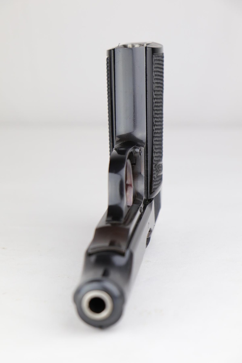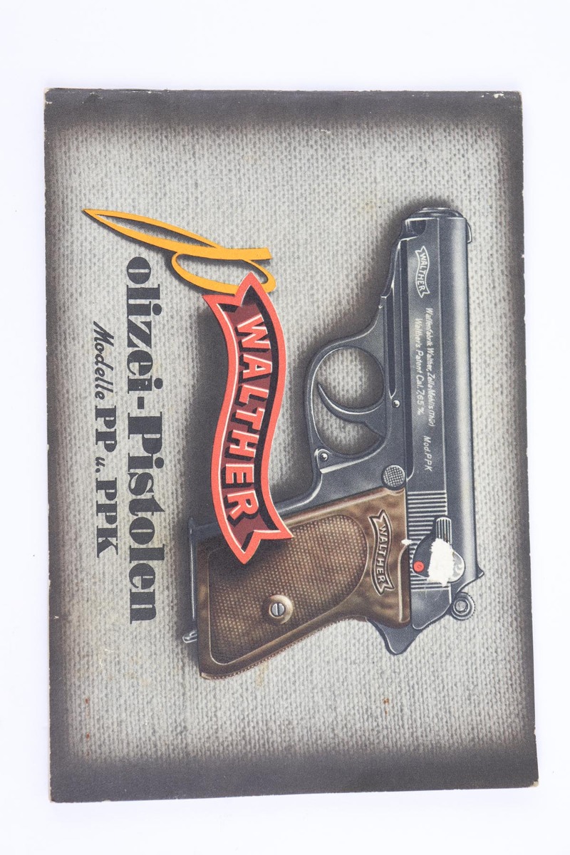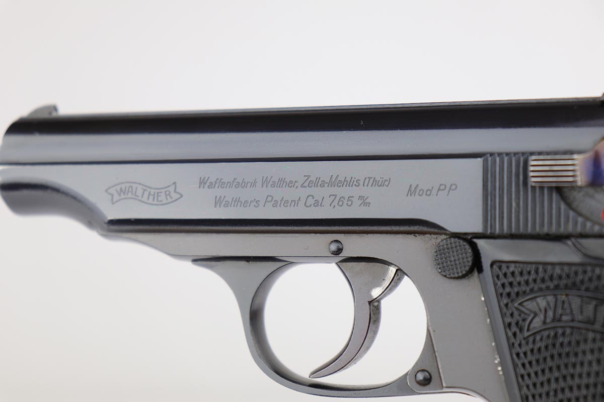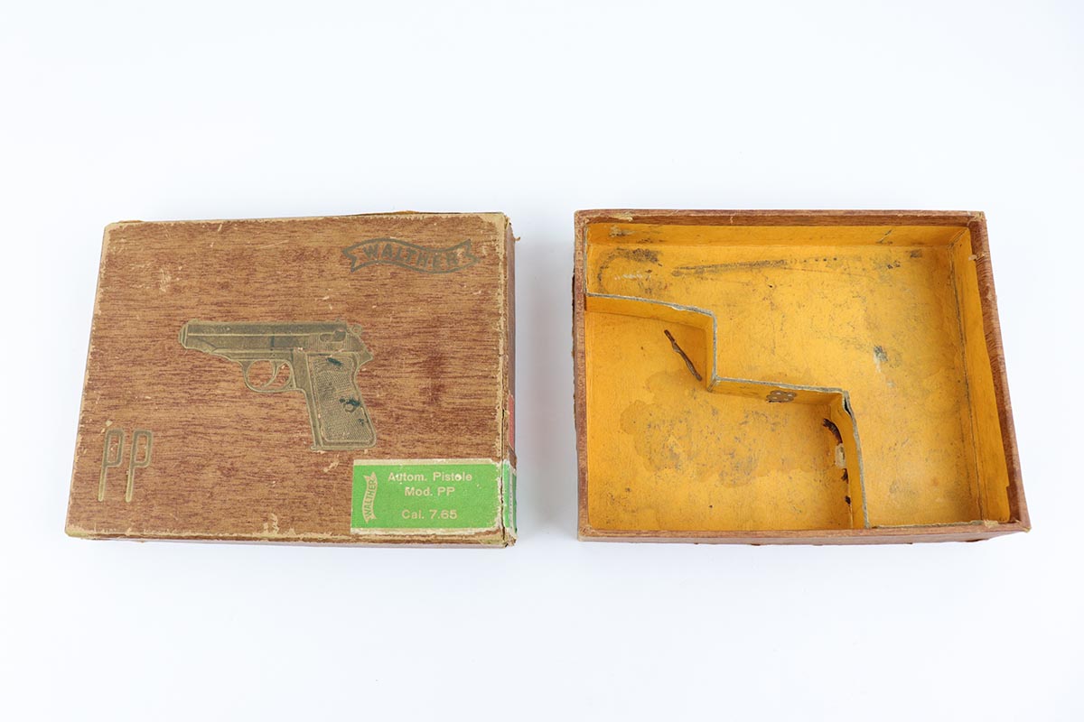 12/29/20 – This is a near-mint Walther PP that was made for the German commercial market, and comes in the original, matching box with spare magazine, cleaning rod, oiler kit and manual. The pistol retains about 98% original high-polish blue, with minor muzzle wear, an area of finish loss on the bottom of the back strap and a tiny spot of freckling on the right side of the slide. Serial dates the pistol to about 1940, and the manual is 1939 dated. Original cleaning rod is present and in the original cellophane. Correct spare magazine. Walther factory tin with oiler and horse hair with factory marked cellophane.