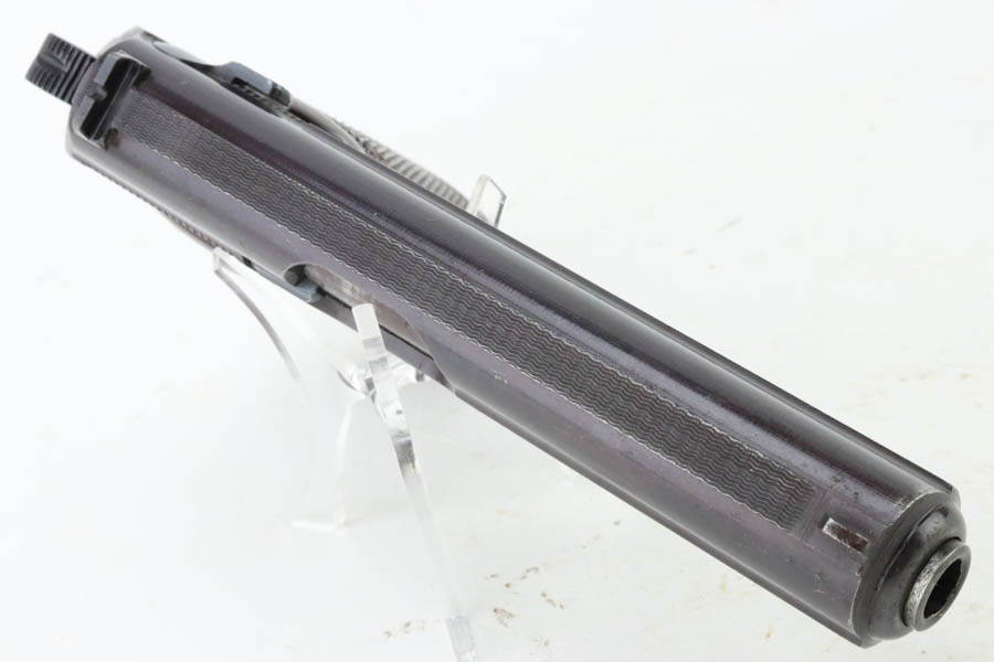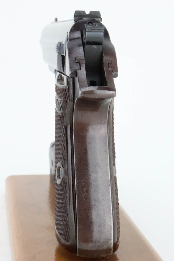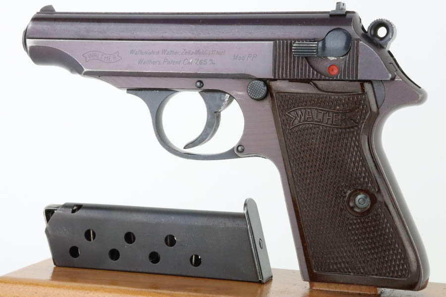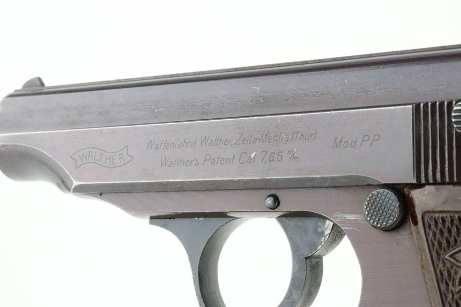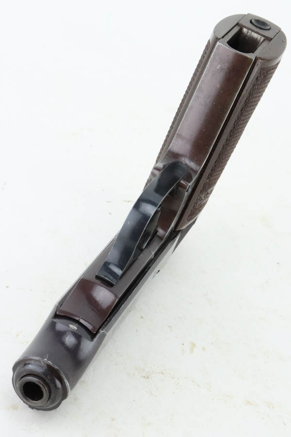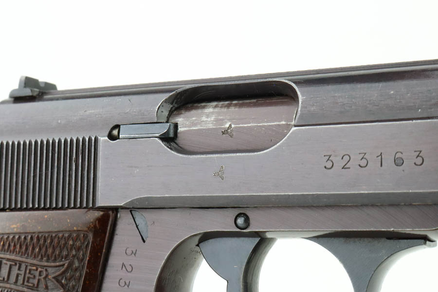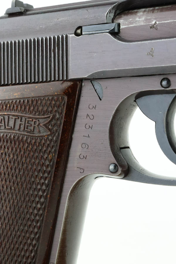6/28/24 – This is a near-mint Walther PP sold in the commercial market in 1943. All matching with the proper “Eagle N” proofs. This particular gun has a beautiful plum colored finish that pairs really well with its scarce reddish bakelite grips. It has retained about 97% of its bluing with just very minor high edge and muzzle wear. Comes with a period-correct wartime magazine. Mint bore.