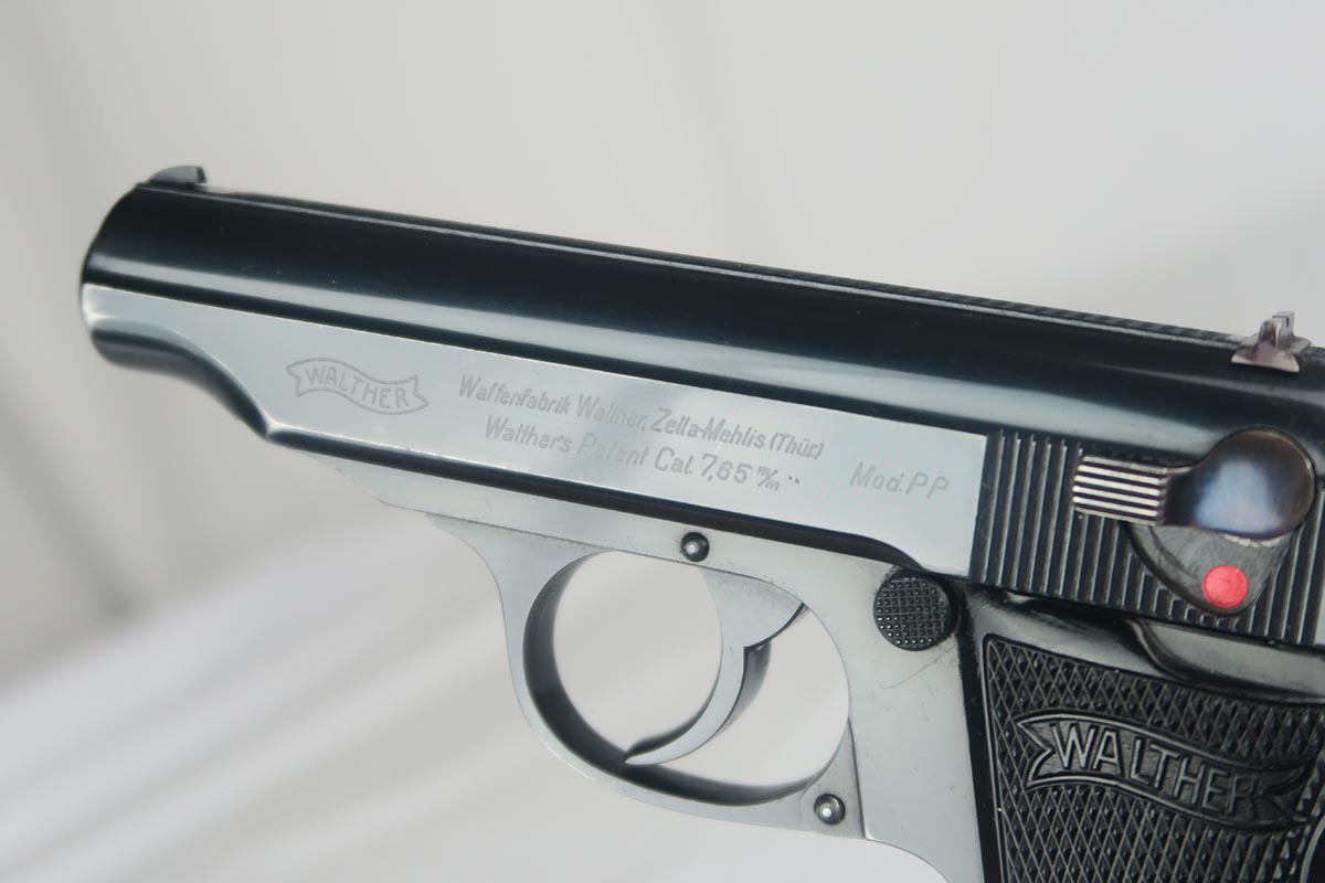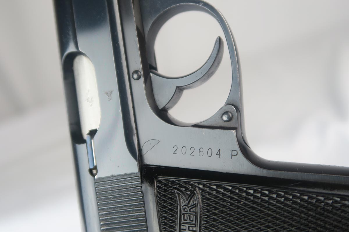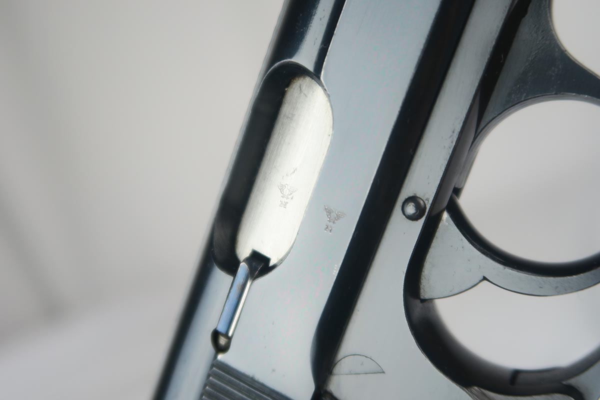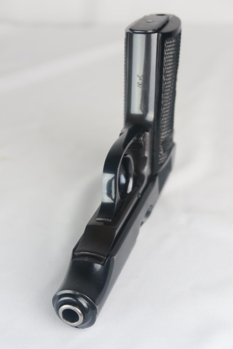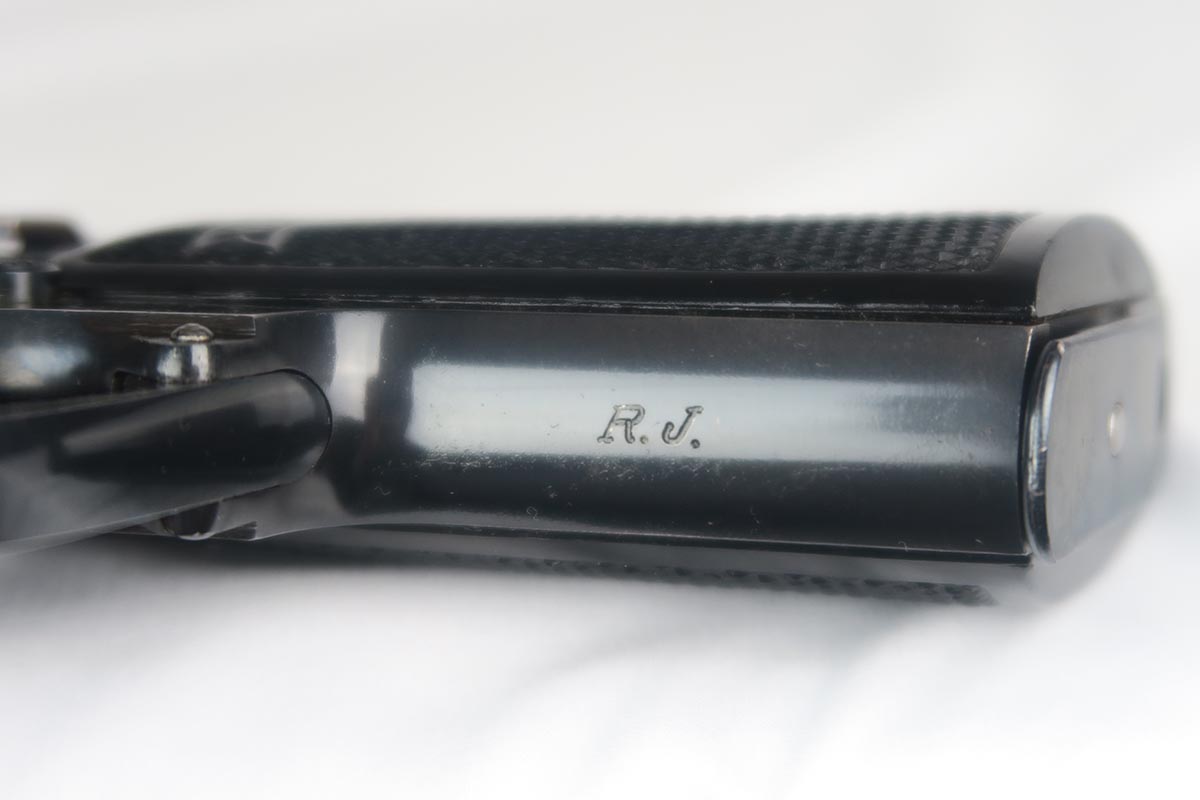 2/6/18 – This is a near-mint Walther PP, manufactured in 1940 with Eagle/N proofs.  The RJ on the front strap is the distinct characteristic and the marking is under the original bluing.  The original finish is about 98%, with some edge/muzzle wear on the slide, and some finish loss on the bottom of the back strap. Minty bore. It has the correct weighted grips and original magazine.  RJ PP’s were issued to the “Reichs Bureau of Justice”, or in other words, the courts, judges, guards, etc.   Probably rarely used other than annual “qualifying trials”.